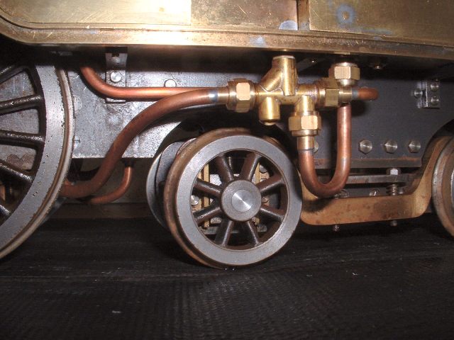 New check valves with O ring seat retained by a separate bottom fitting 05/11/07 I've fitted the 4oz and one of the 8oz injectors to Helen and given them a steam test. They both seem to work fairly well although one of the steam valves is leaking slightly and needs to be looked at. The new O ring check valves work fine with no leaks. The pipework for the injectors was a bit tricky (a real plumbers nightmare!) with quite a few bends to get around various bits and bobs. The worst ones were the steam pipes which are quite long and took a long time to get right. Left hand injector and pipework We went for a run at Whitwick yesterday and had a very good day. Now that the valve timing has been reset Helen runs very sweetly and pulls away easily and smoothly. My brother and I did about 15 laps before calling it a day. I need to check the speedo on the driving trolley again as the calibration still appears to be wrong. One lap of the track should be 0.24 miles but the speedo is reading 0.44 ! The 8oz injector was a bit temperimnetal and worked when it felt like it! The 4oz worked nearly all the time but would sometimes not pick up at full boiler pressure. It seemed to be happiest at about 75psi when it picked up every time and pumped with only a slight drip from the overflow. I did try running with it on all the time so as not to use the axle pumps but it actually tended to overfill the boiler and dropped the steam pressure eventually. Still, we are getting there! As mentioned in the injector pages, more work needs to be done on the injectors until they work as required. I also need to fit some very fine filters on the water supplies to prevent any debris reaching the injectors. Before this run I had also increased the spring tension on the front bogie (by stretching the old springs a bit!) and the front bogie seemed to behave itself and stayed on the track with no problems. It was interesting to note that another chap was there with a 5" Maisie which was also experiencing bogie problems. 16/02/2008 I can't believe it's over 3 months since I last updated these pages! How time flies. Poor old Helen must be feeling very neglected! Not much to report really, construction wise anyway. I took Helen to the New Years Day steam up at Whitwick and a good time was had by all. My brother and I ran Helen for maybe 3 hours non stop but were struggling to keep steam up towards the end. When I got home and cleaned her up I found a couple of fire tubes completely blocked and several others partly blocked which explains the reluctance to steam. The firebox tubeplate was nearly solid with ash! The lubricator was working really well (too well in fact) and was supplying far too much oil so that needs adjusting. The front bogie still derails every now and again so I'm going to have to get it sorted once and for all. I've thought of fitting a thicker washer inbetween the loco stretcher and the bogie stretcher which will lower the bogie frames and raise the axleboxes in the horns. This should allow the bogie wheels to drop more before they leave the rails and will increase the weight on the bogie as well. Strange that the problem is only with the front bogie - the rear one has never derailed yet! I'm not happy with the axle pumps as they don't seem to be able to keep up with the demand. I did a few calculations and designed a spreadsheet to calculate the pump output versus the water consumption and even at 100% cut off the pumps should be able to supply far more water than needed. I think I may have found the reason today. I was designing a twin ram water pump for Simplex this morning and had a look at the drawings for Helen's to remind myself how I'd done hers. I suddenly realised that owing to the way I had made the bottom fittings for the pumps, water could leak past the threads of the fittings back into the inlet pipes when the ram was on the pumping stroke. This wouldn't have been noticeable when I tested the pumps before fitting them but will be a major problem when pumping against boiler pressure. I reckon this leakage is causing the low output from the pumps. What I will have to do is seal the threads on the fittings so that this cannot happen. Fortunately the fittings are easy to get at and I can do the job without dismantling anything apart from unscrewing the fittings! I've still got to do a bit of finishing work on Helen such as dummy steam pipes and handrails etc but nothing major. I've purchased some handrail stanchions from the Association (didn't fancy making them!) but they look a bit 'chunky' to me so I might turn the bases down if I can. There's also a couple of improvements I want to carry out whilst the loco is stripped for painting. I've been looking at various colour schemes trying to decide what colour to paint Helen and I've more or less decided on a green of sorts. I came across some photos on Station Road Steam of a King Arthur class loco painted in dark olive green and that colour rather takes my fancy. I think with black and white lining it would look rather smart. I've been 'painting' an outline drawing using CAD and it looks ok. Still, there's time to change my mind yet! I'll probably give Helen another run or two and then get down to the painting - can't put it off much longer! The first 'local' 2½" gauge run of the season is at Whitwick in early May and then the National rally at Rugby is on June 8th so I want her finished before then. 21/02/2008 Yesterday I took out the bottom fittings of the axle pumps and carefully resealed the threads all the way along with the liquid PTFE to try and prevent any leakage. This was quite a tricky operation and care was needed to avoid getting the sealant where it wasn't wanted! After leaving it overnight to set I decided today to give Helen a run on the rolling road to see if there was any improvement in the boiler feed. There was a problem straight away as the inlet valve on the hand pump had stuck solid and I couldn't free it. This had happened be