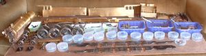 Well, poor old Helen is now just a pile of bits! It didn't take long to dismantle her but it was a messy job with everything covered in sticky steam oil. Disconnecting the steam pipe and blower inside the smokebox was a filthy job! It would have been better to have washed her down with paraffin or petrol first I suppose but I didn't have any to hand. A quick inspection showed that all the bearings, valve gear pivots, etc. seem to be in good condition but the cylinder steam pipes were a very loose fit in the steam manifold and have probably been leaking badly again which probably accounts for the steam oil all over the tops of the cylinders. The silicon O rings have gone very soft again and actually have bits missing. The Peek seals also look in a bit of a state and probably weren't doing a great deal. I am either going to have to bite the bullet and pay £10 each for some Kalrez O rings or, better still, redesign the manifold to use screw connections with copper seals. I rather favour the latter! I haven't stripped the cylinders yet to look at the O rings on the pistons but they seem to move ok with a slight resistance so hopefully they will be ok. The O rings on the axle pump rams do seem fairly loose in the bores which is no doubt why they were leaking slightly. I am not sure how good water is as a lubricant for silicon O rings. Perhaps it's not very good? Then again, the bores of the pumps were only reamed so perhaps the finish is not quite good enough for the O rings. It might be worth giving them a polish before re-assembling them. The next job is to clean everything down thoroughly and I think I'll get some paraffin and use that to get the worst off. I've got some POR 'Marine Clean' which is a very potent degreaser and I'll use that to finish off with. I've used it before and it's very good. The problem is that anything steel rusts immediately after you've used it! I've then got some POR 'Metal Ready' which is an anti rust treatment that dissolves any surface rust and etches the steel surface leaving it with a zinc phosphate coating ideal for painting. 02/04/08 Over a month since the last update! I don't seem to have achieved much in the workshop lately due to working in the garden and having a good clear out and reorganisation of the house. Poor old Helen has been really neglected. I really must get on with the painting though as it's now only about 6 weeks to the first official run of the year and I've done very little in that direction yet! Over the last week I have started looking at paint and have been trying out a few types to see if they will be suitable. The first job is to find a suitable etch primer for priming the brass parts of the loco before the top coat is applied. Brass is a very difficult metal (along with the other copper alloys, aluminium and galvanising) to get paint to stick to as it rapidly oxidises when exposed to the air and most paints will not stick to this oxide layer. A primer must be used that contains an acid. This acid eats through the oxide layer and forms a good bond to the metal. Etch primer comes in two forms - a single pack which can just be painted on as it is, and a two pack which has to be mixed together before it is applied. I am not sure of the difference between the one pack and the two pack but I decided to give a one pack variety a try as it seems easier to use. Note that a lot of these etch primers must be used with the special thinners supplied for them as ordinary thinners such as cellulose or white spirit will not work with them. There are many manufacturers of these etch primers but I decided to try U-Pol Acid #8 which is readily available in a 450ml aerosol from Halfords and car paint dealers. The idea of being able to use an aerosol appealed due to not having to clean out the air brush or spray gun every time it is used. This primer is also one recommended in Chris's excellent book. As suggested in the book, I tried painting a few test pieces first and sprayed a piece of brass sheet with the primer which went on easily and dried to a nice flat grey finish. As Chris mentions in the book though, it does go on quite thickly compared to using a spray gun and would tend to fill in any fine detail if you were not careful. The idea is to get as thin a layer on as possible whilst still looking wet. If the paint surface looks dry when you spray it, there's a good chance that the acid will not etch the surface and the primer will not stick. You also want to try and avoid having to sand the primer afterwards as there is a danger of rubbing it off any high spots leaving bare metal again. The instructions suggest that the primer dries in about 10 - 20 minutes but I left it for a couple of hours to be on the safe side. I then tried scratching it off the brass and I could only do this with a knife showing that it seemed to have adhered properly. I then tested it's temperature tolerance and 'cooked' it in the oven at 200°C for about an hour. It did go slightly brown in colour but seemed to be tougher than before and took even more effort to scrape it off. The only surfaces that are liable to get to that sort of temperature are the smokebox and the cylinders so I think this primer should be up to the job. Incidentally, the primer can also be used for all the steel surfaces as well which saves having to buy two different ones. The only concern I have about using the aerosol is that I think it will be pretty wasteful on small parts. However, it is also available in 1 litre cans for brushing or spraying on, but does not seem to be as readily available in this form. Fortunately I found someone on Ebay who sells it in tins at reasonable prices so I've ordered one from them. Hopefully I'll be able to use it in the airbush which will be better for the small bits and for getting into awkward corners on the frames etc. I've actually got two air brushes - a good quality one (Badger 175) and a cheapo one which I reckon is also made by Badger as the illustrat