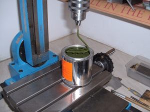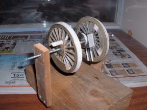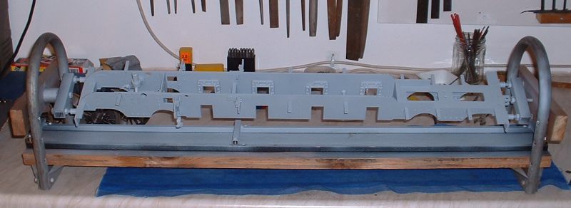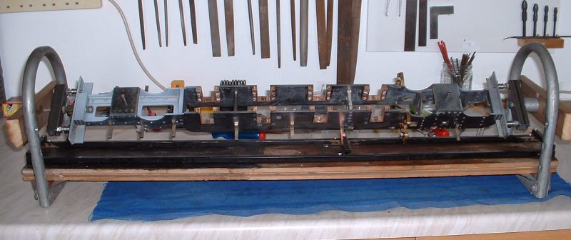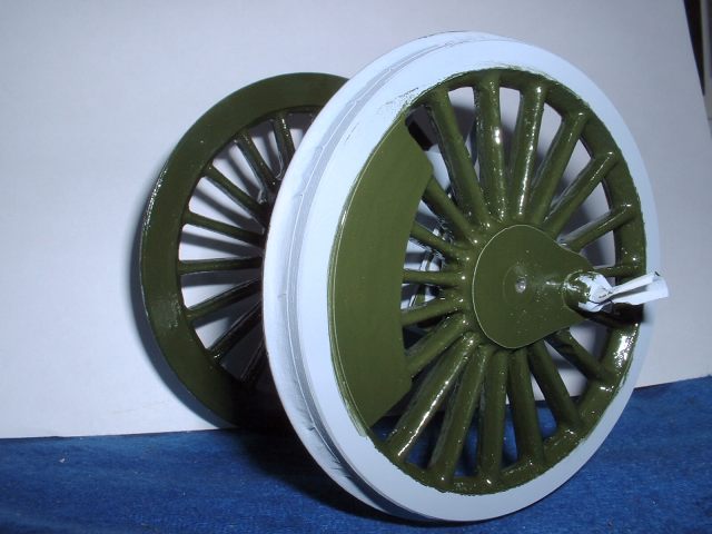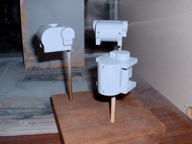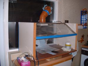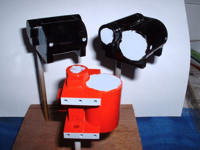 23 The primer is now sorted and the next problem is a paint that will stand the heat of the smokebox. What I want is a black paint that will give a semi-gloss finish and hopefully I can also use it for the outside of the frames and the cylinders. There are a number of possible paints for this job varying in their temperature range. Various manufacturers make very high temperature paints for car exhausts, barbeques, cast iron stoves etc. but a lot of them are not very black, more a grey colour. One possibility I've looked at is high temperature enamel designed to paint car engines with and it just so happens Halfords sell a range of this which is supposed to withstand 300°C. They do a satin black version so I bought a tin to try it out. It can be sprayed if thinned down with white spirit but initially I just brushed it on. Using the piece of brass I had previously etch primed I covered a third of it with the satin black and let it dry naturally for a couple of hours. The finish was about the right semi-gloss I was after so into the oven it went and 'baked' at about 250°C for an hour. After this the paint was still pretty tough with no signs of flaking but it had dulled down quite a lot and now looked matt rather than satin. Hmmm. Halfords also do a gloss black version so I had the bright idea of mixing the gloss and the satin 50/50 to see what happened. Off to halfords again ( they are only a mile or so down the road) and returned with a tin of the gloss. Another third of the test piece was then painted with a mixture and the heat treatment repeated. Although the unheated paint looked fine, after heating it had actually turned grey so perhaps the two paints are not compatible? Out of curiousity I painted the last third of the test piece with the straight gloss and after the obligatory heat treatment it actually looks perfect! A nice dull gloss which should look the part. If I do decide to go ahead with this paint and use it for the frames as well, I may cook the frames in the oven to produce the required level of gloss. The smokebox will probably sort it's self out after a few steamings! I believe that Precision Paints suggest painting a smokebox with their gloss black enamel which will then dull down when the loco is steamed. I do know some-one who has done that but I have my doubts whether ordinary enamel will stand the heat on Helen's smokebox as she runs very hot when working hard. The high temperature enamel is also available in gloss red which I may use for inside the frames and the boiler fittings in the cab. The front section of the frames get pretty hot due to the three cylinders which run at well over 150°C. For the top coat of olive green I've eventually gone for Precision Paints enamel alhough my initial idea was to try and find a paint from elsewhere which may have worked out cheaper. However, looking around, it would seem that the minimum quantity you can buy from most car paint suppliers is 1 litre which will be far more than I need and I had visions of most of the paint going to waste. I did actually buy a spray can of the Halfords acrylic car enamel to try and it went on very well. Unfortunately, although the finish was pretty tough when cold, it went very soft when heated to 150°C and was very easily damaged. You may have realised by now that I'm trying to source suitable paints from local suppliers rather than have to track down specialist ones. In the small quantities I need for Helen I don't think it's worth the time and trouble but probably would be for a larger loco. Anyway, I seem to have sorted the paint out so the next job is to devise some sort of spray booth to do the painting in. I'm not very impressed with the usual small open fronted ones that many people seem to construct which have a fan in the top or side to extract the paint fumes. Although they may be fine for extracting the paint and fumes, they will also pull all the dirt and dust from the air into the booth and no doubt deposit it all over the nice wet paint! Another alternative is the much larger booth that you actually stand inside with a fan to blow in filtered air and an outlet for the paint and fumes to escape. I don't really fancy making one of those as I haven't really got the room for one that big. I haven't got a garage or suitable shed to put it in anyway. One thought is to make a smaller sealed booth with arm holes in the front so that you stand outside but have your arms inside to operate the airbrush etc. This design appeals to me but the problem will be to seal the arm holes and still allow plenty of freedom to move your arms from side to side when spraying. Watch this space! 10/04/08 I've now cobbled up a sort of spray booth using whatever materials I had to hand. I've not made it completely sealed yet and will try it as it is first. The base is a 3' x 2' piece of MDF and the ends are two scrap doors of a kitchen unit! Another piece of MDF forms the top which has a hole cut in the centre to take a 4 inch ceiling fan such as fitted in bathrooms etc. That was also salvaged from a job I did for some-one earlier in the year. The back and sloping front are made from a thick clear plastic film that I had lying around. The booth sits on one of the kitchen worktops in front of one of the windows which just happens to have an old extractor fan fitted (one of those self powered ones that is supposed to suck out when the wind blows it round but doesn't!). I removed the window fan and the exhaust from the fan in the booth exits through the hole in the glass via bits of pipe and a couple of elbows normally used for drains. The improvised spray cabinet The front of the cabinet is open at the moment which makes access for spraying easy but may also allow dust etc to get inside onto the parts being sprayed. I can always seal the front somehow if this becomes a problem. The extractor fan seems to be adequate and does remove most of the fumes and overspray but could with advantage be a bit more powe