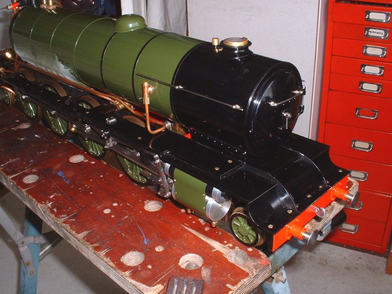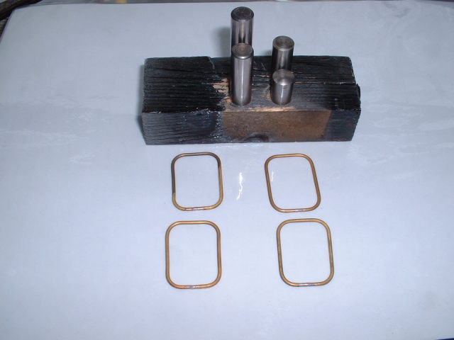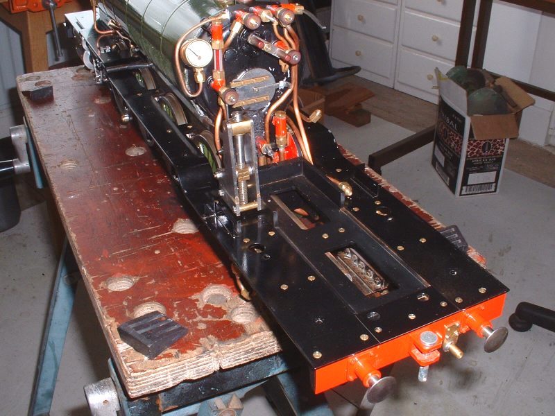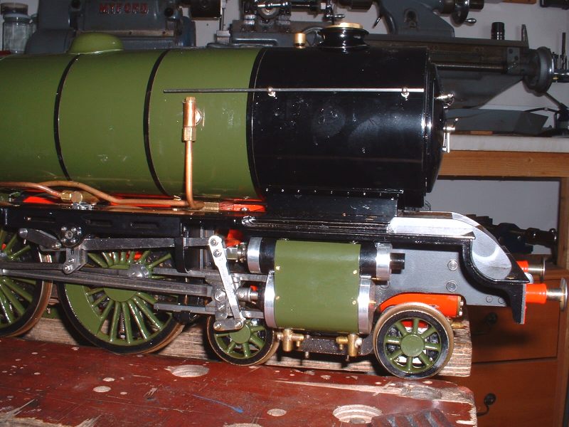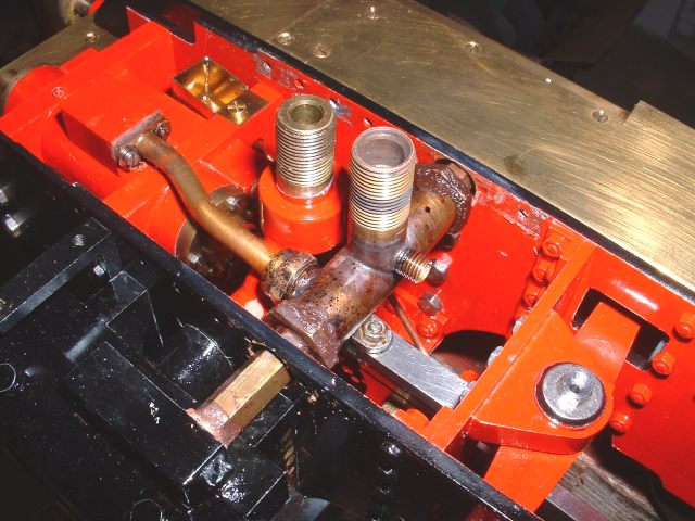 In the end I decided to use two thin rings side by side with a simple vertical gap in each. The gaps would be placed at 180° to each other so that leakage through the gaps would be negligible. The rings were simply turned from some 1 inch diameter PTFE rod. The inside of the rod was drilled and bored out to a diameter 0.015" larger than the diameter of the bottom of the groove in the piston and the outside of the bar turned to a diameter 0.01" greater than the bore of the cylinder so that the rings would be slightly oversize. The rings were then parted off to a thickness such that when two of them were side by side in the piston groove, there was a 0.005" side clearance in the groove. The rings were then cut with a sharp knife and a section removed so that when the rings were fitted in the cylinder bore, the ring gap was 0.01". These clearances (to allow for expansion) were all 'guesstimates' and only a trial run will show if they are enough to prevent the rings seizing. Turning the PTFE bar to size for the rings The finished rings Rings fitted with staggered gaps to prevent leakage The cylinders could now be rebuilt and fitted to the frames but first I had to make the new steam connections and turn up the aluminium covers for the cylinder and valve chest end covers. The aluminium covers were fairly simple, although fiddly, turning jobs from bar. The sides and ends of the covers are only 0.02" thick so a bit of care was needed not to damage them by taking over enthusiastic cuts! The really fiddly ones were the ones that go on the rear cylinder covers as they have to be bored out to fit over the cylinder cover boss and also have recesses filed in them to clear the slide bars. By the time I had done this there was not a lot of cover left! Both valve chest covers and the rear cylinder cover are a push fit and should hold themselves in place (if not, a bit of Loctite will secure them!). The front cylinder covers are held on by a central nut on a stud tapped into the main end cover. Next job was to alter the steam pipes from the mainfold to the outside cylinders to threaded connections. To avoid making a new manifold I tapped the ends 3/8" x 40 ME and turned up some new stubs to connect to the cylinders. These are threaded 3/8" x 40 at the manifold end and 1/4" x 40 at the cylinder end as were the originals. To assemble the pipes and manifold, the stubs are screwed right into the manifold, the manifold fitted between the frames, and then the stubs are unscrewed until they reach the cylinders when the ends are screwed into the cylinder inlet blocks. The idea is pretty much the same as used on many loco designs. To lock the stubs in place and stop them working loose in use, I also fitted some thin 3/8" x 40 nuts on the manifold end of the stubs. The photo below shows the fitted assembly. The threads were liberally coated with the Rocol OilSeal before assembly to hopefully seal them. The original PTFE 'olive' on the connection to the middle cylinder was changed to a copper one at the same time, better to withstand the heat. New steam pipes threaded into the manifold The above photo was taken after a test run, hence the 'cooked' appearance of the sealant! Also visible in the top left of the photo is a little brass oil tank which feeds oil to the middle crosshead and slide bars via a 1/16" copper pipe. This is accessable by removing the front cover between the frames and can be filled up before a run. Before refitting the lubricator (I decided to stick with the original for the time being) I changed the return springs on the pump rams to slightly softer ones as the originals were quite stiff and the lubricator needed quite a bit of effort to drive it. I also shortened the rams by about 1/32" in an effort to reduce the output which had still proved to be excessive at the last run before stripdown. After refitting all the valve gear etc I gave the completed chassis a run on air and it ran very nicely and smoothly on about 10psi. The exhaust beats still sounded pretty even so I chose not to try retiming the valve gear.The valves hadn't been moved on the valve spindles so the timing shouldn't have altered anyway. At this point I decided to hurriedly put the rest of the loco back together for a trial run and took Helen to the 2½" gauge invitation day at the club on May 17th. I really wanted to test the chassis before going any further with the painting in case anything needed attention. I was also getting withdrawal symptoms as I hadn't driven her for so long! 16/06/2008 The run proved to be a fairly short one as after the first lap it became apparent that the lubricator was supplying little, if any, oil to the cylinders and the loco was very 'tight'. I did another couple of laps to see if things would improve but they didn't so I gave up for the day rather than risk any damage to the valves etc. The next day I looked at the lubricator and the problem was immediately apparent - the new springs I had fitted were too short and the rams were not returning to the top of the stroke which meant they were not uncovering the inlet ports and allowing oil into the bores. This was soon sorted by fitting longer springs and we had another test run the following Sunday. The weather was absolutely awful with heavy rain but I managed about 8 laps before I called it a day. Helen seemed to run very well and seemed to coast with the regulator shut much better than before and I put this down to the new PTFE rings with their reduced friction. There was no sign of any leakage past the pistons and no tightness so it looks as though the rings are a success. Time will tell though! Now I was happy that the chassis was running ok it was time to make a start on painting the boiler. The first job was to correct a small fault on the cleading. It didn't fit as well as I would have liked around the joint with the smokebox and when the boiler band was fitted, the band was slightly proud of the smokebox barrel at the top, rather than