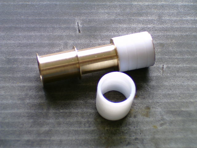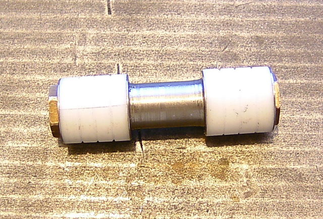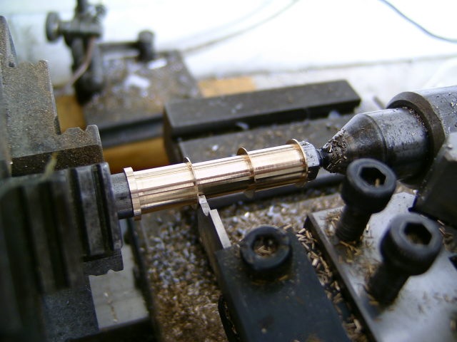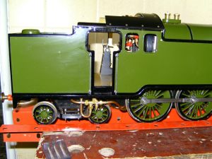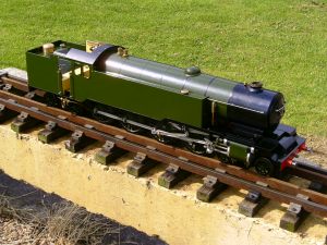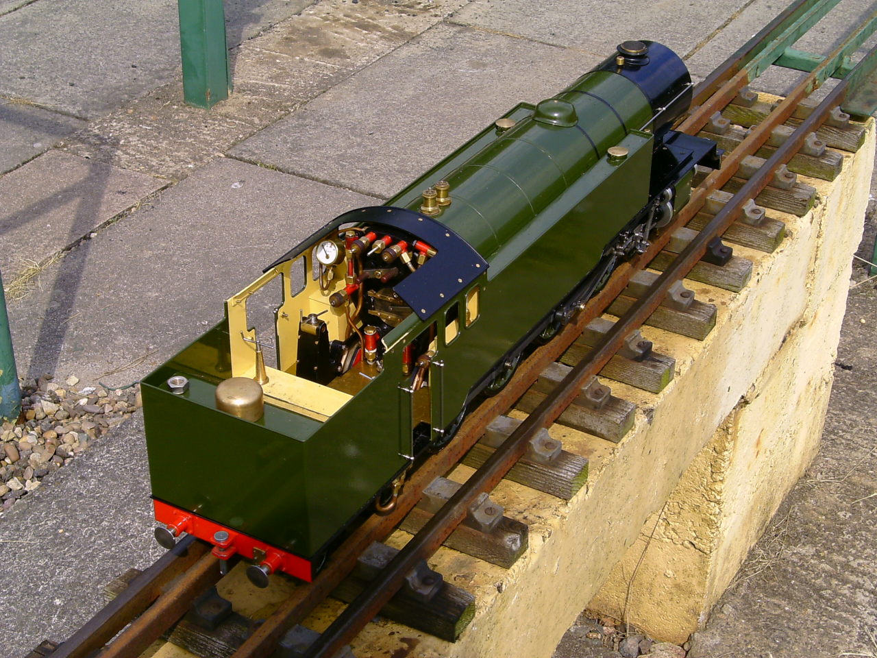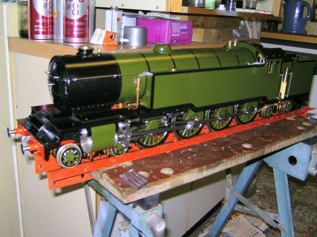 25 09/08/2008 Updates seem to be getting few and far between! I've done some more painting and the tanks and rear bunker are now green as well! I was unsure as to what colour to paint the inside of the cab as photos of the cabs of full size southern locos seem hard to find. Gerald from the Association very kindly sent me a booklet about Stowe, the Schools class loco which did contain one photo of the cab interior. It appeared to be a sort of orange yellow so on another trip to Halfords I had a look at the car spray paint and found a colour, not quite the same but one I thought would do. The interior of the cab and the underside of the cab roof were then painted using this. While I was at it, I sprayed the outside of the cab roof with some of the Halfords satin black which looks quite nice. Once again the loco was quickly assembled for another running day at the club (no wonder the painting is taking so long!) and I took a few photos before she got dirty again! Still plenty to do but getting there slowly! After giving her another run I noticed that she was still getting very stiff to move after a while and was not running well at all. I suspected that the modified lubricator was still not working properly and she was still short of oil. Over the next couple of days I did some running at home on the rolling road to see if I could find the problem. Despite my earlier fears, the lubricator was actually pumping plenty of oil but she was still getting very stiff after only a short run and making a distinct 'squeaking noise' from the inside cylinder and the right hand cylinder. I started to suspect the valves and decided to take the centre one out and have a look. When it was taken out it was seen to be quite badly scored and had obviously been running very tight in the bore. When the right hand valve was removed it was in the same condition. This was obviously the problem. The valves, being directly exposed to the incoming steam, were getting hotter than the valve chest and expanding more, causing them to become very tight. What to do! I decided to do what I had been thinking of for some time now and have another go with PTFE. There have been a few articles on making PTFE valves in Model Engineer over the years and they seem to have been used with some success. It was obvious from my earlier experiments with the solid PEEK valves that this was not a satisfactory method of making the valves. The solid bobbins expand far too much and just seize solid unless they are made a loose fit when cold. They then leak until they get to working temperature. Other model engineers have had success fitting solid PTFE rings onto a metal bobbin, some fit split rings with an O ring underneath to help press the rings onto the inside of the valve bore. The idea is that as the PTFE ring expands with the heat, it makes a perfect steam tight seal against the bore but the natural low friction property of PTFE ensures that it will not seize solid. My concern was that Helens valves are much longer than normal types (due to the double porting) so the PTFE ring would have to be nearly half an inch long. Would the PTFE still seize in the bore as it expanded? I eventually decided on a fairly simple way to do it which may or may not work. I decided to turn down the original stainless steel valves and fit a thin PTFE sleeve to the outside to form the actual valve head. I didn't have much time to do this as the Rally at Sutton Coldfield MES was only a couple of days away! I decided to have a go with the middle cylinder valve first to see if my idea would work or not. This cylinder runs hotter than the two outside ones so would be a good test. Each head of the valve was turned down in the middle, just leaving a thin flange at each end to retain the PTFE sleeve, bit like a cotton reel. The sleeves were then turned from 1/2" solid PTFE bar. The bar was drilled so that the centre hole was 0.01" larger in diameter than the reduced diameter of the valve head and then the outside diameter turned down until it was very slightly larger than the inside diameter of the valve bore. The idea is that the finished sleeve can just be pushed into the valve bore by hand and the clearance between the inside of the sleeve and the bobbin gives the PTFE somewhere to go when it expands! The sleeves were then parted off and carefully faced to length (by pushing them onto a suitable mandrel) so that they would just fit between the end flanges of the valve heads. For good measure I turned a few shallow oil grooves in each sleeve to help the lubrication. The sleeves were then slit lengthways with a sharp knife so that they could be opened out and fitted onto the valve heads. This will not be ideal as the thin flanges left on the ends of the valve heads will not seal against the bore and the valve timing will be controlled by the PTFE sleeve which will actually be too short to give the correct valve events. It'll be close enough to prove whether the valves will work or not though! Original stainless valve bobbin fitted with PTFE sleeves The modified valve was liberally coated with steam oil and fitted back into the cylinder. It was a bit of a struggle as the sleeves were quite a tight fit. I had made a note of the position of the valve on the valve spindle before I removed the valve so that I would not have to redo the timing!. Back to the rolling road and a quick steam test. Despite my fears, the valve didn't seize at all although you could tell it got a little tight when very hot. So far so good! Another major concern had been that as the sleeves had to be split to fit them,the ends of the thin sleeve may spring out and jam in the ports. This didn't happen either. Encouraged by the results so far, I modified the other two valves as well. Another steam test on the rolling road and what a difference! No signs of any seizing, no leakage of steam past the valves at all, and the exhaust was really sharp and crisp. She sounded like a completely different loc