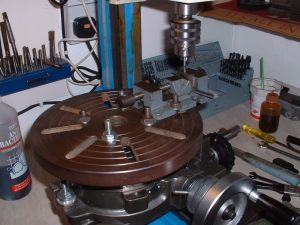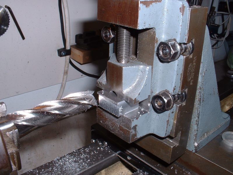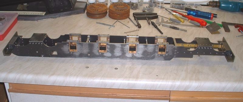 Homemade countersink bit with pilot pin The hornstays were made next from 1/2" x 1/8" steel. They actually need to be 7/16" wide so the width was reduced by endmilling in the lathe. When doing repetitive jobs like this it's useful and time saving to set up a little production line process. LBSC was always describing ways of doing this in his articles. For instance, if you can provide a positive and repeatable method of positioning the components then it's a simple matter to machine them all to the same size using the micrometer dials on the machine used. For example, I roughly cut all eight hornstays to length with a hacksaw then milled one end of each square in the lathe using the vertical slide. I then turned the stay around with the milled end against a stop and milled the other end to length using the leadscrew to advance the cut. The micrometer reading was noted and the other seven milled to the same setting. The same procedure was used to reduce the width. One stay was then marked out for the fixing bolts and spring pins and the holes drilled. This was then used as a jig to drill the other seven. The hornstays were then clamped in position on the bottom of the horns and the bolt holes spotted through into the horn. The horns were then drilled and tapped 6BA for the fixing bolts. Thus, only one set of holes had to be marked out instead of 16 ( 8 stays and 8 horns ) and all components and hole positions are exactly the same. Frames with hornstays fitted The axleboxes are simple milling jobs from 1" x 1/2" mild steel bar. They were milled to fit the horns by clamping them in the machine vice on the vertical slide. Care was taken to make sure the bottom of the slot in the vice was square to the lathe axis and the jaws perfectly horizontal. It was then just a case of clamping each blank in the vice with the rear edge hard up against the bottom of the slot and the width reduced to leave a 1/16" thick flange. One side of all eight axleboxes were machined at the same setting and then the axleboxes turned around to machine the otherside. Each axlebox was carefully fitted to it's horn as there were slight differences in the width of the horn slots. Milling the sides of the axleboxes To drill and bore the axleboxes to take the bearing housings, they were soldered together in pairs using Carrs 188 solder paint. Drilling both together like this ensured the axles would be square across the frames and not end up at an angle.