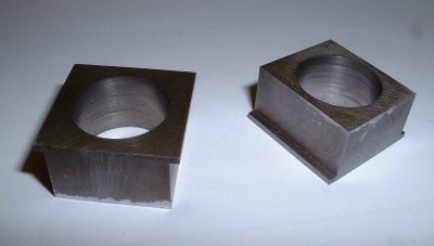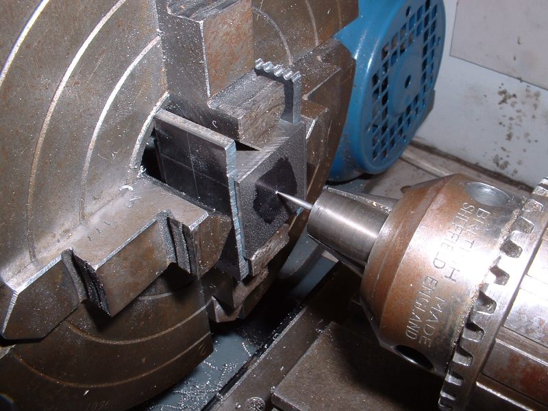 A pair of axleboxes soldered together One face of the 'block' was carefully marked out to find the centre and lightly centre popped. It was then mounted in the 4 jaw and adjusted until the centre pop ran true using a point held in the drill chuck. Centreing the axlebox for drilling The boxes were then drilled out in stages to the largest drill size I have ( 1/2" ) and finally bored to take the bearing tubes. The bores were made an easy fit on the tubes as they will finally be secured with Loctite. I had a few problems with the second pair coming apart a couple of times when I drilled them, probably due to being a bit heavy handed with the drill, but the rest were fine. The solder used is not very strong so the joint is easily parted if you are not careful.