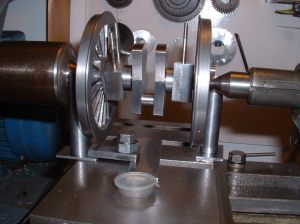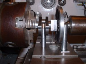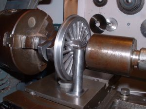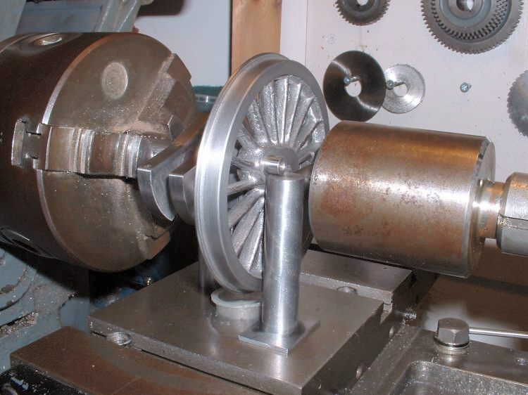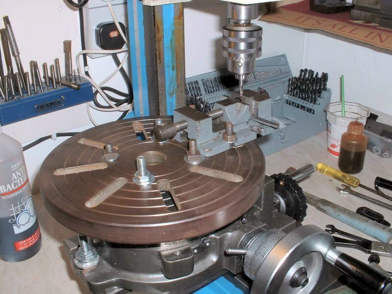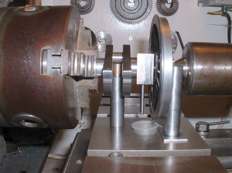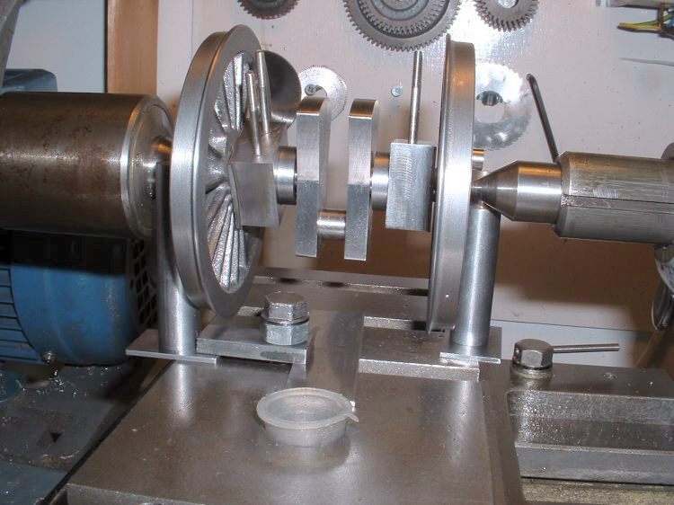 Next job on the axleboxes was to radius the inside of the flanges to allow the boxes to tilt when running on an uneven track. I decided to do this by milling in the micro mill using the rotary table. The problem was to get a large enough radius using the rotary table which was only 6" diameter. I eventually managed this by bolting the 9" faceplate from the lathe onto the rotary table and then bolting the Myford machine vice onto the edge of the faceplate. This gave me a radius of about 4-1/2" which was sufficient. Not the most rigid of setups but by taking light cuts the job was done ok. There is not much metal to remove anyway. Setup for radiusing the axlebox flanges The holes for the axlebox spring pins were spotted through from the hornstays and drilled and tapped 7BA to take the 3/32" dia. pins. These were made from stainless steel but unfortunately I only had enough to make 8 of the 16 pins so the rest will have to wait until further stocks arrive. I decided to complete the assembly of the leading axle at this point as this would be the most complicated of the four. The two short bearing housings were glued into their hornblocks using Loctite and the oil/dust seals ( simple O rings ) put in place. I had already decided to fit the wheels to the axles with Loctite rather than use a press fit so the crank axle wheel seats were reduced slightly in diameter to an easy push fit in the wheels. I also decided to remove the centre part of the axle ( left in while the crank axle was assembled ) now rather than after the wheels had been fitted. Next job was fitting the wheels and getting the quartering ( thirding? ) correct. I used the same method as for the Flying Scotsman i.e. mounting the axle between centres and using accurate pillars to set the height of the crankpins. I draw the layout of the crankpins in AutoCad and calculated the height the pillars would need to be above the top of the cross slide. As it happens, I was able to use the pillars I had made for the Scotsman as the crankpins are the same diameter. All I had to do was extend the pillars for the outer crankpins by exactly 1/16". The main difference is that for Helen all three angles are 120 degrees as the middle cylinder is in line with the motion centreline instead of being at an angle as in the Scotsman. At the end of the day it's not that important to get the angles exactly 120 degrees and a degree or two either way won't make any difference. The important thing is that all the outer crankpins are set to exactly the same angle. If not, you will never get the coupling rods to fit without binding unless you give the bushes excessive clearance. It is important to get the order of the crankpins correct when using the Gresley conjugated valve gear as the motion for the middle valve is derived from the two outer ones. When going forward, the RH crankpin should lead, followed by the LH, then the middle. Looking at the details for the original Helen, the order is RH, Middle, then LH, but she uses a seperate set of valve gear for the middle cylinder so there's no problem there. Firstly the RH wheel was fitted to the crank axle with a pillar under the centre crankpin and one under the RH wheel crank pin. The LH wheel was then fitted using pillars under the two outside pins. The only problem was that the topslide is only just wide enough to take the pillars for the outside cranks. Setting the centre crankpin relative to the RH wheel Setting the LH wheel to the RH wheel The only things to be careful of when using Loctite is not to hang about too long putting everything together ( the smaller the gaps, the faster it goes off ) and make sure you don't get any in the axleboxes! If you glue the axleboxes to the axles. you'll have to heat everything to 250 degrees C to get it apart again! One axle down, 3 to go! The next few days were spent cleaning up the remaining six wheels with needle files so that the other axle assemblies could be completed. The flash on the wheel spokes caused by the molten iron running along the joint of the two part mold used was very bad and took quite a few hours to remove. I recently picked up a set of six driving and coupled wheel castings off Ebay which turned out to be original Dave Goodwin castings for Black Five ( although I didn't know what they were until they arrived! ) and they were much better quality with no flash at all. Pity I didn't get them sooner as I could have used them instead. I can always build a Black Five I suppose! In between fettling the wheel castings I was thinking about how I would construct the cylinders and spent a few hours on the computer trying different designs ( whilst the blisters from all that filing subsided! ). I had already decided to use piston valves and as no suitable castings were available, the cylinders were to be built up from seperate parts. I had earlier obtained a length of 1-1/2" dia. x 3/4" bore cored gunmetal bar for the cylinders and some 3/4" dia. gunmetal bar for the valve chests. The idea is to roughly machine the cylinder and valve chests and then silver solder them together along with mounting lugs and an external exhaust manifold. At a pinch I could probably have used the piston valve cylinders from Black Five for the outside cylinders but I wasn't sure how big I could take the bores out to with those. I would still have to fabricate the inside cylinder anyway. I did not fancy turning seperate liners for the piston valves and wanted to use the much simpler LBSC design where the ports are turned directly into the wall of the valve chest using an internal boring tool. I drew this design out at first but wasn't too happy with the small bearing surface this gives between the valve and the bore and I can see that wear would be fairly rapid if the lubrication was not 100%. Using a seperate liner increases the bearing area somewhat due to the ports being a circle of square holes with lands inbetween rather than an open ring. My thoughts turned to the design w