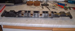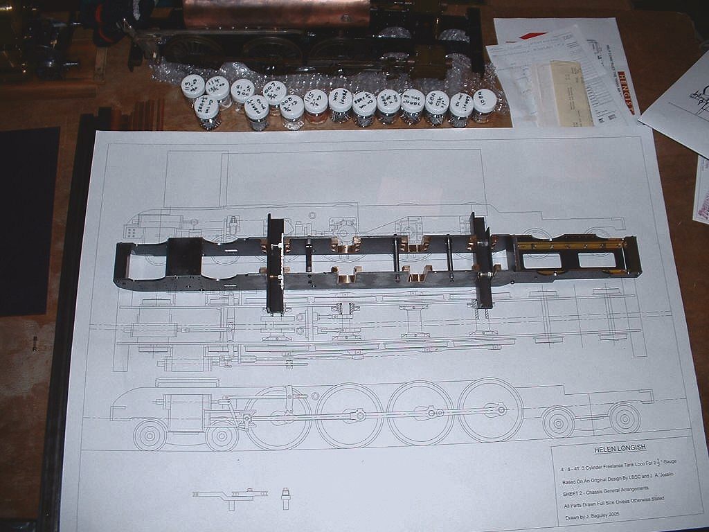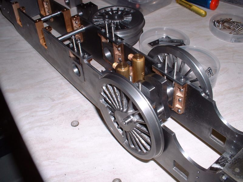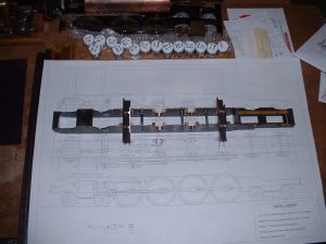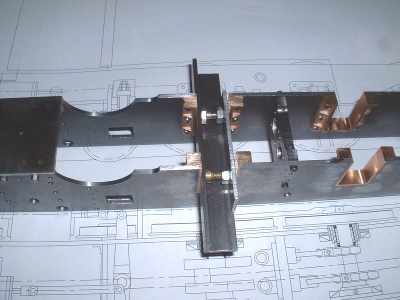 3 The two rectangular holes for the conjugated valve gear arms were cut out by chain drilling and filing to size. For appearance sake I also reduced the thickness of the frames to 1/16" where they protrude through the running boards at the front of the engine. I could now think about assembling the frames, hopefully once and for all. To help keep everything nice and square I cut two pieces of steel angle and wedged them inside the front and rear horns using nuts and bolts with some packing to avoid damaging the soft gunmetal. Unscrewing the nut and bolt forced the angle against the machined face of the horns and ensured that both sides were perfectly in line. All the stretchers were fitted but the fixing bolts were left loose for the time being. Incidently, I don't drill and tap all the bolt holes in the stretchers straight away, just two each side, then if any adjustments to the hole positions are needed, it's easy to draw over the holes in the frames with a needle file. The holes for the remaining bolts are drilled and tapped in situ when the frames are completely assembled and I'm satisfied that everything is ok. Using angle to line up the horns Starting with the front buffer beam block, the bolts were tightened and the alignment of the horns checked with a square to make sure the frames remained square. I then worked towards the back of the frames, tightening the stretcher bolts one by one and repeatably checking the alignment. All was well until I reached the vertical stretcher behind the trailing axle. Tightening this stretcher caused the frame to twist slightly. This was found to be caused by one of the fixing holes being slightly out but was soon remedied by elongating the frame hole slightly. One of the fixing holes for the long horizontal stretcher was also slightly out of line. After all this I finally had a set of frames that appeared to be square and true and everything went much easier than I had expected. All that remains now is to drill and tap the remaining holes and fit the proper bolts and screws instead of the temporary ones used. I save all the old tatty screws and bolts for inital assembly as usually things have to be taken apart several times. This saves damaging brand new bolts etc. Assembled frames Quite a bit of time was taken drilling and tapping the remaining holes in the stretchers. Any fixings which would come behind the wheels were done with countersink head crews to avoid bolt heads fouling the wheels. I made up a little countersink tool from 3/16" inch diameter silver steel to make a slightly recessed countersink for the 6BA screws. This was made with a little pin on the end the same diameter as the clearing hole and this 'pilot' ensured that the countersink was truly concentric to the hole.