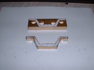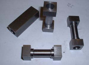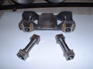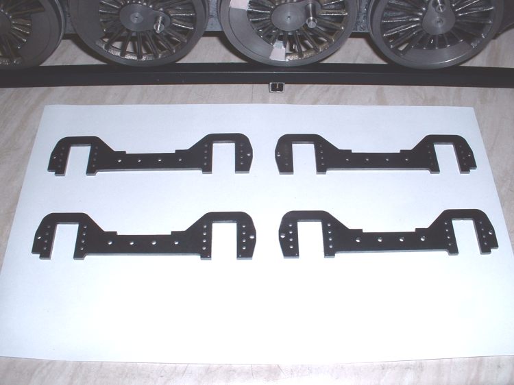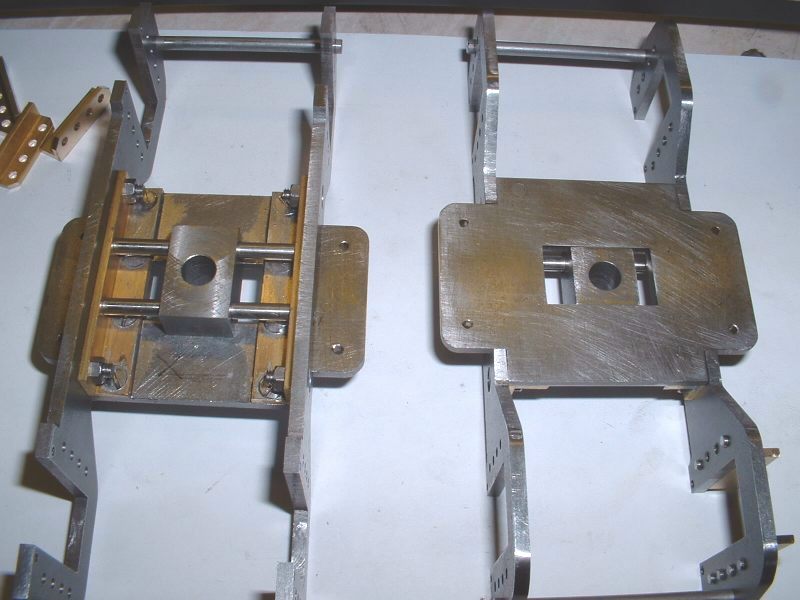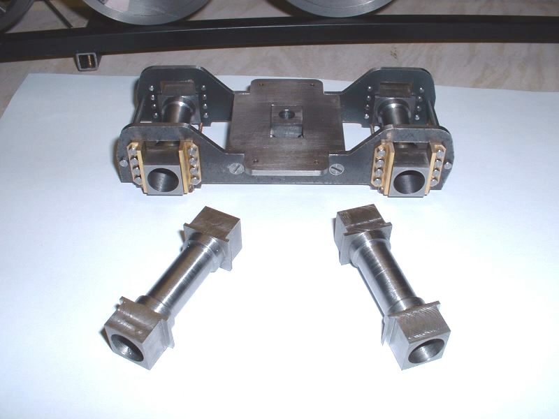 The finished bogie frames after seperation The bogie centres were cut from 3/32" steel, again by rivetting both together while they were machined. Each has a rectangular slot milled in the centre to take a block which slides from side to side in the slot thus allowing the bogie to move sideways on curves as well as pivot. The usual brass angle was used to fasten the centres to the frames after maching it square as before. It really is a pain that the brass angle has to be machined square before you can use it! A simple round stretcher ties the ends of the bogie frames together. I decided to fit side control springs after all as I am sure they will help the loco to negotiate curves. Two 1/8" dia. rods are mounted between the bogie frames and pass through clearance holes in the sliding block. Four springs will fit on these rods between the frames and the block and control the movement of the block. I think a bit of trial and error will be needed to get the right strength for these springs when the loco is ready for running. My assumption is that the bogie is designed to 'steer' the loco into the curves and it can only do this if the centre of the bogie can exert a force against the front of the loco frames i.e. through the side control springs. If the bogie is just free to slide from side to side without any restraint I can't see it doing a great deal except carry the weight of the front of the chassis. Perhaps there is normally enough friction between the bogie mounting stretcher and the bogie centre to have some effect? Seperate horn cheeks were machined up from 1/4" brass angle and as 16 of these were needed, another production line job was set up. These are bolted to the frames with four 8BA bolts each. The bogie pivot pins were turned up from 1/4" dia. bar and two 1-1/4"dia. by 3/32" thick washers sliced off some brass bar to act as spacers between the bogie centres and stretchers. I think it will be a long time before I tackle another 4-8-4 loco as there is so much repetition work involved! I've picked up a set of plans for the 4-8-4 4-8-4 Beyer Garratt loco but I don't think I could stand making two more 4-8-4 chassis's! Part built bogies with side control spring pins The axleboxes were machined in one piece from 3/4" square mild steel although it would have probably been easier to build them up as for the main axleboxes. Four lengths were cut and faced to length, drilled through a clearance size for the 8mm axles and then bored out each end to take the needle roller bearings. The centre section of each was then turned down for appearance sake although this was necessary for the front bogie axles in order to clear the middle cylinder and associated motion work. The remaining square sections at each end were then milled to fit the bogie horns, each axlebox being 'fitted' to its own horns. Part machined bogie axleboxes