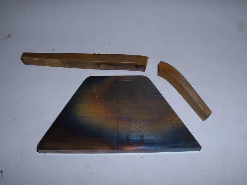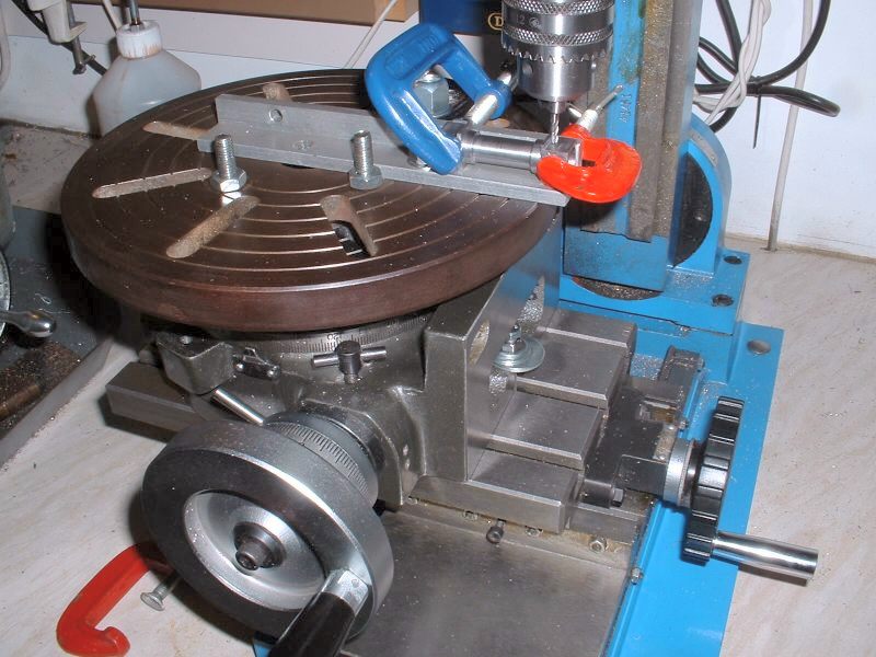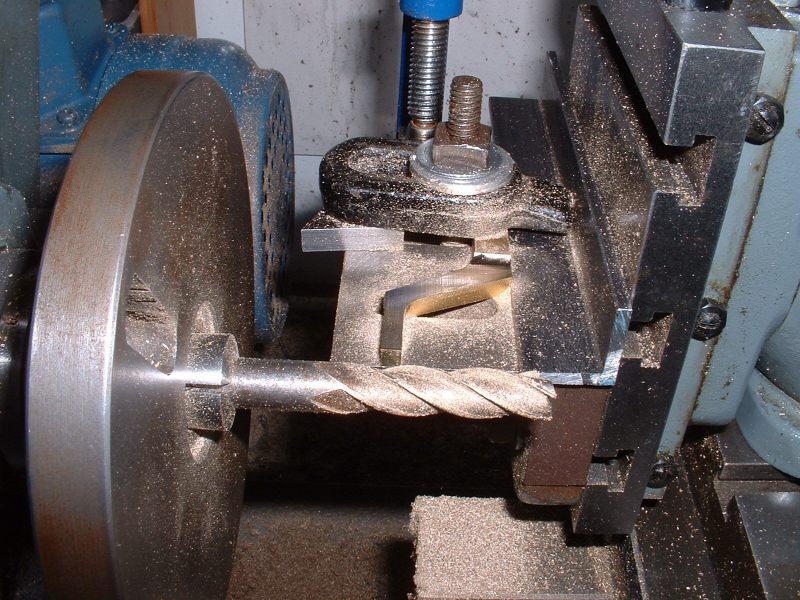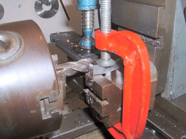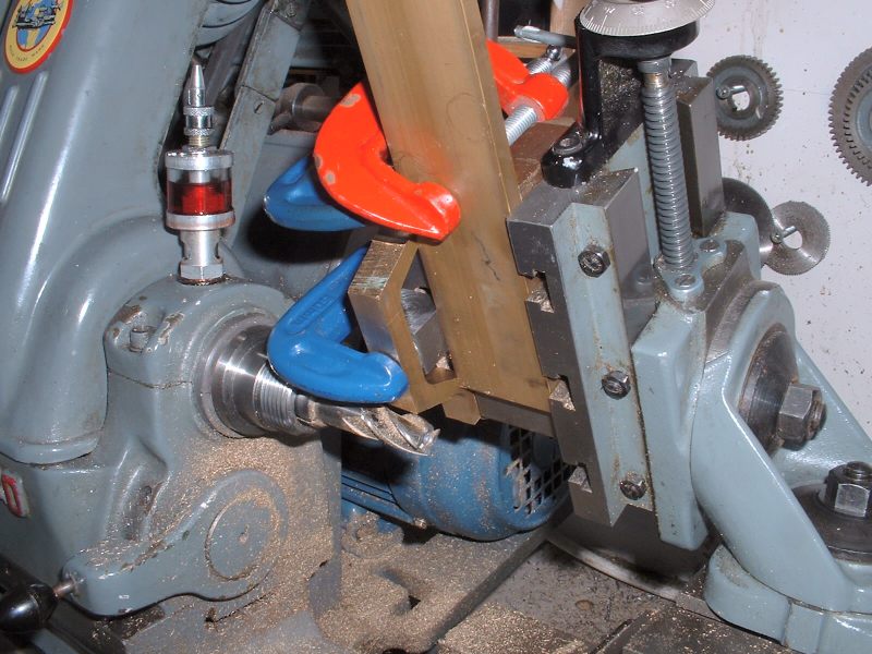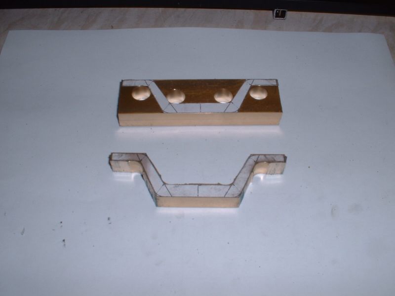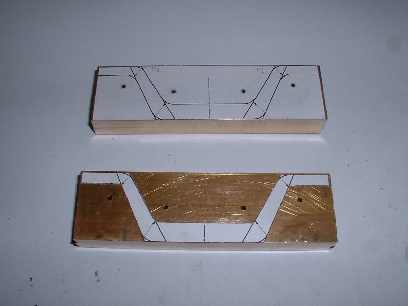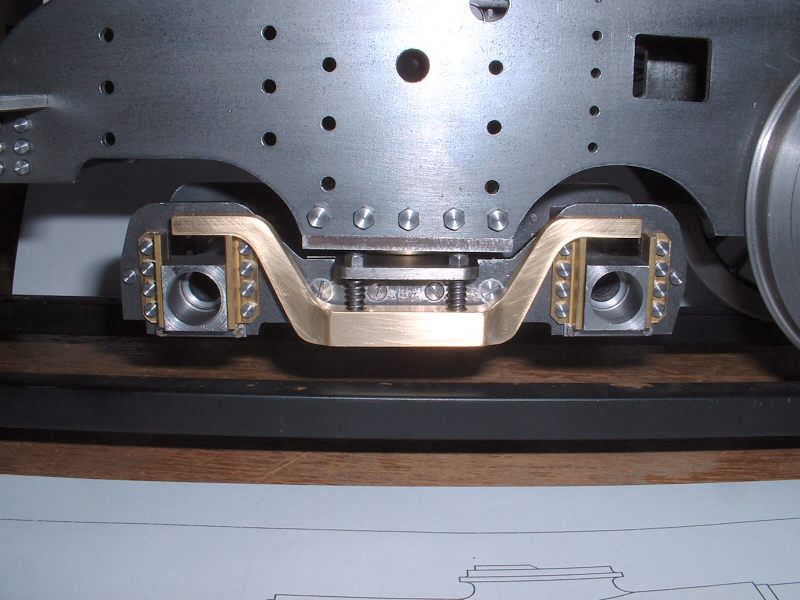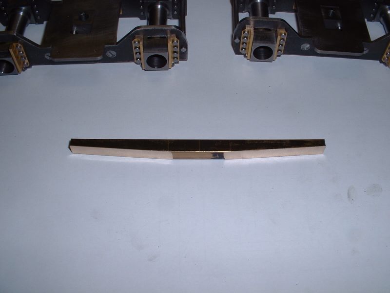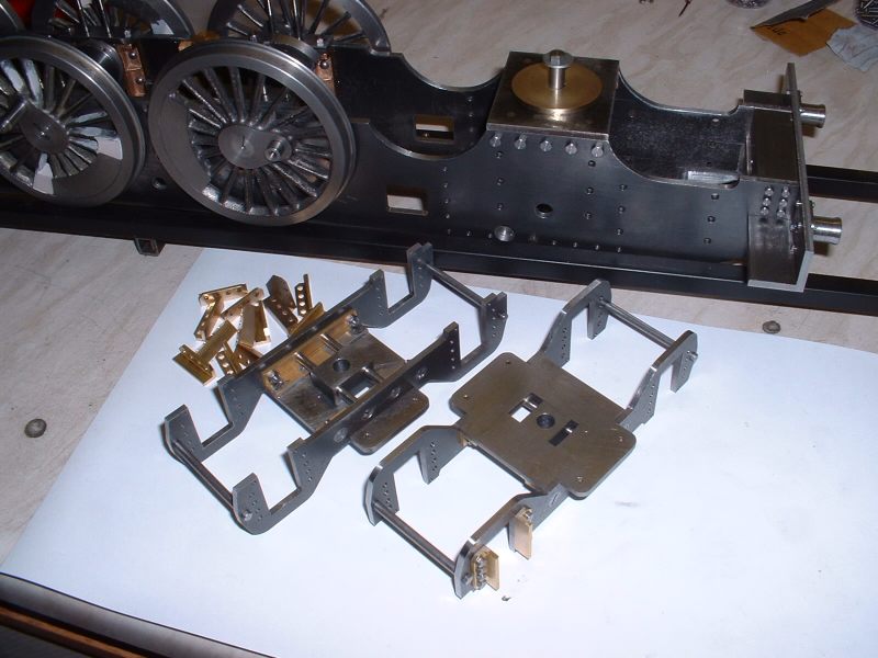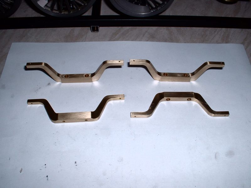 Last job on the axleboxes was to radius the inside flanges and this was done in the vertical miller using a similar setup to that used for the main axleboxes. radiusing the axlebox flanges The hornstays are simple lengths of 1/8" x 1/16" BMS held by 10BA screws. One pair fitted and the other pair waiting Some time was spent pondering on the best way to tackle the bogie equalising beams. Due to the size of the axleboxes the beams are quite deep and I don't think any available castings would have been suitable so I decided to try 'forging' them from 5/16" square brass bar. Suitable lengths were cut and milled to a taper at each end to reduce the machining required after bending. A former was cut from 1/4" mild steel plate and the idea was to bend the brass around this when heated with the gas torch. However, halfway through the first bend the brass just snapped like a carrot. Oh bother! (or words to that effect!). Obviously the bend required was too sharp and/or the brass too thick. Back to the drawing board. .................................. .....................................Before...........................................................................Whoops! I decided to go with one of my original ideas and cut the beams from solid brass bar. I had some 1/4"x 1-1/2" which I decided would be thick enough to take the holes for the centre springs. The beams were made in pairs by soldering two pieces of the brass together with the usual Carrs 188 solder paste. I thought it would be a bit much to try and cut all four beams together! Marking out the beams would have been quite a big job due to the various angles so I cheated by printing out the shape onto thick paper and sticking the patterns to the brass with double sided tape! The patterns had the centres of the various inside radii marked on and these were drilled with a small pilot hole. The outline of the frames was then cut out with a sharp knife. This marked the brass at the same time and meant that the paper could be removed for final machining work. Brass blanks with paper templates The pilot holes were then drilled out to 1/2" dia. to give the correct inside radii on the beams and the outline of the beams cut out with the hacksaw. Blanks drilled and roughly sawn to shape I didn't fancy finishing the beams by filing so I milled all the edges in the lathe. This involved some quite fiddly setups because of all the diffent angles but the job was finished without too much trouble. ..................................One of the milling setups!........................................Reducing thickness of beam ends The remaining outer curves were finished by hand filing and after a bit of work with emery paper I had four quite presentable equaliser beams. Phew! The four finished equaliser beams The pins which pass through the middle of the equaliser beam springs were made from 3/32" stainless rod threaded at one end to screw into the bogie stretcher. The remainder of the pins were left plain so that the beams can slide up and down them easily. The beams were temporarily fitted to the bogies using some 3/16" diameter springs I happened to have but I think these will be too strong for the finished loco. Unfortunately it was not possible to fit the spring pins first and fit the beams afterwards so the beams were fitted in position complete with springs and the pins screwed in from the bottom. The threads were made a fairly easy fit so that the pins could be screwed in by hand and they are then locked with a nut on top of the bogie stretcher. Equaliser beams, springs, and spring pins fitted I'm off to Rugby tomorrow ( April 30th 2006) for the National 2-1/2" Gauge Rally so all being well 'Helen' will be making her first public appearance. There's a long way to go yet though till she moves under her own steam! Helen's chassis behind my drawing and in front of a full size print of the original Josslin outline drawing