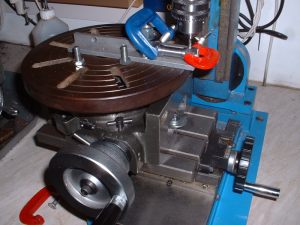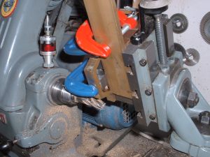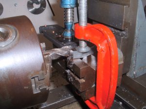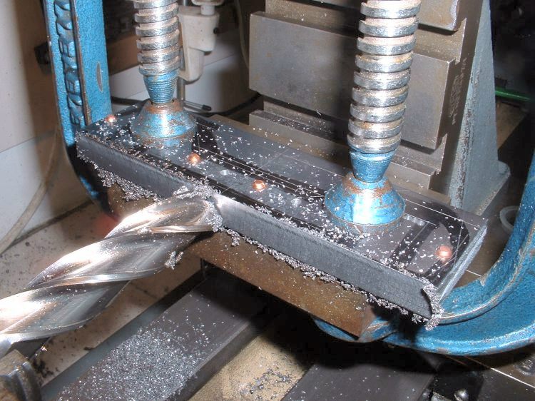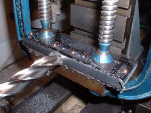 The front and rear bogies were the next job. I decided to make these both exactly the same so all four bogie frames were produced at the same time by rivetting four pieces of 3/32" steel plate together and just marking out the top one. I wasn't keen on the simple design usually adopted where the axleboxes run in a square hole in the bogie frames as the only way to remove the wheel/axle assembly from the finished bogie is by taking one of the wheels off which seems a bit drastic! I therefore designed the frames with a slot open at the bottom and with a hornstay screwed across the bottom. The bearing surface for the axle horns will be increased by bolting seperate horn cheeks either side of the slots. The axles will be sprung using the usual equaliser bars and central springs. I am undecided at this point whether to incorporate side control springs on the bogies as most 2.5" gauge designs don't bother with it but I'm sure it wouldn't do any harm to try fitting some. They can always be removed if found to be unnecessary. After rivetting together, the frames were roughly shaped with a hacksaw and then finished by milling and filing. I milled as many of the straight edges as possible to make sure that they came out square and true. Any angle on the edges would mean the four frames would finish up different sizes! The horn slots were finish milled the same way as those on the main frames. ,,,,,,,,,,,,,,,,,,,,,,,,,,Milling the edges of the bogie frames ,,,,,,,,,,,,,,,,,,,,,,,,,,,,,,,,,,,,, Milling the horn slots