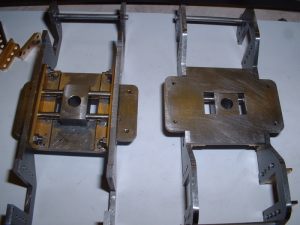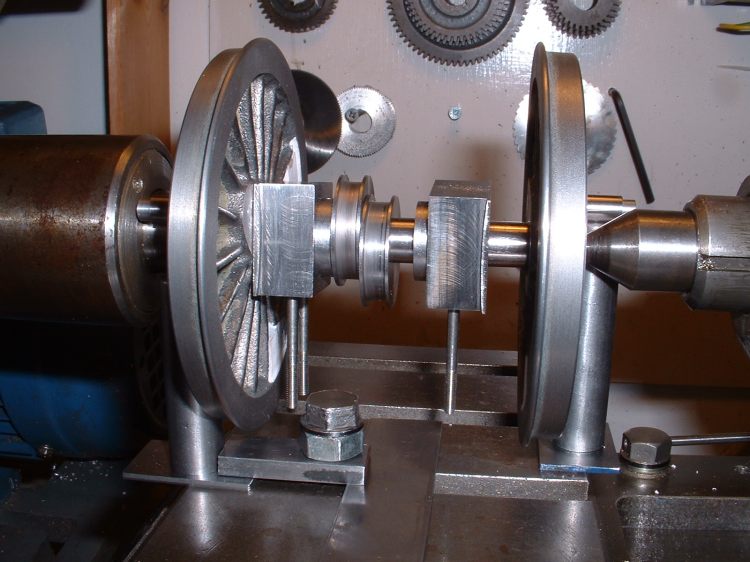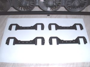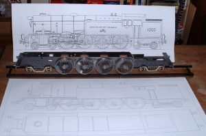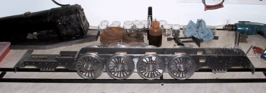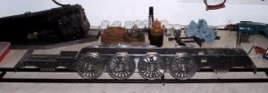 4 After several hours work I managed to clean up the remaining wheel castings despite stabbing myself in the hand several times with the very sharp ends of the needle files! The driving wheels were by far the worst and one had quite a few gouges in the spokes due to the 'fettler' at the foundry being none too careful with his grinder. Nothing that a bit of P38 filler won't put right though. P38 was also used to extend the balance weights for this pair of wheels. The wheels were then fitted to the axles and quartered as before. I had a nasty moment when gluing the second wheel on to one axle as the Loctite went off before I had got the wheel in the right place. Fortunately I managed to get it off again by some hefty twisting and after cleaning up again the second attempt went smoothly. As mentioned before, you can't afford to hang about once the axle is in the wheel. Setting the driving axle All four wheel assemblies were then fitted in the frames and I had a rolling chassis. Quite literally actually as the axles are so free that the chassis rolls down the slightest incline! Perhaps I should fit some brakes next!