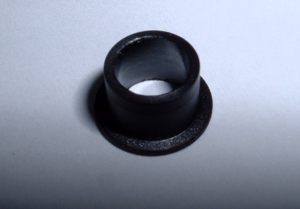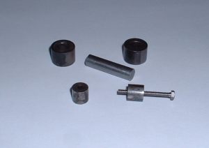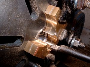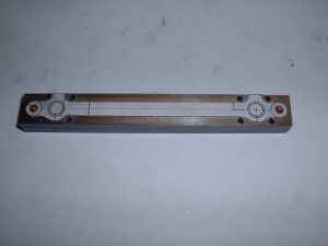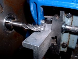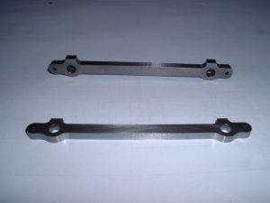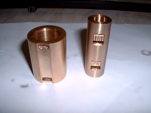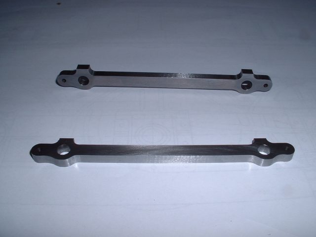 .................................Reaming knuckle joints............................................................Finished joint The rods were then cleaned up using carborundum paper and drum sanders in the mini-drill to remove any machining marks and countersunk oil holes drilled in each boss with a centredrill. The final job on the rods was to enlarge the crankpin holes and fit the bushes. The holes were opened out by clamping the rods on the table of the mini-mill and using a piece of 1/4" rod in the chuck to accurately line the holes up with the spindle. They were then drilled and reamed to 5/16" dia. I had got hold of some pieces of the TecaPeek PVX rod mentioned previously ( Page 6 ) and decided to give this a try for the bushes as this would give me an idea as to how easy it was to machine etc. One piece was 10mm dia. which was ideal so a set of bushes was machined from this. As expected, it is a delight to machine and parts off a dream! It is more expensive than bronze but it's much easier to work with. It is quite soft so it will be interesting to see how it performs in service. The bushes were finish reamed after being pressed into the rods and I did have a bit of a problem here as my reamer is not perfectly sharp and did not cut the plastic very well. I eventually used a sharp 1/4" endmill to take the final skim off the bore.