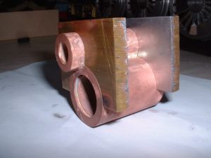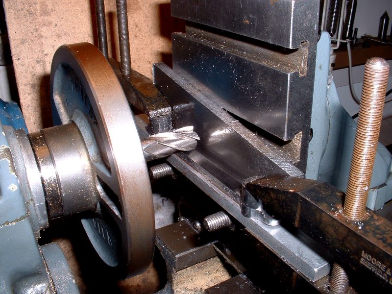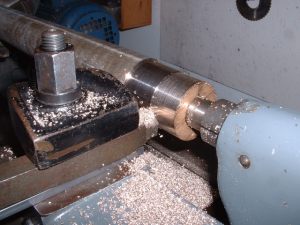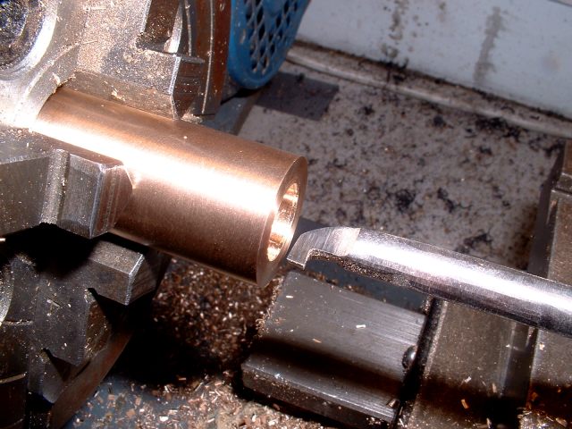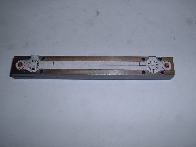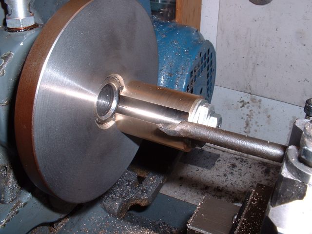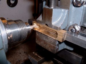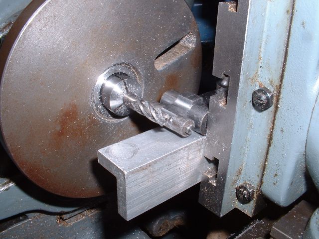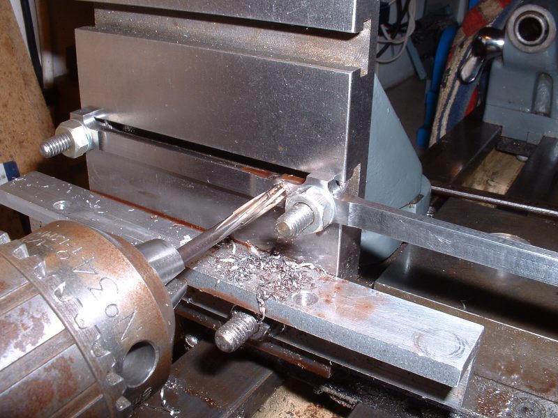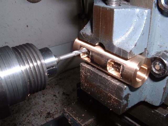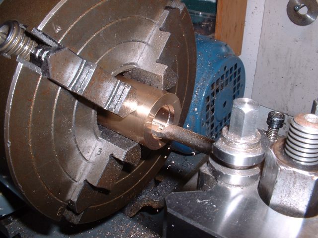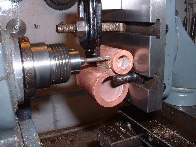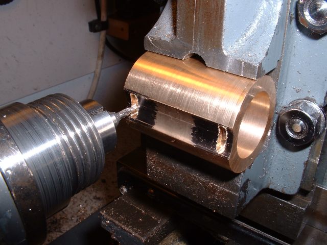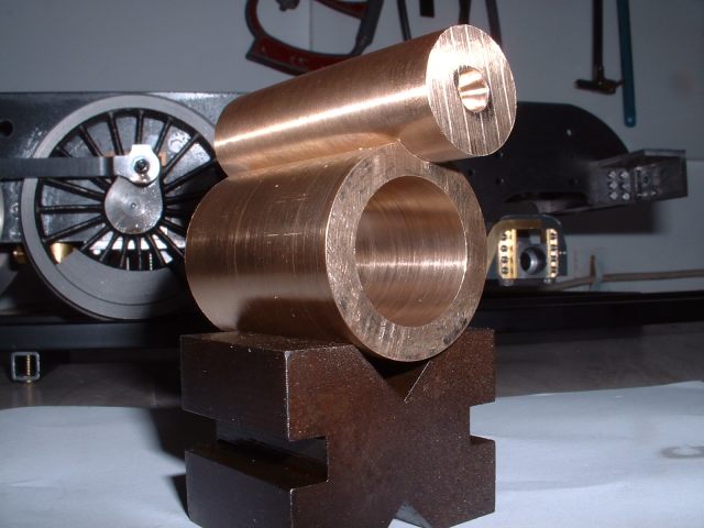 ..........................The TecaPeek PVX rod.................................................................. A finished bush After all the bushes were fitted, the rods were tried in place again. On one of the rods the trailing bush was slightly out and needed easing with a fine file. The plastic's very soft so you have to be careful not to be too enthusiastic with the file! When I was happy with all the bushes, it was time to destroy all the careful fitting by opening out all the bushes except those on the driving crankpin to give plenty of running clearance! This was done using an adjustable reamer set slightly above 1/4" dia. I had bought a set of these adjustable reamers some time ago but frankly the quality is very poor and they were a waste of money. I found the best way to use the reamer on the PVX bushes was to revolve it backwards otherwise it tended to dig in. That way it did the job quite well. Finished coupling rods I must admit that I'm glad the couplings rods are now done as the job seemed to take ages. There's quite a lot of fiddly work in them really. I think it's time to start thinking about the middle cylinder so that will be the next job. I'm still waiting for the bogie wheel castings as they are out of stock at the moment. 27/05/06 I didn't manage to do much over the past week or so due to running our local Legion club whilst the stewardess was on holiday but that's out the way now so back to work! As mentioned previously the cylinders will be fabricated rather than use castings. I had obtained some cored gunmetal bar for the cylinders and some solid gunmetal bar for the valve chests so a start was made on the middle cylinder. The cored bar was held in the 3 jaw chuck with the other end supported by a live centre. Fortunately the hole in the bar was smaller than the outside diameter of the centre and also central in the bar. I had intended to use a 3 point steady to support the bar but the outside surface of the bar was too rough for this. A suitable length of the bar was turned down to 1-1/4" dia (the finished diameter of the cylinder) and then sawn off. The 'tube' was then centred in the 4 jaw, bored out to 13/16" diameter and then both ends faced off to length. The finished bore will be 7/8" diameter but this, along with the valve chest bore, will be finished to size after the bits of the cylinder are finally silver soldered together. .................Turning the outside of the cored bar to size...........................................Boring the tube Next job was to machine a circular recess along the embryo cylinder to take the 3/4" diameter valve chest and this was done by bolting the 'cylinder' to a small faceplate and offsetting it by the correct amount from the lathe axis. The recess was then turned with a boring tool. The valve chest was then turned from gunmetal bar and cut off to length. ............................Maching the valve chest recess.......................................Valve chest sitting in the recess The valve chest was bored out to 3/8" diameter (finished diameter will be 7/16") and faced to length. There will be no seperate liner for the piston valve and the ports are cut directly into the inside wall of the valve chest. I made a special tool for this operation by grinding down a spare boring tool to give a square cutting edge exactly 3/32" wide, the width of the ports. The tool was carefully aligned with the end of the valve chest and then, using the micrometer dial on the leadscrew, fed along the bore of the valve chest the correct distance for the first port. The port was then cut by feeding the tool into the side of the bore. The remaining ports were then cut using the micrometer dial to advance the tool down the bore by the correct distance. There is a total of 4 ports to cut because, as mentioned before, I am using the Henry Greenly double ported design for the valves. The port cutting tool The valve chest was held in a vice on the vertical slide and the steam passages machined to connect the two ports at each end of the valve to the steam passages in the cylinder. The passages are contained within the joint area between the valve chest and cylinder so that no connecting pipes are necessary which would make the job more complicated. The only external connections are for the exhaust passages from the ends of the valve chest to the blast pipe. A similar setup was used to machine the corresponding passages in the cylinder. Machining the steam passages in the steam chest and cylinder I also decided to machine a groove at each end of the cylinder bore so that the incoming steam is distributed around the whole of the cylinder rather than just at the top. Another advantage of this is that the cylinder cover spigots can be made slightly larger than the cylinder bore thus allowing the cylinders to be rebored at a future date without affecting the fit of the cylinder covers. Cylinder and valve chest ready for soldering together The plan was to silver solder the cylinder and valve chest together first using a high melting point solder and then add the remaining bits using easyflo No. 2 rather than try and solder the whole lot at once. The joint area between the cylinder and valve chest was cleaned, fluxed, and the two components clamped together checking that they were aligned correctly. The joint was then soldered using silverflo 24. This turned out to be a bit of a struggle and a lot of heat was needed to accomplish this successfully. The gunmetal valve chest actually started to flake on the surface but fortunately no serious damage was done. I think for the outside cylinders I'll stick to easyflo for the lot as it's much easier to use. The mounting plates for the cylinder were machined from 1/4" x 1-1/2" brass bar and made as a pair by the usual trick of soft soldering the two pieces together and machining as one. They were made oversize so that they could be machined to final size after assembly. .............Machining mounting plates 