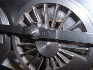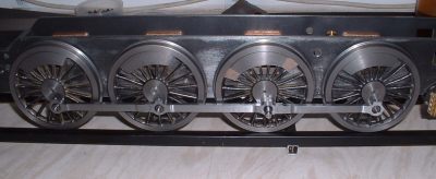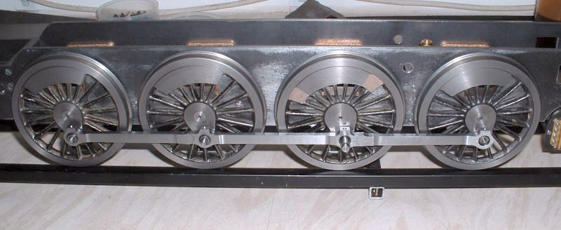 5 I thought it might be a good idea to include the dates when the updates are done so I'll do this in future. 05/05/06 The meeting at Rugby turned out to be a good day with the weather being kinder than expected although there were not so many locos running as last year. Helen seemed to get a good reception from other members so it's full steam ahead! I thought I had better tackle the coupling rods next and get those out of the way. The rods need to be in three sections, the centre section having a knuckle joint at each end. They are machined from 5/8" x 3/16" mild steel and to save work will be left plain rather than fluted ( plenty of full size engines have plain rods! ) The centre sections were tackled first. First job was to drill the crankpin holes and to get the centres correct an adjustable drilling jig was used ( as for Flying Scotsman ). The blanks were drilled and reamed 1/4" dia. and tried in place on the wheels. There was a slight tightness when the wheels were turned but the holes were a very close fit on the crankpins anyway. Any slight errors in the hole spacing can be corrected later when the bushes are fitted. Once again I avoided having to mark out the outline of the rods by sticking a paper template onto the blanks and then cutting round the outline with a knife, marking the steel at the same time. Both blanks were rivetted together so that they could be machined as a pair. Short lengths of 1/4" bar in the crankpin holes ensured accurate alignment of the two blanks. A few holes were drilled around the outline and the blanks roughly sawn out to shape. Rod blanks rivetted together and the paper template The blanks were then milled to the final outline with the rounded ends etc. finished by hand filing. To make this easier some filing buttons the same diameter as the various curves were made from silver steel bar and hardened right out. These were also used when milling the straight edges of the rods to act as 'stops' to prevent milling too far! Filing buttons made from hardened silver steel bar .....................................Milling the edges of the rods using the buttons as guides..................Rods after milling and filing the outlines LBSC recommended using a pin drill ( basically a D bit with a pilot pin ) for maching the tongue of the knuckle joint but I used an endmill instead, using a drill held in the chuck to line the pivot pin hole up with the lathe spindle centreline. Milling the knuckle joint Last job on the rods was to reduce the thickness on both sides and again the filing buttons were used to act as stops for the milling operation. Milling the sides of the rods 15/05/06 The leading and trailing rods were machined in the same way as the centre ones, the slots for the tongue of the knuckle joint being cut with a slitting saw. The joints were temporarily pinned with bits of 3/32" rod and the crankpin holes drilled using the jig again and reamed 1/4" dia. The complete rods were then tried in position and any misalignment of the holes corrected by carefully easing the crankpin holes in the right direction with a file. Fortunately the holes were nearly spot on so not much correction was necessary. One fault I did find was that one of the leading crankpins was not perpendicular to the crank boss causing the rod to bind in one position. I am not sure how this happened as the crankpin holes were drilled and reamed in the micro-mill to make sure they were perpendicular to the bosses. Anyway the pin was carefully removed after heating it with the blowtorch to break the Loctite bond and the hole in the wheel boss eased over so that the pin could sit correctly. The pin was then re-loctited in place. I now had a pair of coupling rods with all the crankpin holes in the right place but obviously the rods will need to be drilled and reamed to take bushes so the alignment will have to be checked again after the bushes are fitted. The next job was to fit the proper pins to the knuckle joints and I eventually decided to use plain pins made from 3/16" dia. silver steel press fitted into the outer legs of the joints and a running fit in the inner tongue. This should give a long life as there is very little movement in the joints anyway. The rods were clamped to the vertical slide and the original 3/32" pin holes drilled and reamed slightly under 3/16" dia. When I had bought the O gauge wheels for the Royal Scot and the A1 from Alan Harris I also bought a special size reamer which gives the correct press fit for 3/16" dia. axles. This is the reamer used. The joint was then taken apart and the inner tongue re-reamed to 3/16" dia for a running fit on the 3/16" pin. 4 pins were then faced and parted off from 3/16" silver steel and pressed into place.The pins were made slightly over length so that they could be filed flush with the outer face of the rods. They were left protruding slightly on the rear of the joints as I may put a touch of soft solder on the back just to make sure they cannot work loose in service.
