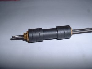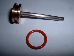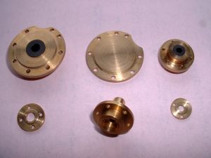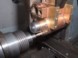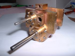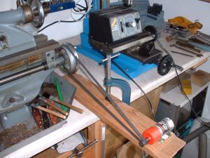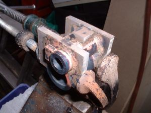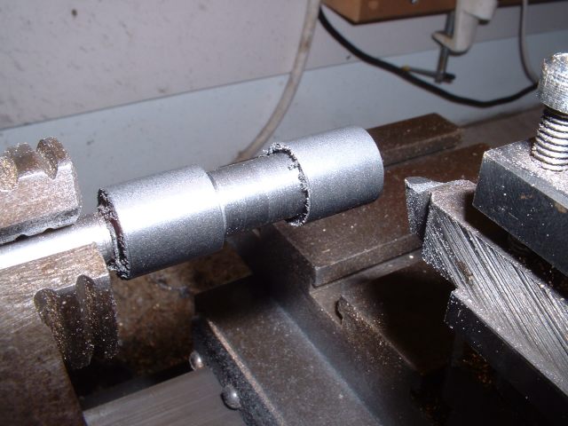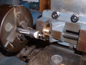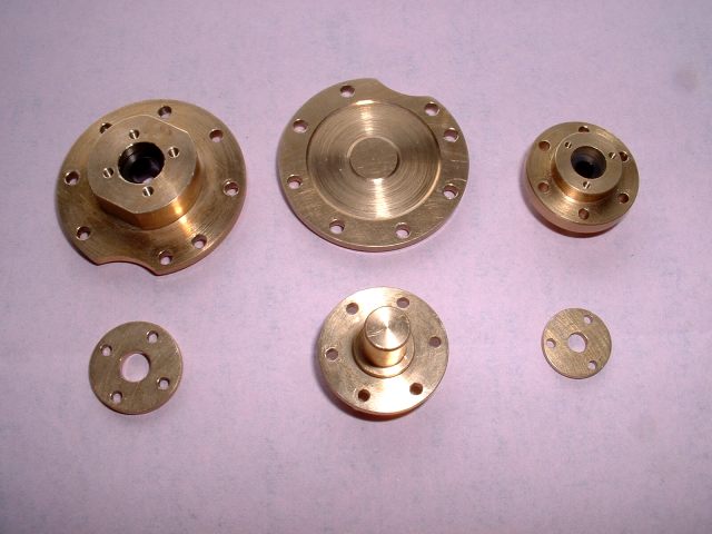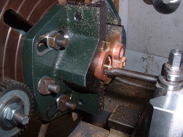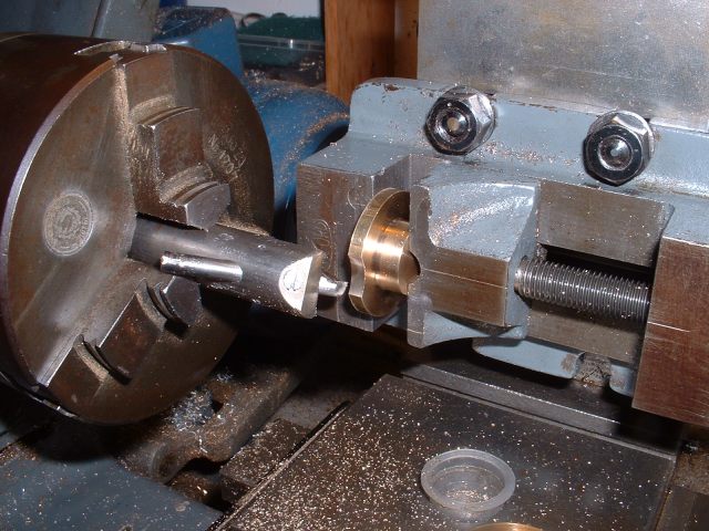 21/06/2006 Seems a long time since the last update but I've been busy with other things such as attacking the jungle that I call a garden! In order to finish bore the cylinder and valve chest I had recently purchased a Keats type angle plate to make the job easier. The cylinder was set up using this and the bore carefully centred with a dial gauge. This is a very fiddly job as the angle plate has to be tapped about on the faceplate to get the position right and then the mounting bolts finally tightened. A trial cut was then taken and it was immediately apparent that something was not right as when the boring tool reached the end of the bore it was only cutting on one side of the bore. Upon investigation I discovered that one side of the 'V' on the angle plate was not at right angles to the faceplate! This on a brand new piece of equipment! I finished up having to put a 15 thou shim under the rear of the cylinder to bring it true. After this everything went smoothly and both bores were finished to size. Finish boring the cylinder To try and get as good a finish as possible on the bores I rigged up a crude but very effective fine feed to the lathe leadscrew. This consisted of a geared motor with a toothed pulley and an old toothed belt from a computer printer. This drove on the large handwheel on the end of the leadscrew. The motor was connected to a Hornby train speed controller which enabled the speed and direction of the motor to be adjusted to suit. It works so well that I will have to make something permanent based on the idea! The finish on the cylinder bore was excellent so I decided not to bother lapping it as I doubt the finish would have been significantly improved. The piston valve bore was however lapped with an expanding aluminium lap and 600 grade Aloxite powder mixed with oil to make sure it was as smooth and true as possible. Improvised fine feed! The cylinder and valve chest end covers were simple turning jobs from ordinary brass bar but the rear covers were fitted with bushes made from the Peek material to take the piston and valve rods. The rear covers are also fitted with 'O' rings for sealing the rods and these are retained in their housing by covers, again turned from brass bar. To make the housing for the 'O' rings, the covers were bored through the correct diameter for the 'O' rings and the Peek bushes fitted in the bores. The bushes were made of such a length so as to leave the right gap for the ring at the end of the bore. The two cylinder covers require a segment machining out of the edge to clear the valve chest and this was done using a fly cutter with the cover held on the vertical slide. The bolt holes in all the covers were drilled using a rotary table in the micro-mill. Fly cutting the edge of the cylinder cover to clear valve chest The boss on the rear cylinder cover required flats machining on the top and bottom to take the ends of the slidebars. These were machined by bolting the cover onto the cylinder and mounting the cylinder onto the vertical slide. The flats were then machined using a small endmill in the chuck. Beforehand I had turned up a piece of bar to act as a gauge to get the position of the flats correct. This was mounted on a length of bar pushed into the piston rod bush and the flats milled until the cutter just skimmed the edge of the bar. This ensured that both flats would be exactly the same distance from the piston rod. Machining flats for the slidebars on rear cylinder cover Finished end covers and 'O' ring retaining covers Next job was the one I had been dreading and that was machining the piston valve! A piece of the Peek material was rough machined to size, drilled through, and then fitted onto a mandrel held in the 3 Jaw. The mandrel was turned in situ to ensure that it would run perfectly truly and was turned to such a diameter that the embryo valve could be pushed on by hand but still grip tightly enough for the valve to be turned to final size. To machine the valve heads to the correct length a similar proceedure to that used to machine the valve ports was adopted. A parting tool was used in the toolpost and a skim taken off the end of the valve. Using the leadscrew micrometer dial the tool was advanced along the valve the length of the first valve head and a groove cut into the valve. The tool was then advanced again to the start of the second valve head and another groove cut. Finally a third groove was cut to finish the valve to the correct overall length. The distances necessary were calculated to take into account the thickness of the parting tool. The material between the two middle grooves was then turned away to form the centre part of the valve bobbin and the excess length faced off. Using a very sharp tool, the diameter of the valve head was carefully reduced until the valve would just enter the bore in the valve chest. Using a sharp 'V' shaped tool three shallow grooves were machined in the valve heads to act as oil grooves. The valve was then removed from the mandrel, coated with molybdenum disulphide grease and pushed into the valve chest bore. It was then tapped backwards and forwards in the bore until it freed up slightly. This had the effect of polishing the valve bore and left it with a mirror finish. Finishing the outside diameter of the valve Unfortunately, that was not the end of the process as allowance had to be made for the expansion of the valve when it got hot. Leaving it a good fit at room temperature would have meant that it would seize up solid at steam temperature. So then followed a long and tedious process of heating the cylinder in boiling water and gradually reducing the diameter of the valve by tenths of a thou until it moved freely at this temperature (approx. 100 degrees C). By leaving the original mandrel in the lathe undisturbed the valve could be put back in the lathe and re-machined a bit at a time. The valve was now slightly loose at room temperature but will still seal well enough until 