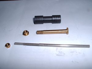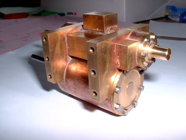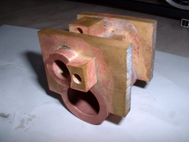6 28/05/06 After milling the slot in the manifold the underside was curved to match the valve chest. A smaller block was then made to act as the connection for the steam inlet. This also had the pipe connection facing towards the back of the cylinder. The last job was to cut a recess in the cylinder mounting plates to clear the exhaust manifold. It was time to solder it all together which was a job I wasn't really looking forward to as I had visions of the lot ending up as a pile of scrap if it went wrong! The joint surfaces were cleaned with files and carborundum paper and all the bits assembled and carefully lined up using a couple of old G clamps to hold everything in place (I get these from pound shops so I'm not too bothered if they get damaged!) The joints were liberally coated with flux and the whole lot silver soldered with easyflo No. 2. This was a lot easier than using the silverflo 24 as it melts at a much lower temperature and it also flows a lot better. After making sure all the joints had plenty of solder on them the job was left to cool and then dumped in the pickle bath. The cylinder asembly just after soldering - not a pretty sight! After pickling and a quick clean up the cylinder was given the once over. Apart from a slight gap between one of the mounting plates and the top of the valve chest everything seemed ok. Actually the mounting plates will be machined flush with the top of the valve chest anyway so it won't matter. If any leaks do show up later I'll just seal them with soft solder. Looking better after coming out the pickle bath