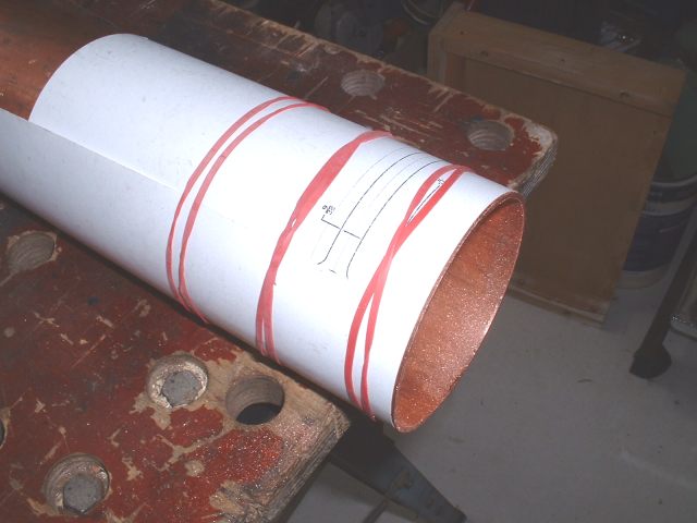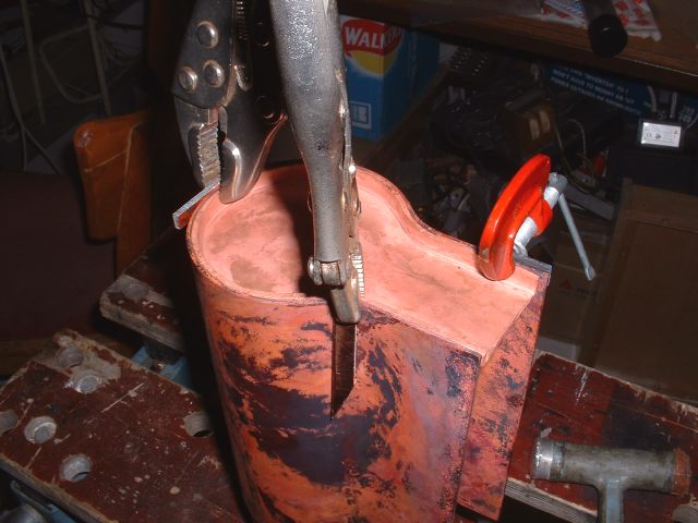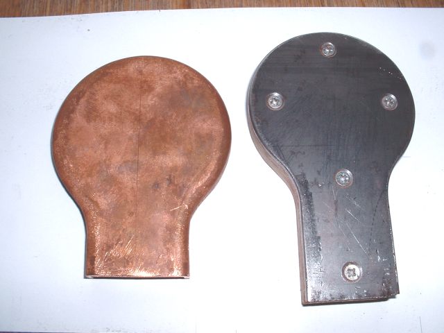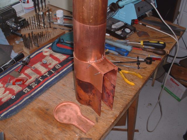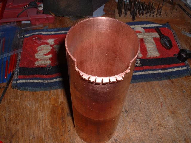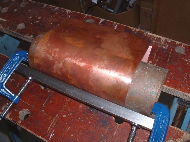 The blank was held in a collet and cuts taken across the face, at the same time putting light pressure on the lathe saddle to keep the cross-slide pressed against the end of the rod. The pressure is really only necessary when winding the cross-slide back to the beginning of the cut otherwise the bar falls out! When the front face of the head was reduced to the right thickness at the edge, the edge was rounded off with a fine file and the face finished off with fine carborundum paper. The heads are retained in the stocks by 7BA bolts put through from the back of the stocks and threaded into tapped holes in the shanks. The buffers are fitted with short springs made by cutting some longer ones in half. They are probably a bit too strong but I don't suppose the buffers will be doing much anyway! Completed buffers bolted onto the beams 05/08/2006 I fancied a break from machining work so decided to do a bit of tin bashing and make a start on the boiler. Helen's boiler is a pretty simple affair apart from the very long firebox which is needed to give the heating surface necessary to steam the three cylinders. It will be interesting to see how easy it will be to fire it. I think the firehole will need to be a decent size to give a good view of the fire at the tubeplate end! The barrel is a length of 3-1/4" diameter by 16swg tube with a seperate wrapper for the firebox end. I think this is easier than using a full length tube which then has to be split and extended either side for the firebox wrapper. Most writers recommend truing up the ends of the barrel in the lathe but this means turning up a couple of wooden discs to put in the ends of the tube, one to enable the tube to be gripped by the chuck, and the other to support the outer end of the tube using a tailstock centre. It's a lot easier to just file the ends square using a piece of thick paper wrapped around the tube to give a straight edge to work to. If the edges of the paper are lined up where they overlap the edge will be perfectly level and square all around the tube. Using paper to true up the ends of the tube Some thought had been given to the type of joint to use where the throatplate meets the barrel. LBSC and Martin Evans invariably used a simple butt joint with the throatplate resting on the end of the barrel and a good fillet of silver solder built up at the joint. The alternative is to flange the top curved edge of the throatplate where it meets the underside of the barrel as well as the sides. It can be a bit tricky making this type of double flanged throatplate so I adopted a joint somewhere between the two. The top of the throatplate still butts against the inside edge of the barrel but the barrel is sawn to produce little tabs which are bent down against the front of the throatplate. This will give the benefit of the greater strength of a fully flanged joint but should be a bit easier to do. Tabs cut and bent down for the throatplate joint The backplate was made next from 13 swg copper and flanged over a simple former made from 1/8" steel screwed to 1/2" plywood to give the extra thickness. You do get slightly better results using all steel formers but they are a lot harder to cut out! The main problem with the wood backing is that the copper tends to get bent around the steel plate and grips the wood very firmly, making it difficult to remove the boiler plate after forming . All steel formers don't give this problem. The same former was used for the throatplate which is also 13swg. Backhead with former Next job was to bend up the firebox outer wrapper from 16swg sheet. A piece was cut the right width to suit the length of the wrapper and left slightly over long to allow for trimming after bending and soldering. I happened to have a piece of thick wall copper tube the same size as the barrel so this was used as a former for the top of the wrapper. A centreline was scribed down the wrapper sheet and another one down the former tube. The sheet was then clamped to the tube with a length of bar and G clamps ensuring the centrelines aligned. This ensured that the wrapper would stay square to the axis when it was bent around the tube. Forming the outer wrapper The two reverse curves at the side of the wrapper were made by using a smaller diameter bar. It is a bit tricky to get these bends in the right place but I managed it eventually using the backplate as a template. Final shaping was done by clamping the wrapper around the backhead. Using backhead as a former for final shaping The barrel, wrapper, and throatplate were then assembled using 10BA nuts and bolts put through a few holes drilled in strategic places. The alignment of all the parts was then carefully checked with a straight edge and when I was happy that all was ok, the nuts and bolts were replaced with 1/16" copper rivets ready for soldering. It pays to use as few rivets as possible as they are a potential source of leaks. Any gaps in the barrel/throatplate joints were plugged with slivers of copper tapped into place. It is important not to have any gaps as even the Silverflo 24 is not that good at filling gaps and Easyflo will run through gaps like water! Using nuts and bolts for initial assembly