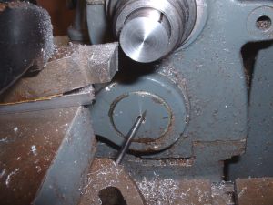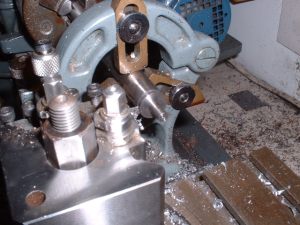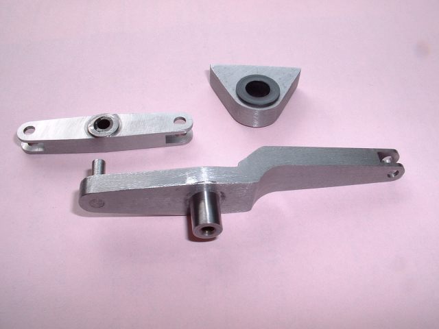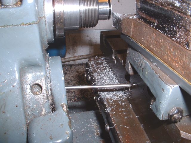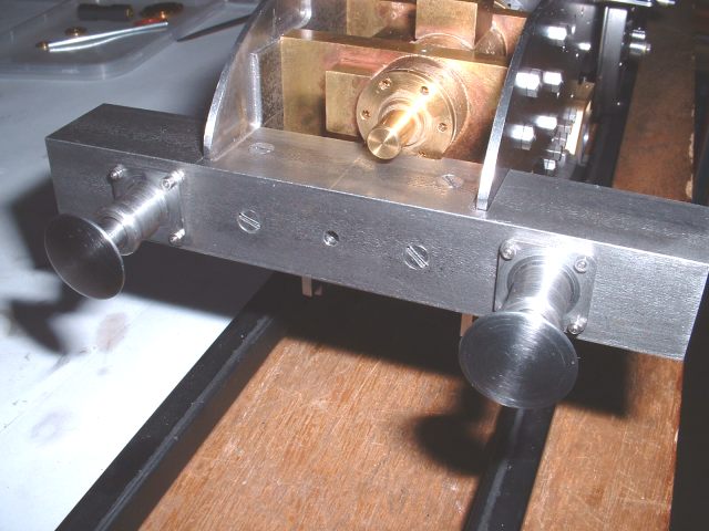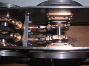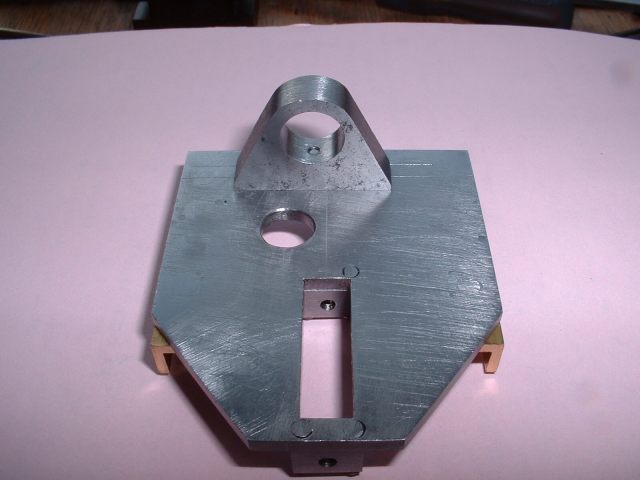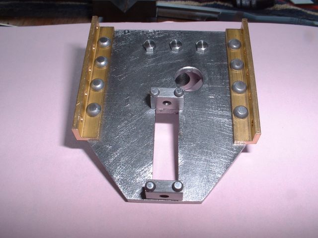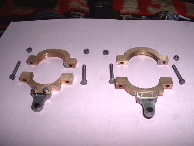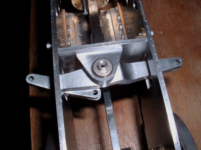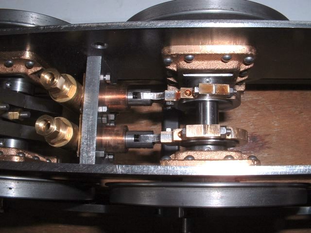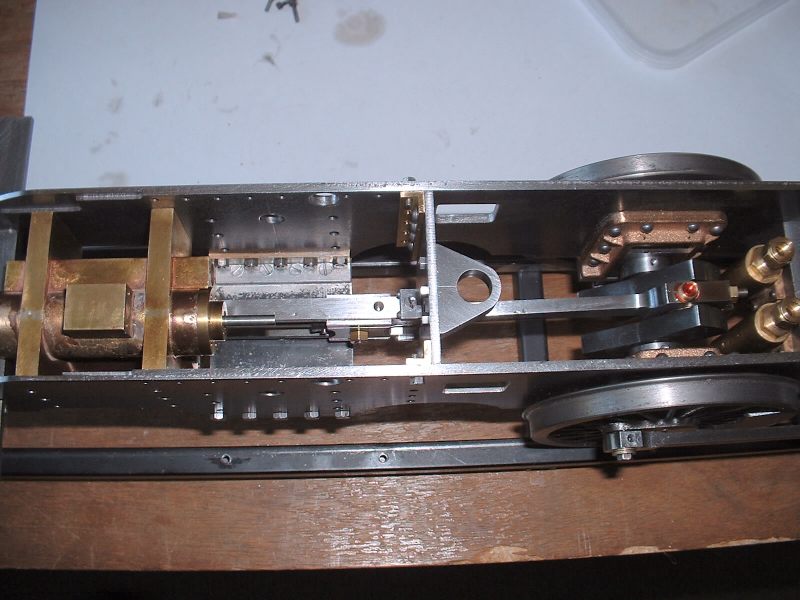 7 25/07/06 The inside motion plate is a simple fabrication from steel plate with brass angle rivetted on the sides for attachment to the frames. Two small 'lugs' are rivetted top and bottom of the slidebar slot for attachment of the slidebars. The motion plate also carries the bearing for the long lever of the conjugated valve gear and the mounting bracket for this is a shaped block bolted to the plate. Inside motion plate The motion work was then temporarily assembled and everything lined up properly and moved smoothly with no tight spots. The only problem that came to light was that the connecting rod fouled the end of the bottom slidebar. At the moment there is no weight on the axles and the axle boxes are at the lowest point in the horns. When the loco has a few more bits added the boxes will rise in the horns and the clearances will be ok. However, just to be on the safe side I filed a bit more off the chamfer on the end of both slidebars to increase the clearance. Motion plate fitted with cylinder etc. Whilst making the motion plate my thoughts turned to the problem of lubrication for the inside motion etc. The inside crosshead and slidebars will be hidden under the smokebox saddle and so will be inaccessable from the top for pre-run oiling. I am not very keen on the idea of turning the loco upside down before every run to oil all the inside bits so I came up with the idea of fitting a small oil tank where it can be got at easily for filling and running small pipes to deliver oil to all the inaccessable motion. I may even fit the tank with a mechanical lubricator to actually pump the oil to the motion work. I had been wondering where the mechanical lubricator for the cylinders would go as there is no room behind the front buffer beam which is the usual place to fit one (The space behind the beam is filled by the inside cylinder!). However, there is a fairly big gap behind the inside motion plate and I should be able to fit the cylinder lubricator there along with the oil tank for the motion. The drive for the lubricator can be taken from the axle pump eccentrics or some other convenient point. With the remote tank idea in mind, the top slidebar was drilled with a small hole to take the oil feed. The crosshead was drilled with a countersunk hole on the top bearing surface to collect oil and feed it to the small end. Another small hole was drilled in the bottom of the crosshead to feed oil to the bottom slidebar. 28/07/06 The long and short beams for the conjugated drive for the inside valve are fairly simple milling and filing jobs from mild steel bar. To ensure accurate positioning of the pivot points the blanks were set up on the vertical slide and the holes drilled using the crosslide micrometer dial to set the distances apart. Obviously, any large errors in the 2 to 1 gear will affect the timing of the inside valve but I don't suppose a few thou will make any significant difference. The main pivot for the long beam is a plain length of 1/4" silver steel drilled and tapped at the top to take a retaining bolt and the smaller pivot pin for the short beam is a similar piece of 1/8" silver steel, again drilled and tapped for a retainer. The large bush in the main bearing bracket and the smaller bush in the short beam are turned from the Peek material again. My reason for using this material here was that the bearings can be made quite a tight fit on the shafts and still move freely. This will help to eliminate any backlash in the finished motion. Beams for 2 to 1 gear Incidently, when I was first drawing out the valve gear I had the main bearing for the long beam mounted underneath the beam. I then realised that it would be in the way of the inside connecting rod so I had to move the bracket so that is above the beam. The small beam is held onto it's pivot by a countersunk washer and 8BA countersunk screw and the main beam by a 5BA hex bolt and washer. The 5BA bolt is drilled through the centre and the head countersunk to act as a oil cup. A small hole is drilled through the wall of the 1/4" shaft to feed the oil to the bearing. Beams mounted in frames 01/08/06 I thought it was about time I finished the axlepump assemblies so the next job was to complete the eccentric straps (I actually bored the straps and rough finished them when I had made the eccentrics earlier). I had found a couple of suitable castings amongst a mixed lot I had bought some time ago and machined these up. The castings were sawn in two, the mating faces cleaned up and the straps drilled and reamed and 7BA bolts made and fitted. After bolting the two halves of the straps together they were held in the 4 jaw and faced off both sides to a thickness of 3/16". They were then bored out to a nice running fit on the eccentrics. The oil boxes etc. were then milled to final size.The lugs on the straps were slotted to take the ecentric rods which are made from 1/8" mild steel. The embryo rods were soldered into the straps and then two holes drilled and tapped through the lot to take two 8BA bolts to secure the rods firmly. The ends of the rods were then filed to shape using filing buttons and the sides shaped by milling. Finally the rods were fitted with Peek bushes to take the 1/8" dia. drive pin for the ram. Incidently, the rods are very short because the pumps have to be very close to the axles due to the lack of space. However the pump throw is only 3/8" so the angularity of the rods when at the top and bottom positions is not too severe. Axle pump straps ready for fitting The drive pins for the rams are simple lengths of 1/8" dia. silver steel press fitted into the rams. Straps assembled and fitted 03/08/06 Some time ago I had turned up the 4 buffer stocks from 5/8" square mild steel. They are a quite basic design with parallel stocks reamed out to 1/4" diameter for the heads and fastened to the buffer beams with 10BA nuts and bolts. As a bit of light relief I decided to finish the buffer assemblies by making the heads