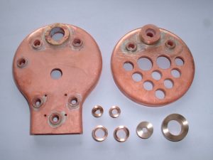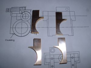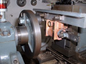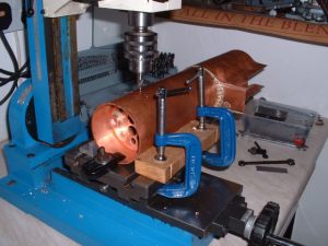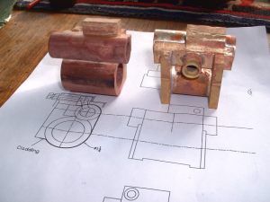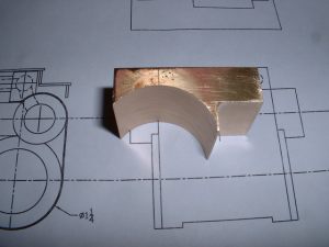 9 18/08/2006 The next job was to work out exactly what bushes were needed on the boiler. The majority are just small 3/8" diameter bushes tapped 1/4"x40 (for boiler fittings and the two longitudinal stays) and I needed ten of these. I chose to fit bushes for the longitudinal stays to screw into rather than tap directly into the backhead and smokebox tubeplate as copper is dreadful stuff to tap and it's easy to strip the threads if you are not careful. On the subject of longitudinal stays, there is some doubt as to whether these actually do anything at all. The backhead and smokebox tubeplates are pretty well supported by the tubes, bushes etc. and the actual area covered by the stays is very small. However, we need some means of getting steam from the cab to the blower jet so we still need a hollow stay anyway so we may as well fit the solid one as well. I have thought of making both stays hollow as the second one may be useful for something (perhaps I could connect a manometer to the cab end for measuring the smokebox vacuum?). As well as two bushes on the front of the barrel for boiler feeds I have also allowed two more bushes at the bottom of the backhead for injector feeds if necessary. I have also allowed a bush on the backhead for a blow down valve. It would be nice to have fitted one at the bottom of the throatplate as this is the lowest point of the boiler but I don't think it will be possible to get at it to operate it. I may fit a bush here anyway just in case. It can always be fitted with just a screwed plug for washing out the boiler now and again. The top fitting for the water gauge will have to screw into a special boss on the top of the backhead to give a decent length for the gauge glass. The regulator will probably be the usual screw down type in a tube similar to Black Five so the backhead bush for this has to be large enough to take the tube for this. The steam pipe connection in the smokebox from the regulator will use an O ring for the seal into the bush on the tubeplate rather than the screwed connections usually used. Much simpler I think. The remaining bushes are two 3/8"x32 for the safety valves, a plain drilled bush for the steam turret, and a 1" diameter plain bush for the dome. This is really only to allow the steam collecting pipe to be screwed into the top of the regulator and will carry just a plain flat cover plate. The small boiler bushes were turned up from phosphor bronze bar and the larger ones (regulator, dome, and turret bushes) from gunmetal as I didn't have ordinary bronze big enough for those. The bar was turned down to a suitable diameter to fit the holes in the boiler and then parted off to give a 'top hat' shaped blank. The blanks were then reversed and held in a collet where possible, faced off and then drilled and tapped where necessary. The threads were not tapped fully but just started with a taper tap and will be tapped all the way through after soldering into the boiler shell etc. This avoids the possibility of the threads getting burnt and damaged during the soldering operation. The bushes for the backhead and smokebox tubeplate were soldered in using silverflo 24 as it's easy to get these small assemblies hot enough to use this. One thing I noticed was that the surface of the regulator bush blistered in places, obviously due to the high temperature. This had been made from the same gunmetal bar as the valve chest for the middle cylinder which had also suffered when soldering with the silverflo 24. If I use any more of this for items requiring soldering I'll try and stick to lower melting point solders as the gunmetal certainly doesn't seem to like a lot of heat. Bushes fitted to backhead and smokebox tubeplate The next job was to drill the boiler barrel to take the bushes in that. I did this in the micro mill using a suitable set up to hold the barrel firmly. The smokebox tubeplate was pushed into the front of the barrel to give extra support when drilling the two holes for the boiler feeds. Similarly the backhead was used when drilling the holes for the safety valve and turret bushes.I found the best tool to drill the holes with was a centre drill (slocombe) as these cut well without snatching. It's very difficult to drill thin material, especially copper, with ordinary drills as they tend to grab and it's so easy to ruin the job. For the larger holes for the dome and safety valve bushes, the centre drill was used to drill a pilot hole and then the holes were carefully opened out by filing.