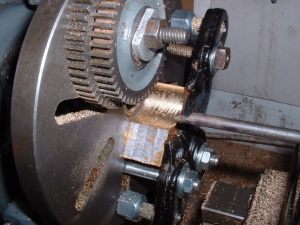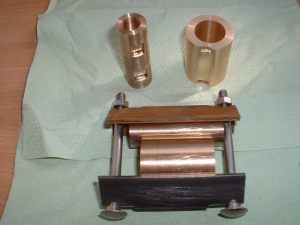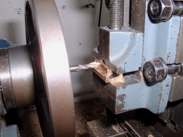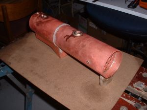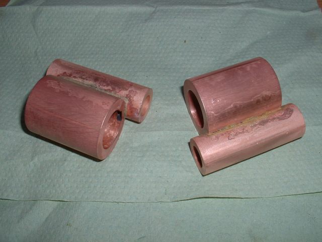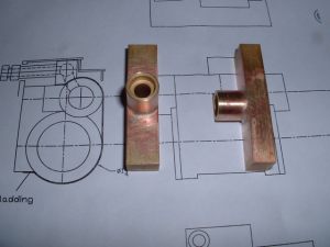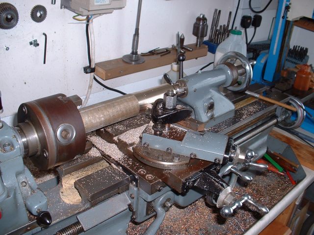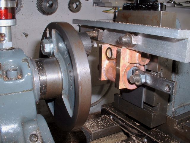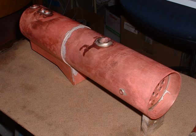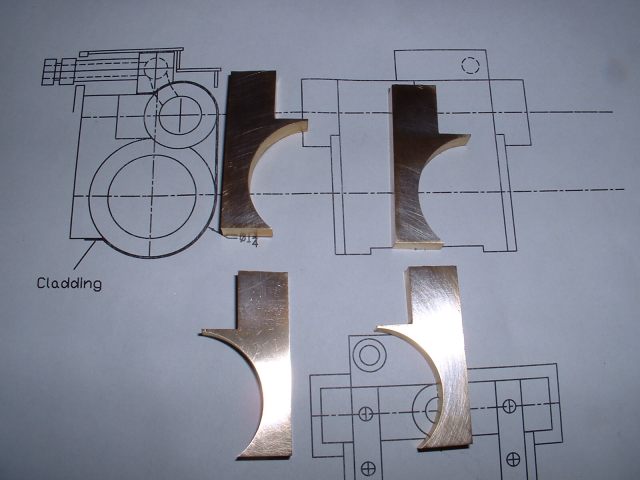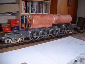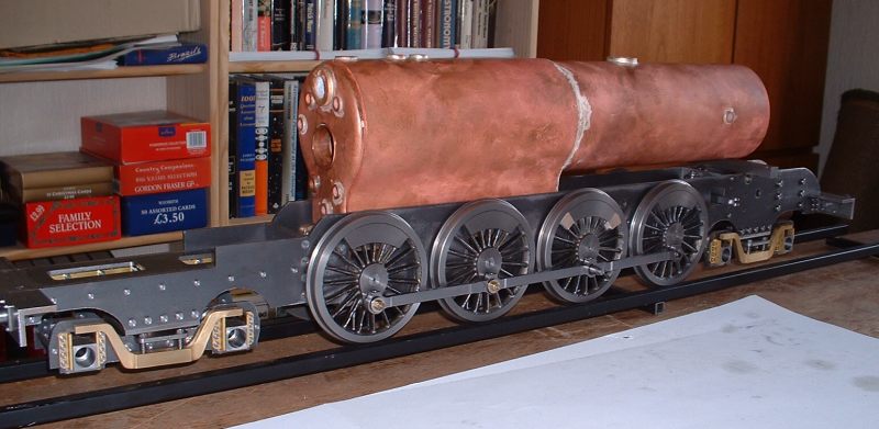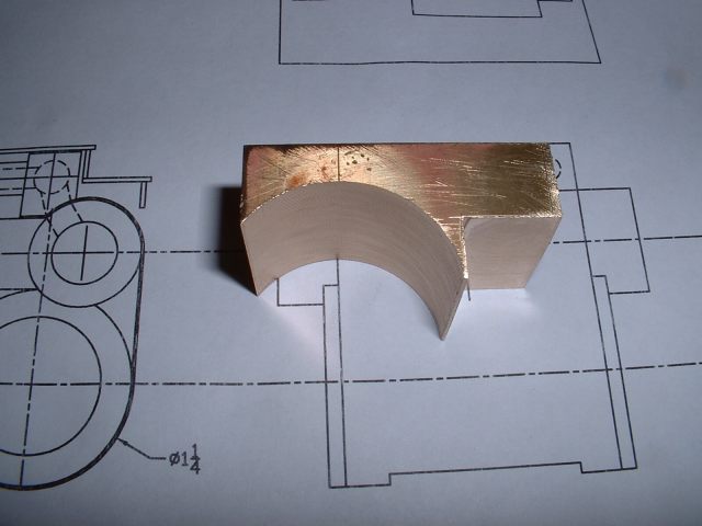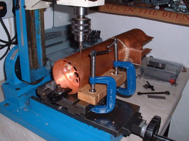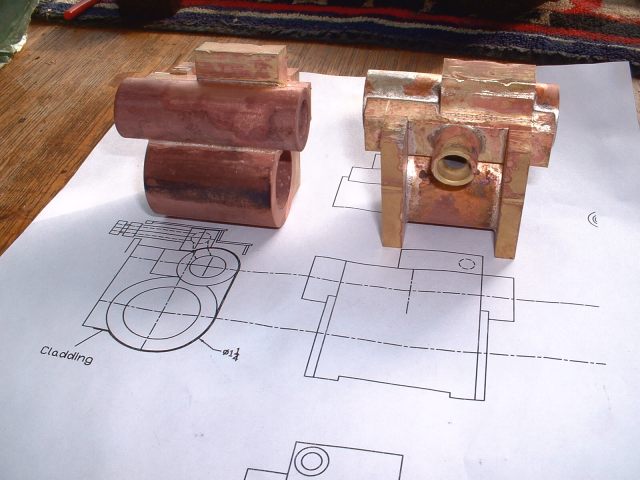 Drilling holes in the boiler barrel I had already decided to fit the smokebox tubeplate at this stage so this was soldered in at the same time as the two boiler feed bushes using 440 silver solder. I know it's usual to solder the tubeplate at the same time as the tubes but I thought it would be easier to do it now rather than do the whole job in one go later. A bit of a jig was made to support the tubeplate in the correct position in the barrel as I thought this would be simpler than try rivetting the tubeplate in position. Unfortunately, after soldering I noticed that the tubeplate had rotated slightly so the tube holes are not quite level. Not a problem really but annoying just the same. Still, I can't do anything about it now! The dome bush was then soldered in, again with 440, and finally the safety valve bushes and the turret bush. Great care was taken to get the safety valve bushes level so that the valves will be vertical when fitted. Nothing would look worse that the valves leaning in different directions! All the boiler bushes fitted There's not much more I can do to the boiler at this stage as it needs to be inspected before the firebox/tube assembly is fitted. Apparently the new boiler regulations require this so I've arranged to take the boiler to the 2.5" meeting at Chesterfield on October 1st so that Steve Eaton ( the boiler tester for the Association ) can give it the once over. If all's ok I can press on and get it finished. The one thing I am worried about is the soldering of the firebox stays as I think it is going to be well nigh impossible to silver solder the ends of the stays inside the firebox due to it being so narrow. It might be possible using Oxy-Acetalyne but I don't have access to the equipment. I am hoping it is still possible to use Comsol for caulking. What we need is a silver solder that melts at about 400 degrees C ! I am hoping to get the boiler for the A1 to a similar stage so that I can take that to Chesterfield as well. That will give me plenty to go at over the winter then. 21/08/2006 Not much done to Helen over the weekend as I've been busy sorting out the junk under my carport/work area so that I can put a bench in there. I can then do any really noisy jobs such as sawing and hammering outside but still be under cover. I've also made a proper brazing hearth from some old Dexion angle and steel shelving. I knew it would come in useful one day! I did manage to have a trial assembly of the firebox and tubes into the boiler shell. Apart from having to bend the tops of the firebox stays to match the inside curve of the boiler shell it all fitted together very well. I thought I may as well cut the hole in the backhead for the firehole tube while I was at it so I carefully measured it's position from the edges of the backhead and then drilled and bored the hole in the lathe. Fortunately when I tried the backhead in position the hole was pretty well spot on. The flange on the backhead needs trimming a bit as its too wide in places and also a little bit needs taking out to clear the turret bush. I also finally trimmed the bottom edge of the firebox to the correct shape after marking it off from the bottom of the boiler shell. She's looking more like a loco every day! One thing I have realised is that I forgot to cut off the front top corners of the horns for the third axle before I fitted them to the frames. This is necessary to clear the bottom sloping edge of the firebox wrapper so at the moment the boiler sits too far forward in the frames by about 1/4". I will have to remedy this some time in the future, probably by using a cut off disc in the dremel. I've had some good news from Steve Eaton, the Association boiler tester. He is quite happy with soft solder caulking for the firebox stays so that will make the job of soldering the stays much easier. Apparently there are some clubs who do not like it however and insist on all the stays being silver soldered. Personally, I don't see the problem with using Comsol so long as you don't let the water level in the boiler get too low. The worst that can happen is that the solder on the top row of stays may melt and cause a leak into the firebox but if the threads on the stays are a good fit in the wrappers and proper nuts are used inside the firebox then there will be no loss of strength to the boiler. There must be hundreds of boilers around with soft solder caulking that are still in use, especially 2-1/2" gauge ones. 14/09/06 I've had a bit of a break from Helen while I worked on the boiler for the A1 but that's now ready for inspection so work on Helen can continue. I've done one or two minor jobs that needed attention i.e. I've cut off the top corners of the axlebox horns on the third axle using a cutting disc in the Dremel to allow the boiler to sit further back and I've also fitted a bush in the boiler throatplate for a washout plug. It may be possible to fit a blowdown valve here if I can find a way of operating it from outside the frames. Looking at the position it would fall into, I may be able to drill a hole in the frames behind the driving wheel and access the valve with a tool inserted between the wheel spokes.I've still heard nothing about the bogie wheel castings from the Association so I may try another source for these. The next main item on the agenda is the outside cylinders and I'm working on those now. The method of construction is pretty much the same as for the inside cylinder so I won't go into great detail about making these. I'll just post a few pics as I go along and mention any differences. 18/09/2006 Machining proceeded pretty much as for the inside cylinder but this time I bored out the valvechests to the finished size of 7/16" diameter before soldering them to the cylinders rather than finish them later. This would make the final machining of the completed 'castings' a bit easier leaving only the cylinder bore to machine to final size. I reasoned that any slight distortion of the