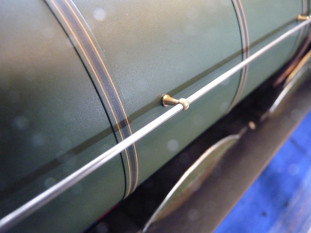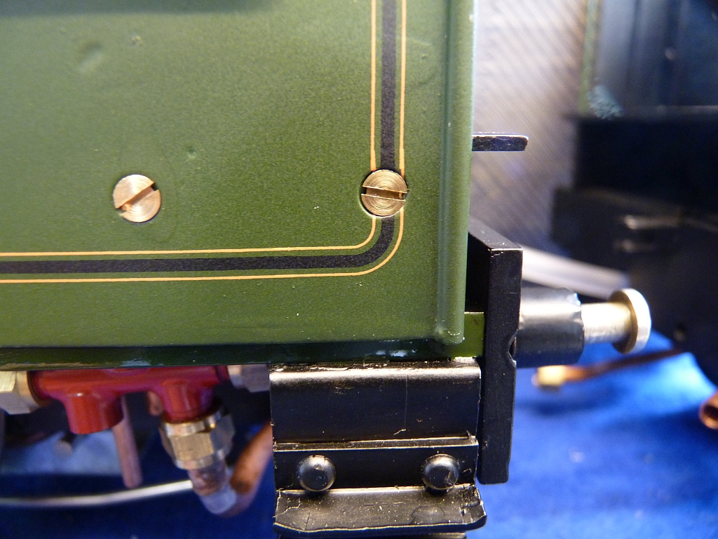 All in all, although I think the job was a nightmare and I was a nervous wreck doing it, I'm really pleased with how the transfers look. I'm not sure I would use them again though. Once all the transfers were done, the whole lot was sprayed with several coats of satin varnish, both to protect the transfers and to give my friends desired satin finish. I just got some Humbrol satin enamel varnish in an aerosol and that went on lovely. The finish was much better than I expected and I was rather pleased with it, although I think I personally prefer a gloss finish to satin. Some say that a gloss finish makes the locos look toy like but I don't agree with that. It's much easier to clean a gloss finish as well. It was about this time that I realised that I hadn't fitted the handrail stanchions on the new cladding on the boiler barrel. Oh bother! (or words to that effect) This should have been done before painting. The only way I could fix them now was to drill holes and use Loctite to secure them. Most of the old handrail stanchions were pretty crap so I decided to fit some new ones. I had some 2½" gauge ones from the N25GA but they are really too big and out of scale. Friend David suggested I try Walsall Model Industries which i did and they are much better. The only problem is the mounting spigots are plain and not threaded so they need to be either glued or soldered in. I really wanted to screw the stanchions into the smokebox like the originals were to make sure at least the ends of the handrails are securely fastened. Unfortunately, the holes in the smokebox were tapped 8BA which is bigger than the stubs on the stanchions so I couldn't just thread them. In the end I cut the heads off some 8BA brass screws, drilled a hole in the end in the lathe to take the stanchion spigot, and then silver soldered the stanchion spigots into them. A bit fiddly but it worked. At least I only had five to do this to. I also managed to attach the very end stanchion to the firebox wrapper by threading the spigot 10BA and putting a nut behind the wrapper. It was close enough to the edge of the wrapper for me to get at the nut. That just left one stanchion at the front end of the firebox wrapper and two on the barrel to be glued in with Loctite. Hopefully they will be secure enough.