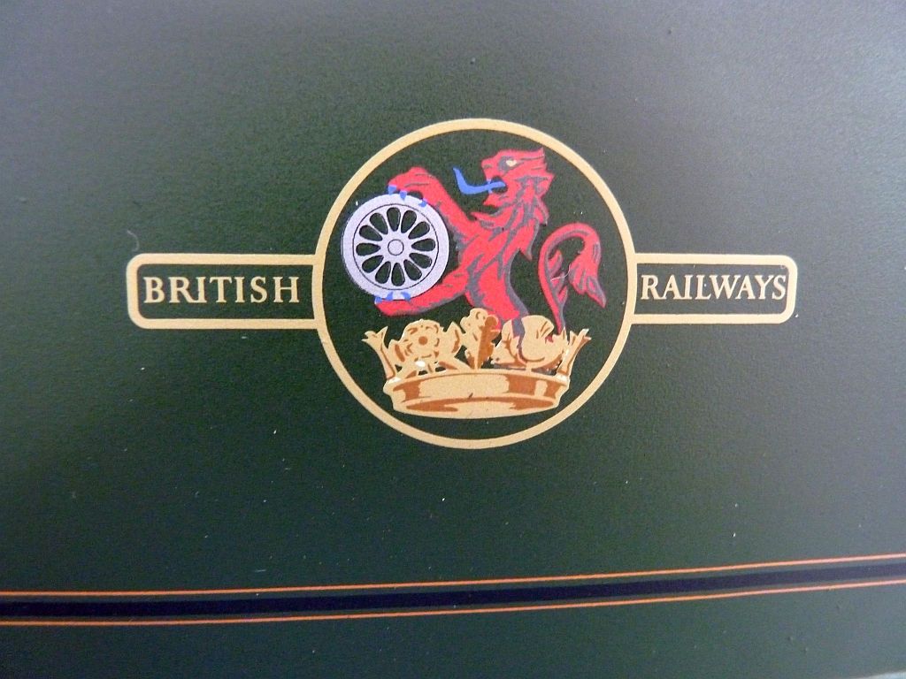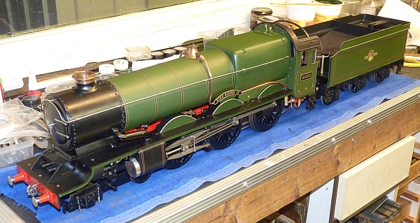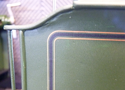 It's then been mainly a case of painting the boiler, cab, tender etc. which is a job I've been putting off as I hate it! Probably because I am not that good at it. Tony had bought some aerosol cans of BR green from a well known model paint supplier but it was absolutely awful stuff and I just couldn't get on with it. The cans put far too much paint on and it just ran everywhere. Eventually I got some brushing enamel from Craftmaster Paints and tried that. It is possible to spray it but I didn't get that good results so finished up brush painting it with more success. It was a case of putting on a lot of coats and rubbing down in-between each one. I finished off with T-Cut and got quite a nice smooth gloss finish. After refitting the boiler to the chassis, the loco was exhibited on our N25GA stand at the Large Scale Model Railway Exhibition in March. Unfortunately, the new owner when he saw it decided that he would like it satin rather than gloss. Much muttering! I could have used satin paint in the beginning rather than gloss! My friend also wanted the loco lining - even more muttering as I was hoping he didn't! Tony had already bought a set of lining transfers from Fox Transfers so I had a go with those. They recommend putting the transfers on a gloss finish rather than a matt or satin finish as they stick better so at least my efforts with the gloss paint weren't wasted. I wasn't really sure what to expect with the transfers as the last time I used any was when I was a kid building Airfix plastic kits. I was not looking forward to this at all. Most of the transfers were long lines consisting of a wide black centre with a thin orange line either side with separate matching corners. There were also some single thin lines and two sizes of the BR Lion crest for the tender. I decided to have a go at lining the boiler bands first as they just needed the straight black lines with the orange edges. The bands were stretched out flat by pinning the ends down to a piece of wood so I didn't have to worry about holding them. (Actually, the boiler bands are much wider than they should be but I wasn't going to make new ones). The instructions say to soak the transfers in warm water with a spot of washing up liquid in it until the transfer can be slid off the backing paper. So I cut the first strip from the sheet and soaked it in the warm water. I must have left it too long as it floated off the backing before I got chance to get it out of the water and it all just got tangled up. That was one strip ruined before I had even started! I had visions of this all being a total disaster. I reckoned I now only had just enough strips to complete the lining so couldn't afford any more cock ups like that. Fortunately the second attempt went much better and I got the transfer out of the water still on the backing sheet. The instructions say to slide the transfers off the backing sheet sideways rather than lengthways to avoid pulling the transfer and breaking it but I couldn't see that working very well with a long straight line. Instead I held the end of the tranfer line in position on the end of the boiler band and slid the backing out lengthways along the boiler band carefully trying to keep the transfer line in the middle. I think the transfers are actually quite tough and it worked rather well. Where the transfer wasn't central I carefully moved it with a wet cotton bud until it was. That can be easier said than done though as it can be very difficult to move the transfer once it's stuck to the surface! You need a lot of patience for this job and a very steady hand. The first one came out quite well. Not perfect but acceptable. It got easier as I did the rest of the bands and got used to handling the transfers. Next I had a go at lining the tender. Not so easy? this time as this involved the curved corners that join the horizontal and vertical lines. The secret is to put the corners on first and then the straight lines. It's extremely difficult to do it the other way around and get everything lined up properly. To get the corners in the right place I made up paper templates and stuck them to the tender sides with masking tape. Getting the corners on without messing them up and getting them square is an absolute nightmare! It's so easy to get one side of the corner folded over and a devil of a job to get it untangled and straight again. I scrapped a few corners but fortunately there were plenty of those to go at. Once the corners are down and stuck it's relatively easy to put the straight lines on and line them up. Make sure you cut the lines slightly long so that they overlab the corners slightly at the joins. That's much better than leaving a gap. You can hardly see the overlap when the transfer is dry but a gap will be obvious.