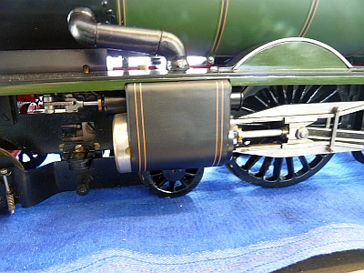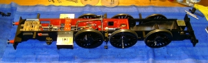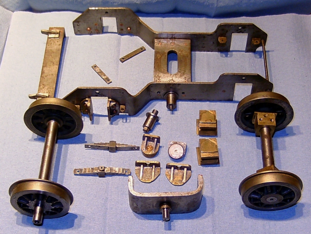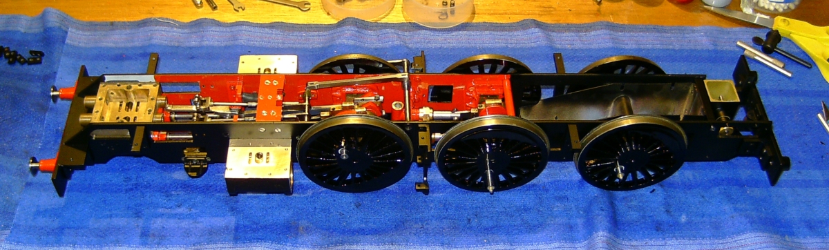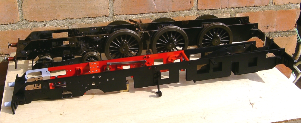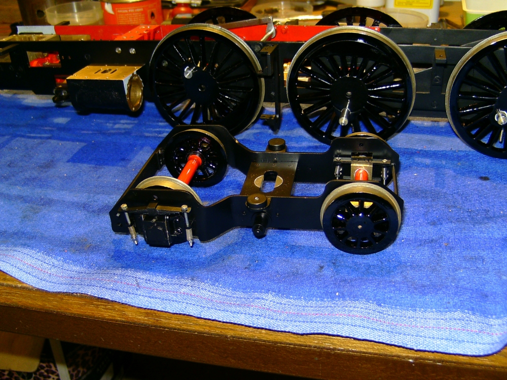 Kingette 1 with Kingette 2 ! 29/04/10 Rain stopped play in the garden this afternoon so I washed the front bogie in paraffin and dismantled it. A soak in thinners soon removed what little paint remained! There shouldn't be any work needed on the bogie so a clean up and a coat of paint should have this bit of the job done. The main parts of the front bogie after stripping off the old paint Some of the parts that I thought were castings e.g. the front horns, are actually fabrications soft soldered together. The leaf springs on the front axle of the bogie are purely 'cosmetic' and far too stiff to actually work. The actual springing is taken care of by coil springs between the dummy leaf springs and the spring hangers. Now I've had a closer look at the bogie frame, I am even more certain it is the one made by Mr Marchant and pictured in the Model Engineer article. I still think the loco is possibly the one in Hollingsworth's book but without seeing the original photo it is impossible to say for definite. The only difference I can see is that the loco in the book has different shaped buffers and stocks. The stocks appear to be parallel sided whereas 'Our' Kingette has tapered ones but they could have easily been replaced later. In the photo, the loco is in unlined condition with what appears to be the GWR roundel (shirt button) on the tender which was used between 1934 and 1942. That would tie up with the age of the loco. 'Our' Kingette has been repainted at some time in the past and sports the earlier pre 1934 lined colours with the full Great Western lettering on the tender. This could have been done anytime after the book photo though. There are still traces of the original green underneath the new paint and inside the boiler cladding. It looks a bit bright though compared to the correct green. I suppose what would prove the matter is if the original roundels were still underneath the new paintwork on the tender. We'll have to wait and see! The weather forecast for the next two days looks very wet so a good excuse to spend the time in the workshop instead of the garden! 08/05/2010 The weather over the last week hasn't been good so more progress has been made on the Kingette. I've fitted the outside cylinders, just the bare cylinder blocks, as it would be very difficult to get at the bolts that fasten them if the inside motion was fitted first. I've replaced the original bolts with studs and nuts, although on assembly I found that one of the studs fouled the exhaust connection to the cylinder. As I didn't want to leave one of the fixings off, I replaced the stud with a hex head bolt with the thickness of the head reduced by about half. The actual exhaust 'system' is a bit of a nightmare and the connections to the outside cylinders consist of a sort of U shaped manifold bent up from copper tube. This connects via threaded sleeves to right angled elbows fitted into the cylinders. The idea is that you pass the copper pipes through the motion bracket, screw the sleeves all the way on to the ends of the pipes, screw the elbows into the cylinders, and finally partly unscrew the sleeves again until they screw onto the elbows. The exhaust pipes and connections to the outside cylinders I was not very keen on refitting this system as I had visions of not being able to get the threaded joints to seal. I did temporarily do a trial fit but the ends of the copper pipes did not line up with the stubs on the elbows very well and the sleeves were a very poor fit on the pipe and the elbows and would have had to be remade. In the end I decided to replace the sleeves with short lengths of thick wall silicon rubber tubing which merely pushes onto the pipe and the elbows. I reckon this should be ok as there is very little pressure to deal with and the rubber should withstand the steam temperature without problems. It will certainly make connecting things up a lot easier when the time comes! Once the outside cylinders were in place, the crank axle could be installed along with the inside motion. This was a fiddly job and I could have done with two pairs of hands to hold everything whilst I fitted nuts and bolts etc.! I managed it eventually though and felt that I had reached a bit of a milestone in the rebuild. It was starting to look like a loco again! The other two axles were fitted without problems and once more I had a rolling chassis. Back on wheels again! The chassis is a bit stiff at the moment as I haven't oiled anything yet. There's bits of touching up to do on the paintwork and all the screw heads will need painting so I didn't want oil all over everything just yet. The front bogie has been painted and reassembled but I think the front coil springs will need changing for softer ones. It takes a lot of weight on the front axle to make the axle boxes move! Front bogie reassembled I've fitted the lubricator but still haven't sorted out how to connect the oil feed to the cylinders. I think the only easy way is to split the main feed into three at the cylinders, one to feed each outside cylinder and one to feed into the steam chest for the inside cylinders. So long as all the pipes are more or less the same length, everyone should get an equal share of the oil. I think if I were to build one of these locos from scratch, I would redesign the steam supplies to the cylinders and make the outside steam pipes dummies. The real ones are going to be a right so-and-so to connect up. I was going to fit the top and bottom connections to the axle pumps so that I could refit some of the pipework but realised I haven't got any 3/16" stainless steel balls to replace the old ones so that will have to wait until I've got some. I'm also getting low on nuts and bolts etc. so will need to stock up on those soon. For something different to do, I started to strip down the tender ready for repainting. I did strip some of the paint off the tender sides but there was no trace of any existing GWR roundel underneath unfortunately. I