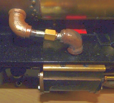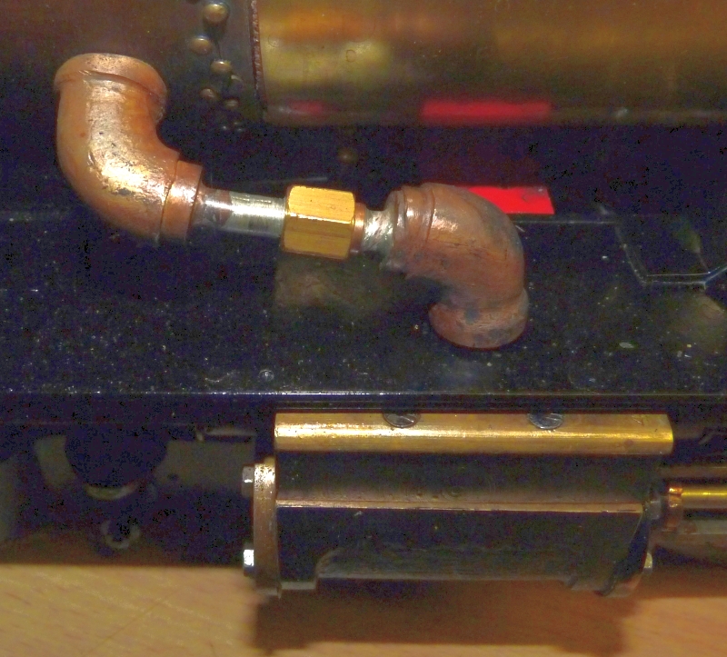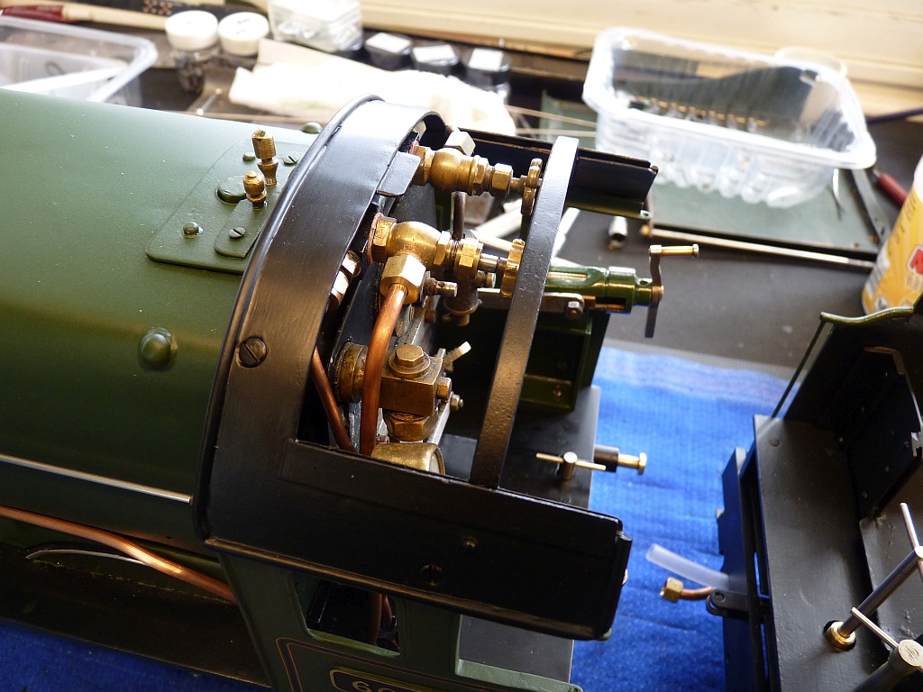 The firebox cladding was refitted with great difficulty and many hours spent with filler to get the joint with the barrel looking nice and neat. A new injector has been fitted along with the pipework. The original feed pipe ran between the frames but I managed to run the new pipe in the correct postion. The original idea was to have the feed clack in the top feed as for the handpump but I decided this wasn't going to be very easy to do. The clacks are 'upside down' and the balls need to be held onto the seats by a spring. That works fine for the handpump but I think I would have needed a really light spring on the injector feed and I couldn't find anything suitable to make such a spring. In the end I abandoned the idea and fitted a separate normal clack at the injector itself.