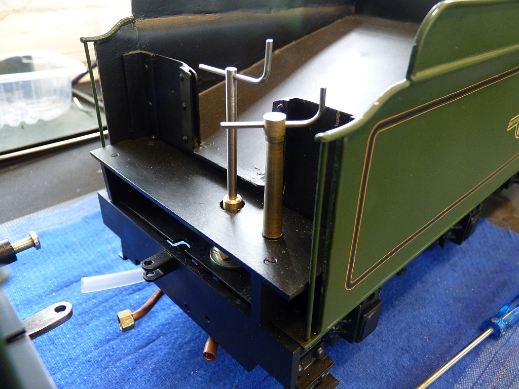 The tender body needed a fair bit of work on it. The top edges were badly bent and needed straightening and the beading was coming away in places and needed resoldering. The original water valve for the injector was scrapped and a new one made. The original was a push pull thing that was very stiff to operate and was only suported by the pipework. I made a nice 90° turn one with a PTFE plug that is bolted to the tender soleplate. Thinking about it afterwards, I should have moved the position of the valve so that it replaced the dummy tender handbrake column. That would have looked better but too late now. I'm not altering it now.