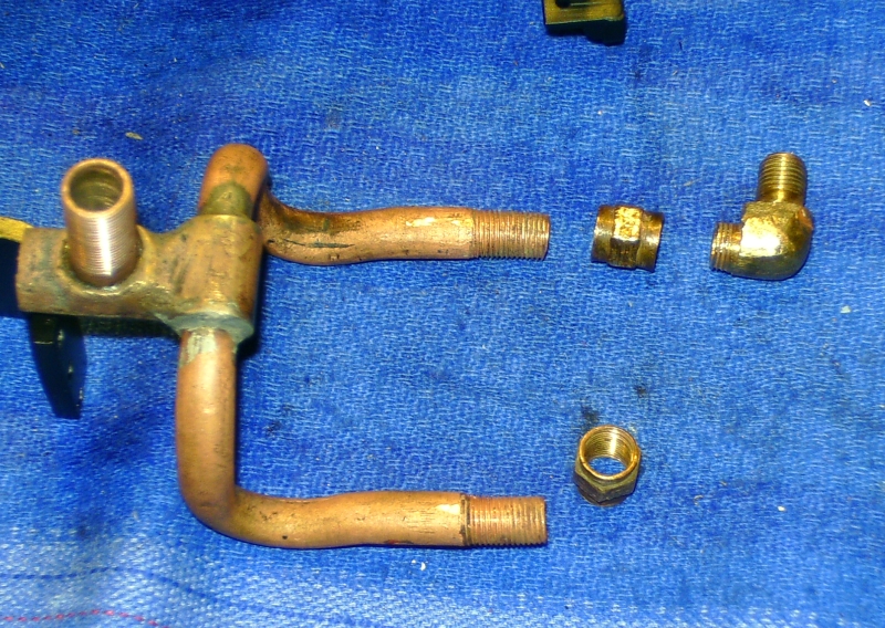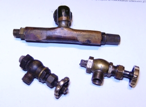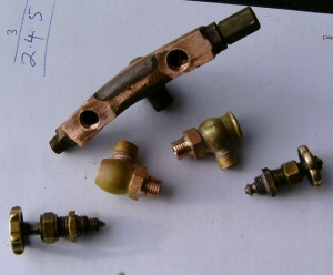 6 02/02/10 I've stripped down all the chassis again in preparation for painting and have been busy filling in 'spare' holes and generally tidying things up. The running board brackets are now secured to the frames with 2 screws instead of just one at the bottom and I've fitted a bit of brass angle to the top of the outside motion brackets to take another fixing screw for the running boards which were unsupported in the middle. I've also fastened a piece of angle under the front of the running boards to secure the front curved sections a bit better. Originally, they weren't fastened to the top running boards at all and were just held with one screw into the front buffer beam angle. Whilst waiting for some filler on the frames to dry, I had a look at the steam turret and the two valves that screw into it. The turret is built up from a bit of copper bar and some bronze (I think) and the two valves screw into this. The original threads were only 3/16" diameter and one valve had actually snapped off when I tried to unscrew it. The other valve was only 'hanging on' by about one thread and could have easily come out under steam. The bodies appear to be brass which is probably why one snapped off. Before 'restoration' They are very nice little valves and I wanted to retain them so I drilled out the threads in the turret and retapped them 7/32"x40. The valve bodies were then put in the lathe and the original threaded stubs cut off. The bodies were then drilled out to a depth of 1/8" to take a new stub made from phosphor bronze which was then silver soldered in and threaded 7/32"x40 to match the turret. After retapping turret and modifying valve bodies The turret doesn't have a whistle valve although there was a very small whistle mounted under the righthand running board. It has obviously been removed at some time and may have fitted on the end of the turret that has been blanked off. The other connection on the turret is for the pressure gauge. Another 'quickie' job was to remove the remains of one of the regulator boss screws that had snapped off in the boiler backhead bush when I removed the regulator from the boiler. I'm not sure if the screws are stainless or plated mild steel, the one that snapped looks like mild steel to me. Fortunately, I managed to drill it out and retap the thread without too much trouble. 27/04/10 A long time since the last update but I have been working on the King when time permits. At the moment it's time for the garden and there's an awful lot to do in there! The frames and wheels have been painted and I've begun the fiddly task of refitting all the motion work which I hope to have done in the next week or so.