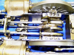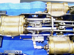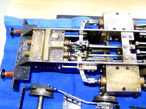 I think friend Tony must be aiming to have his own fleet of Kingettes! He purchased this chassis recently from another member of the 2½" Association who had decided he would not get around to finishing it. All that it needs is the valves and the reverser to complete an air running chassis. It's an interesting aquisition as the valve gear has been built more or less to the 'words and music' but with a few alterations to get it to fit. The chassis is very stiff despite several dosings of WD40 and oil but this may be down to the piston packing being very tight. At some point I will dismantle it, clean it up, and then reassemble it. This will give me the opportunity to measure the valve components and compare them with the original drawings as it's difficult to do this in situ. One thing that is immediately apparent is that the weigh shaft has been moved further back and also lowered. This may get around the problem of the ends of the lifting arms hitting the bottom of the boiler barrel. 27/04/10 I grabbed a few minutes the other day and quickly removed the cylinders and valve gear for inspection. The stiffness seems to be caused by one of the inside crossheads being very tight in the slide bars which are being pinched together by the motion bracket. At first glance everything looks well made although there are a few holes that have been drilled and then moved (probably to get things to fit) and the frames don't have the cut outs in the rear or at the front. All in all, the chassis should be a good start for whoever gets to finish it and will require much less work than Kingette number one!