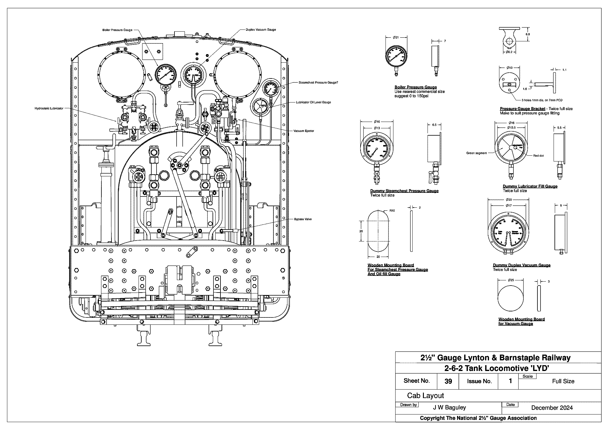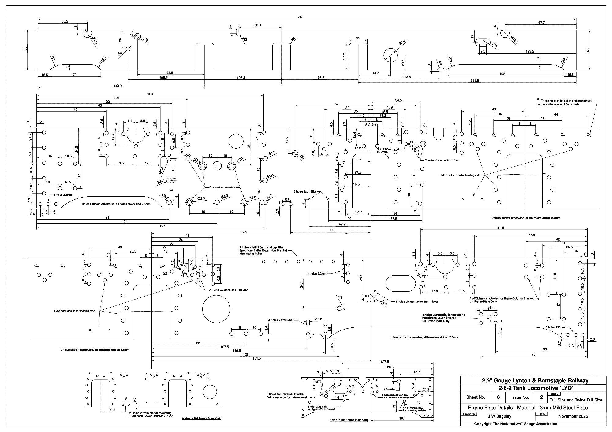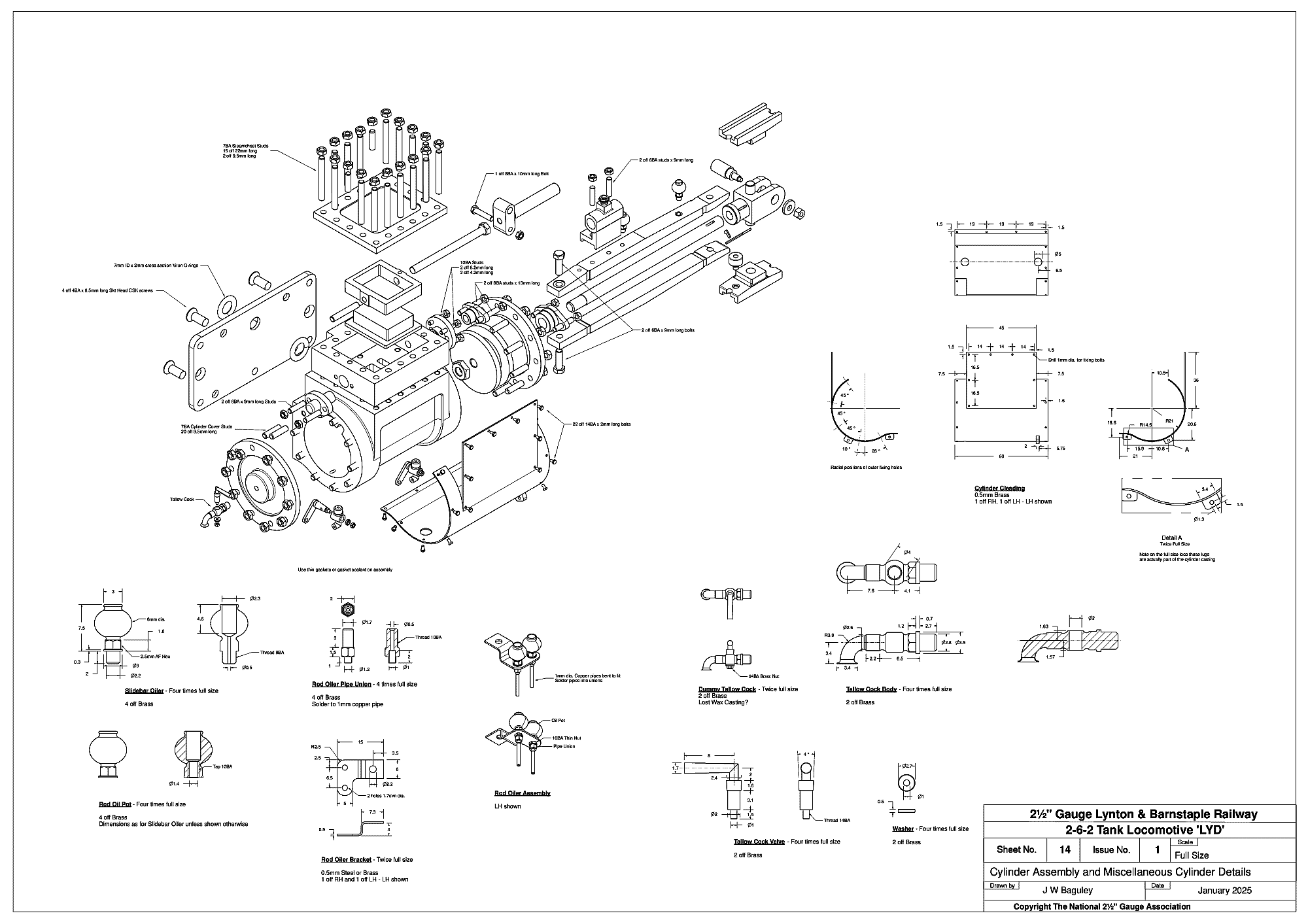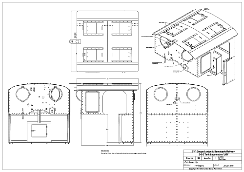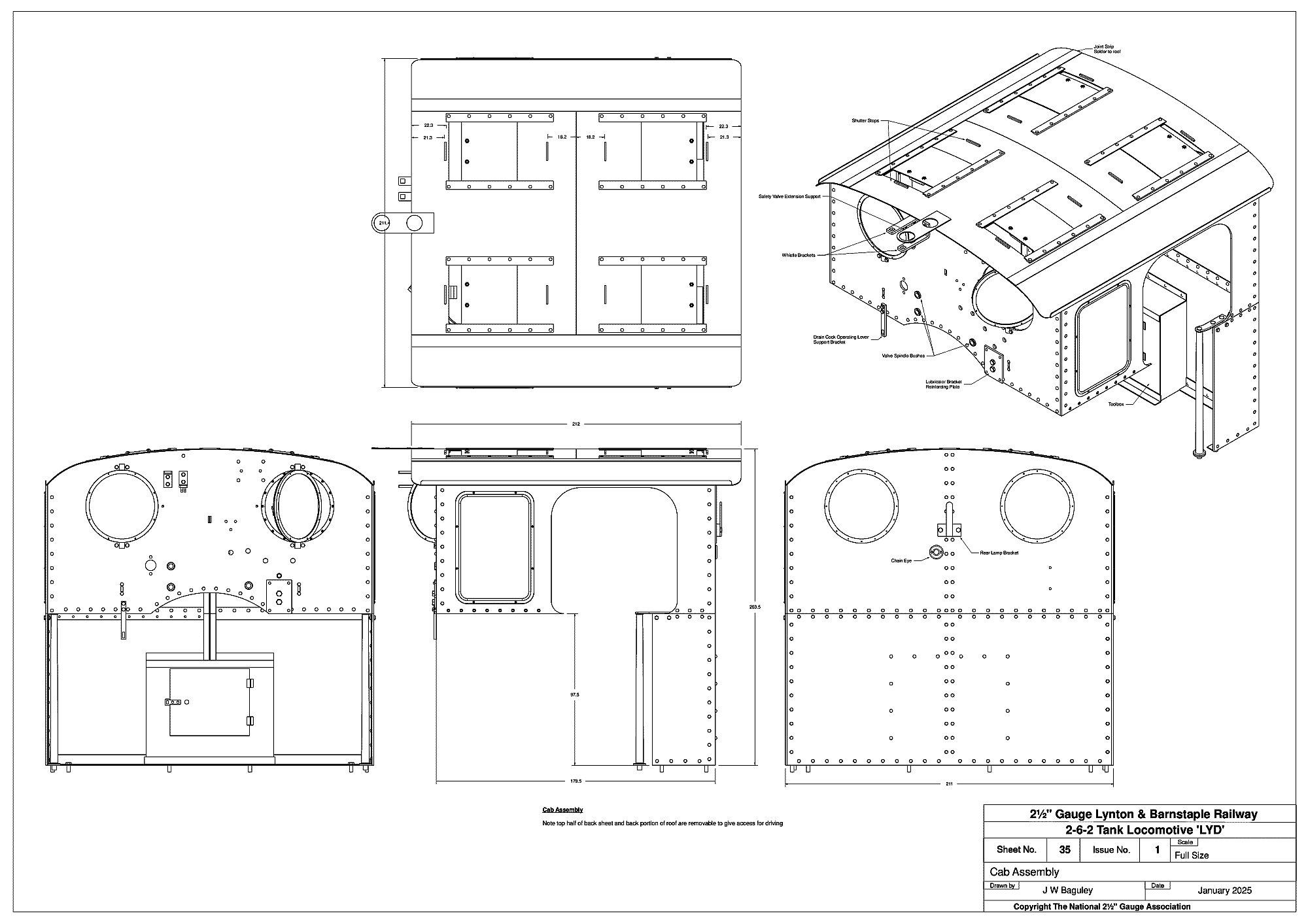 05/12/2025 This is a locomotive that I have designed for the National 2½" Gauge Association. It was originally started by Clive Young as a personal project but fell by the wayside so the Association has taken it over. It has been designed using 3D CAD and original works drawings for 'LEW' which the new build full size loco 'LYD' has been based on. It has been about three years in developement and drawings are now available from the Association. The drawings consist of 48 sheets and are very comprehensive. Rather than describe the build of the prototype on my own website I have decided to put it on the Association website instead but I will put some updates here as well. You can access the build notes here: Laser cut parts will be available from Model Engineers Laser (some are already available) and castings are in progress. Sample drawings are shown below. Clicking on them will take you to a larger image.