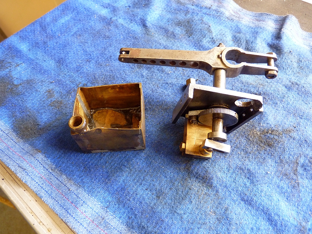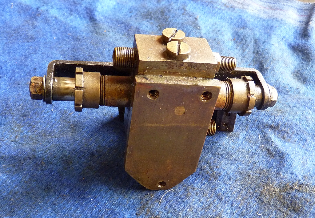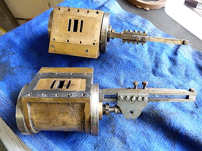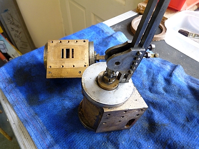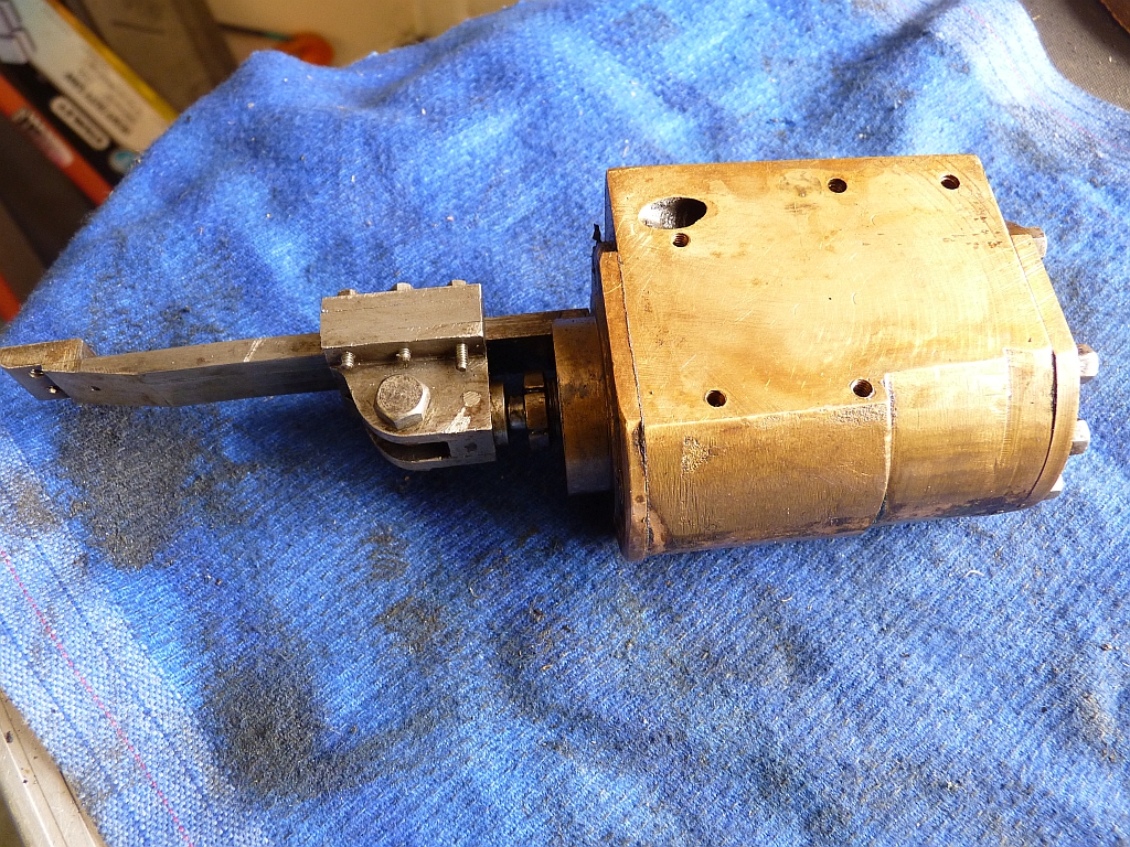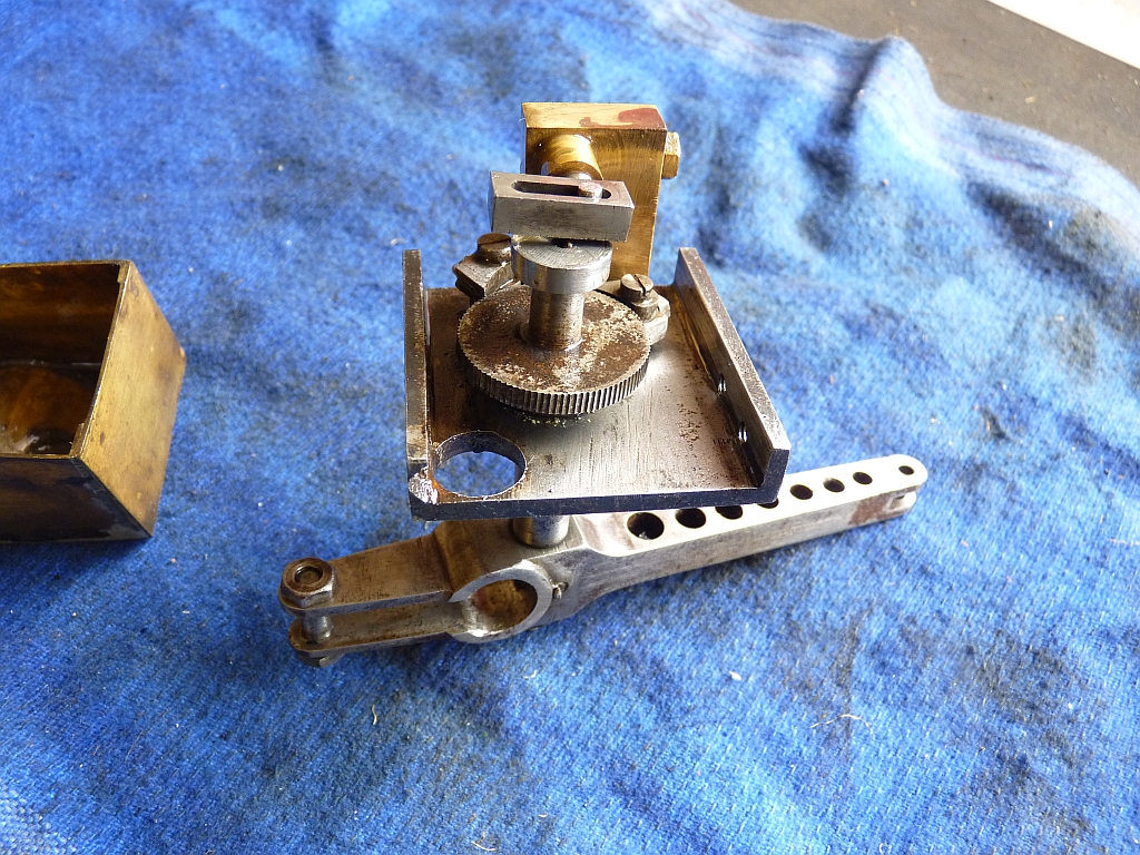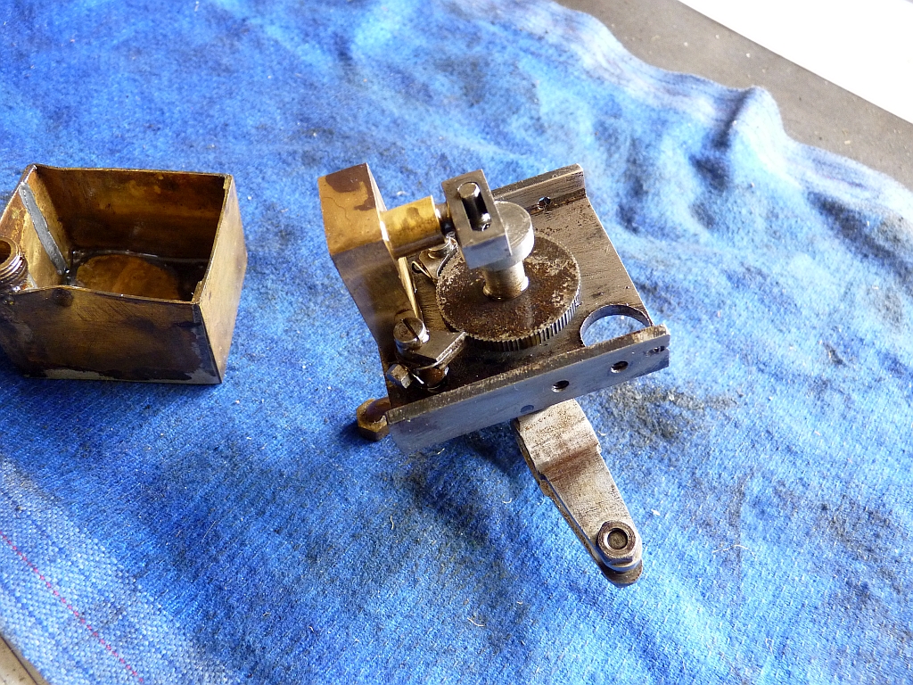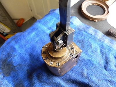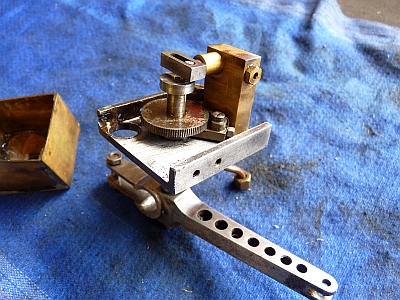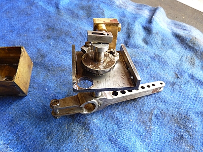 The last thing to come off was the lubricator assembly. As mentioned earlier, this is driven directly by the two to one lever for the conjugated drive to the inside valve. The pivot shaft for the lever fits in a bearing housing on top of the lubricator and extends down inside the lubricator to operate a pawl and ratchet drive to the pump ram. The shaft has a tight spot when it rotates and I suspect that the shaft may be bent slightly.