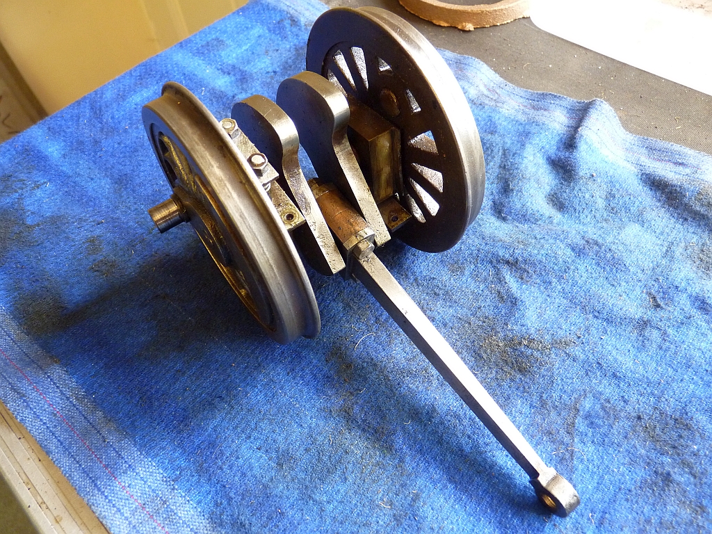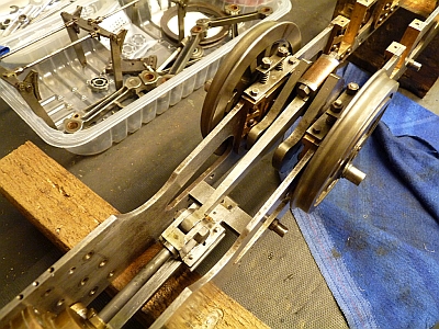 I decided to use hex head bolts to secure the slidebar rather than countersink head screws as used originally so that by making the holes in the stretcher a little oversize it is possible to move the end of the slidebar slightly to get perfect alignment. One thing that I noticed earlier was that the slidebar is not central in the frames - it's to one side of the centre. I think that's probably due to an error when the slidebar was originally fitted to the cylinder end cover rather than it being done deliberately. 14/05/2018 Only managed a quick hour in the workshop tonight but fitted the crank axle and the inside connecting rod.