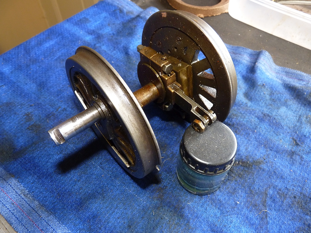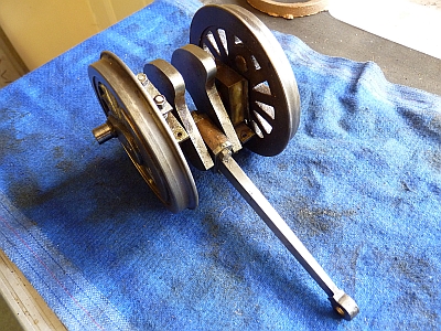 The wheel must have had a right bang to do that much damage and I'm not sure what to do about it. It might be alright if I just leave it or should I have a go at repairing it somehow. I don't fancy trying to silver solder it which would be possible. Another way would be to machine part of the back of the wheel either side of the crack and fit a piece of steel to rebuild the tread and support the tread either side of the crack. One of the Kingette wheels had had a chip in the flange repaired like this and it seemed quite successful although in that case the wheel wasn't actually cracked. In the meantime I've primed the rear frame and given it a coat of satin black paint so when that is dry I can start to put things back together. 12/05/2018 I haven't made my mind up yet what to do about the damaged wheel. To do a proper repair really means taking the wheel off the axle and as the wheel is not pinned that would mean having to quarter the wheels again when the wheel is refitted which would be a pain. I could drill and fit a pin before I took the wheel off I suppose. I did look on the Reeves 2000 website today and they do do a wheel casting which pretty much matches the wheels on Monstrous. It doesn't say what they are intended for and they don't match any of the current 3½" gauge designs that they advertise. They could be for a design that they don't sell any more. For the time being I gave all the wheel assemblies a good wash in paraffin and then blew them dry with the airgun. Some of the bearings feel a bit rough but I'll see what they are like when I've oiled them. I don't want to have to change any of them if at all possible. By way of a change I had a look at the inside cylinder. I removed the rear cover so that I could inspect the piston and the bore and both were pretty dirty with a lot of black gunge inside. I think it was probably bits of the graphite packing used on the piston rather than dirt and grit. I gave the cylinder and piston a good clean with paraffin and they didn't look too bad afterwards. The bore is a bit scored but should be ok as the scoring is not very deep. I think it is all down to lack of oil again. The piston is still a good fit. As mentioned before, the slidebar is quite badly galled but should clean up with some emery cloth. I'm not going to replace it. However, I did notice that it was bent which wouldn't have helped matters!
