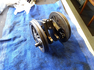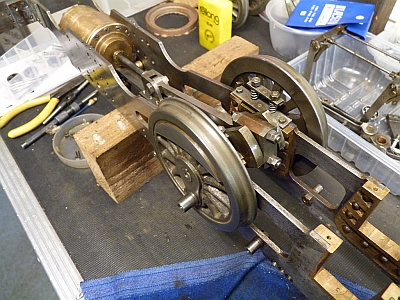 Both rims fitted Hopefully I have got the fits right and it just now remains to machine the treads which I'll do between centres. Nothing should move as the wheels are pinned to the axles and the quartering will not be affected. 10/05/2018 I seem to be getting back into the workshop again now after having a long absence due to the leg problems so I decided to drag Monstrous out of hibernation and get back on it. I've decided to go over the complete chassis and at least get it running on air before attempting any repairs on the boiler. The motion was very stiff and I think this was mainly due to a lack of lubrication to the cylinders. I suspect that the lubricator was not working very well, if at all. Granted the loco has not run in a long time but there was no sign of any oil in the valve chests. The chassis was very dirty and rusty in places so I thought it best to strip everything off it and give it all a good clean. It all came apart quite easily as most of the bolts and screws were loose and in fact there are quite a lot missing altogether! It looks as though someone has had it to bits and not put it back together very well. The only difficult part was getting the connecting rods off the crankpins. The big ends use ball races and they were an extremely tight fit on the crankpins. I had to make an improvised puller to get them off and even with that it was a struggle. Once they were removed I could remove the coupling rods and the rest of the wheel assemblies.