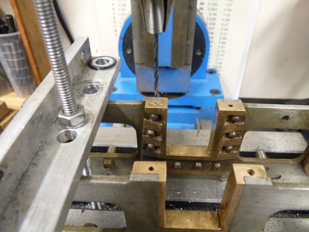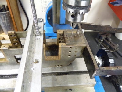 The horns are massive and are probably castings for a 3½" gauge loco. They need to be wide though to take the ball bearing axle boxes. I guess that the wheel castings are also from a 3½" design as the treads are far wider than on a 2½" gauge wheel. The trailing frame seems a bit flimsy considering that the loco will be a powerful beast with such large cylinders and I'm sure it would bend if you tried to pull a really heavy load. It's also just brazed together with butt joints and no reinforcement. I think I would have fitted angles in the corners to make the assembly a lot stronger! There were a few broken bolts in the frames that needed drilling out and retapping so I did this job next by clamping the frames to the table of the small mill. There are two blocks at the rear of the side frames that take a pivot for the steam brake actuating lever and two of the securing bolts had been sheared off. I managed to shear off the remaining two when I tried to remove the blocks so all four of these had to be drilled out.