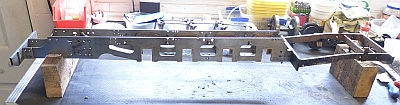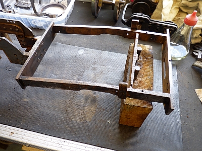 Once the frames were stripped I set to with a wire brush to clean all the rust off them. The side frames are just bare steel and had never been painted but they had a fair bit of oily gunge on them which had probably kept any serious rust at bay. The steel trailing frame is a brazed up fabrication which had been painted black at some time but most of the paint had come off and the frame was badly rusted.