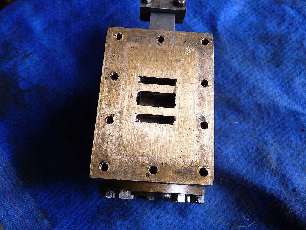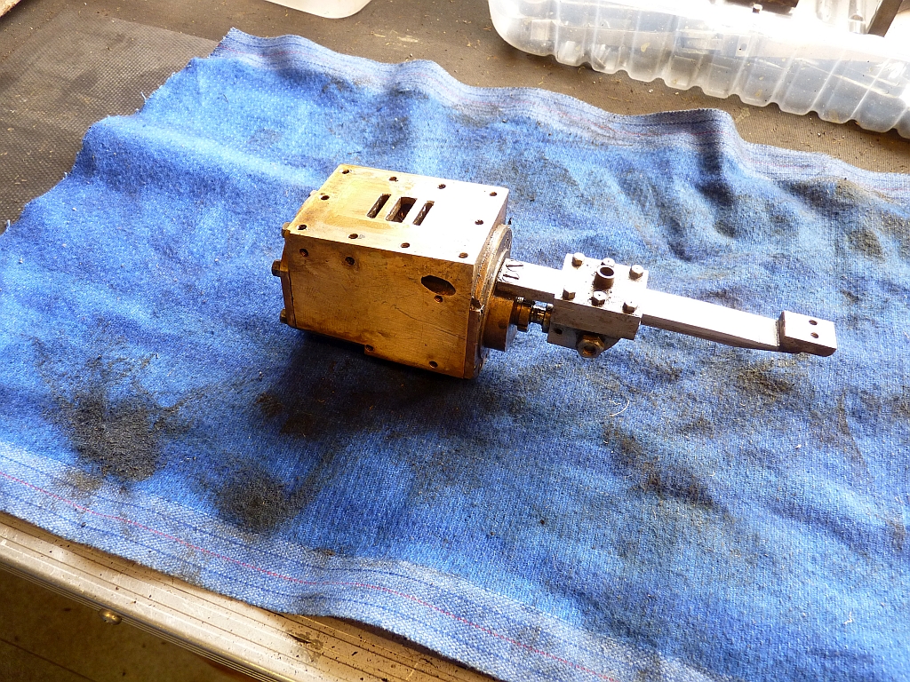 I managed to straighten it with some judicious thumps from a plastic hammer on a steel block and then rubbed it smooth on a surface plate and carborundum paper. It's not perfect but it will do. Next I turned my attention to the crosshead which is a built up affair bolted together. The bottom piece mounts on the piston rod and the top surface bears on the underside of the slidebar. There are two spacers that go on top of this and bear on the sides of the slidebar and finally the top plate that bears on the top of the slidebar. The top plate is fitted with an oil cup for lubrication but I don't think it had seen much use! It's all held together with three bolts on each side. It was all a pretty poor fit and needed a lot of fettling to get it to run nicely on the slidebar with no play.