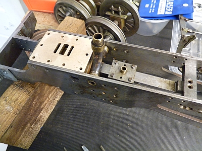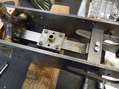 I then assembled the cylinder and slidebar to check the fit of the crosshead pieces. As I had skimmed the top surface of the bottom piece, there was now a gap between the running surface and the slidebar. That's not a problem as I'm going to fit a phosphor bronze shim to take up the gap. I've ordered a piece today as I don't have any to hand. I'm also going to fit a similar shim to the top plate. This will mean that the main bearing surfaces on the crosshead will be bronze rather than mild steel and that should be much better than before. For the time being I've made a shim out of some nickle silver sheet that I've got that happens to be the right thickness. With the shim in place the bottom part of the crosshead slides nicely from one end of the slidebar to the other so everything must be parallel. The two side blocks had to have the bolt holes through them enlarged so that they could be adjusted to give a nice fit on the sides of the slidebar. With the holes as they were originally, the fit was very poor. I then fitted the top plate and the crosshead seems to fit quite well now. It is a little tight when it gets to the cylinder end of the slidebar but I can adjust that when the bronze shim stock arrives and the crosshead is fitted permanently. I next reasembled the inside cylinder and fitted it back in the frames to see how the slidebar aligned with the stretcher that the end of the slidebar bolts to.