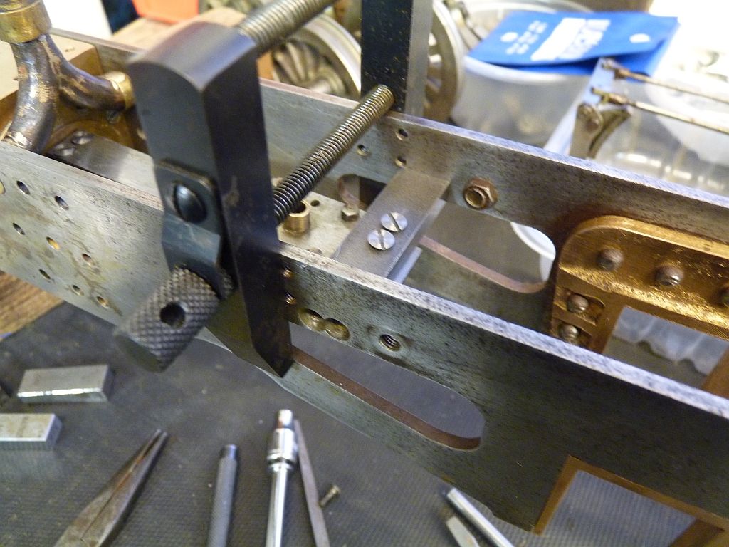 Of course, the mounting holes in the stretcher don't line up any more now that I've straightened the slidebar! The two holes that take the screws that go into the end of the slidebar aren't too far out and I could 'adjust' those to make them line up. However, the mounting holes for the screws that hold the stretcher to the frames are miles out as the stretcher is a lot higher than it was before. I could machine some off the bolting face on the end of the slidebar which would mean the stretcher would sit lower down. The top surface of the bolting face is not perfectly flat so it could do with remachining anyway. It might be best to just make a new stretcher as it is only a piece of flat bar with some holes drilled and tapped in it. 13/05/2018 I spent most of today at the club at Whitwick helping with a charity event but I managed a couple of hours in the workshop tonight. I took the slidebar off again and skimmed about 0.030" off the bolting face to square it up and also to lower the mounting stretcher. I then refitted it and made a new stretcher altogether. I adjusted the position of the two holes for the bolts that fastened the slidebar to the stretcher so that they were now in the correct place. I fitted the new stretcher to the slidebar and held it securely into the frames with a clamp so that I could spot through from the frames for the two screws each side that go into the ends of the stretcher.