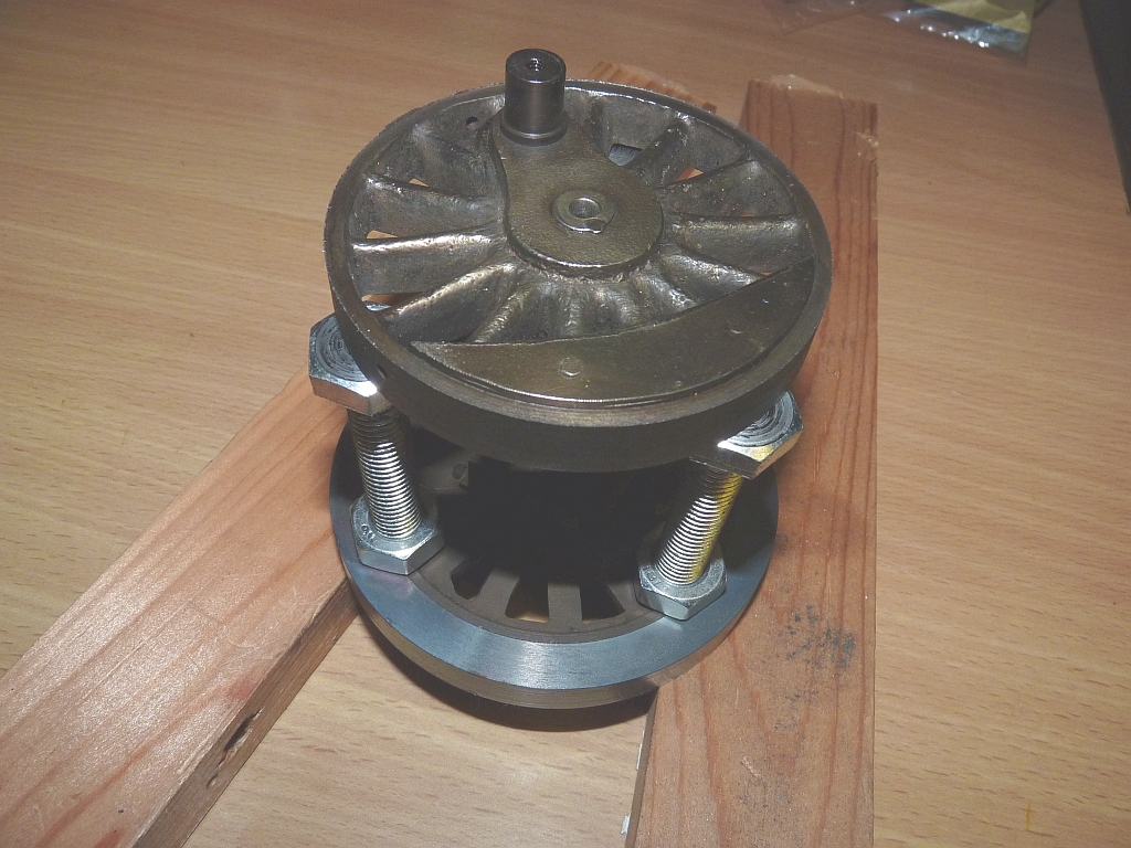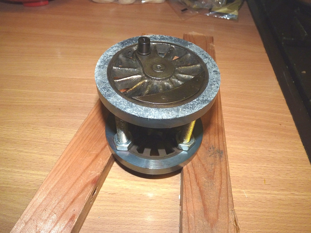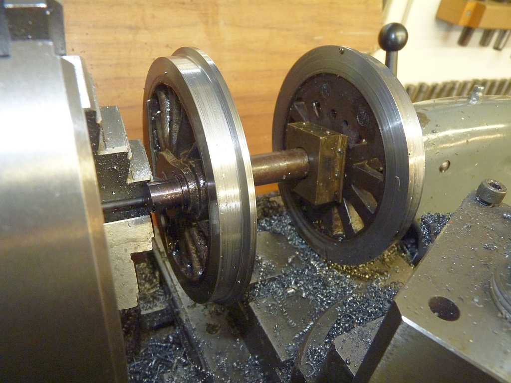 12/11/2017 I can't believe that it's over two years ago that I last wrote anything here! I've been tied up with other projects though and also have been somewhat incapacitated over the last twelve months due to my leg problem. That is much improved now and things are slowly getting back to normal. I decided to spend a few hours in the workshop and make a start on the new wheel rims for the trailing wheels to replace the Vee shaped ones. As mentioned on the previous page, I had been given a couple of steel blanks to make the new rims so it was just a matter of maching them to size and fitting them to the wheel centres. The blanks were much thicker than I needed and it took quite a time to machine off the excess. I used the Denham lathe to rough machine the blanks to thickness and then rough bore them to take the wheel centres. It's nice using the Denham as it has the power feeds on both the saddle and the cross slide but I was a bit disappointed with the performance of the lathe as it proved impossible to take a decent cut without a lot of chatter. This had been apparent when I had machined some wheels for a 7.25" B1 and I suspected that the main spindle bearings on the lathe were not adjusted properly. Setting up a dial indicator on the chuck and using a length of wood as a lever against the bed to try and lift the chuck showed that there was indeed a lot of play in the two main bearings at the chuck end of the spindle. I took the top off the headstock and tightened up the adjusting nuts as much as I dare without making the spindle stiff to rotate. This did improve matters considerably but it's still not right and needs further investigation. I hope the bearings are not shot as it will be virtually impossible to find suitable replacements. Even if I could find some, the cost would probably be more than the lathe is worth! Anyway, I got the blanks rough turned and then used the ML7 to finish them to size. I intended to shrink fit the new rims and so bored them smaller than the diameter of the centres. I used the rule of thumb of 0.001" per inch of diameter plus 0.001" smaller than the centres. The centres are near enough 3 inches in diameter so I made the bore of the rims 0.004" less than that. To fit the rims, I cut three bolts to fit between the two wheel centres, fitted them with nuts and tightened them gently to hold them in place between the edges of the centres. This gave me three 'stops' for the new rims to drop onto and align the backs of the rims with the backs of the wheel centres.