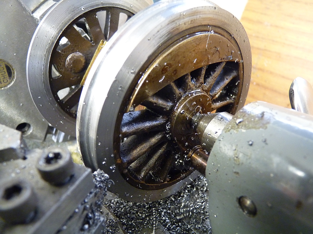 The first job was to machine the rims to the finished diameter of the flanges and machine the front and rear faces. The rims had a little bit of wobble on them which the machining eliminated fortunately. Next, on to machining the treads. I managed to find a HSS lathe tool with a Vee shape and a suitable radius on the end that matched the root radius of the existing wheel treads and used that to machine the new treads. The topslide was set over to an angle of 2° to put the coning on the tread and the straight part of the Vee of the tool was set to match the angle of the flange which is about 10°. That way, you can machine the whole tread just using the topslide and the tool automatically machines the radius at the root of the flange and also puts the correct angle on the flange at the same time. It does get a bit hairy when you get part way through machining though as the tool has a large area cutting on the edge when you get to the flange and it's difficult to eliminate chatter. I struggled with chatter all the way and had to take very shallow cuts at a very slow spindle speed otherwise the chatter and noise was horrendous!