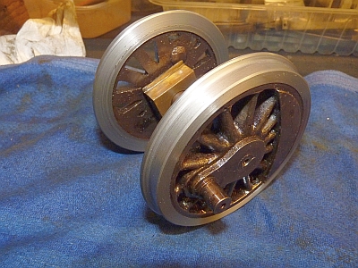 I noticed several more of the holes in the bottom of the horns looked as though they had had broken bolts in them at some time that had been drilled out. They may need further attention when the time comes to fit the hornstays again. A lot of the problem is due to some of the bolts being 3/32" Whitworth which was a common size when this loco was built. Unfortunately, they are not very strong due to the coarse thread and are easily broken if overtightened or rusted in place. 11/05/2018 Having cleaned up the rear frame I gave it a coat of rust treatment to kill any remaining rust. It says to leave this for 24 hours before painting so I decided to have a go at machining the new rims on the trailing wheels. The best way seemed to be to mount the axle between centres as the axle had already been centred at each end. I chucked a homemade cente which I had made for a previous job in the three jaw chuck and as luck would have it, the crankpin of the wheel nearest the chuck rested nicely on one of the chuck jaws which acted as the driving dog. The other end of the axle was held with a centre in the tailstock.