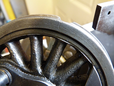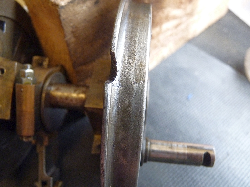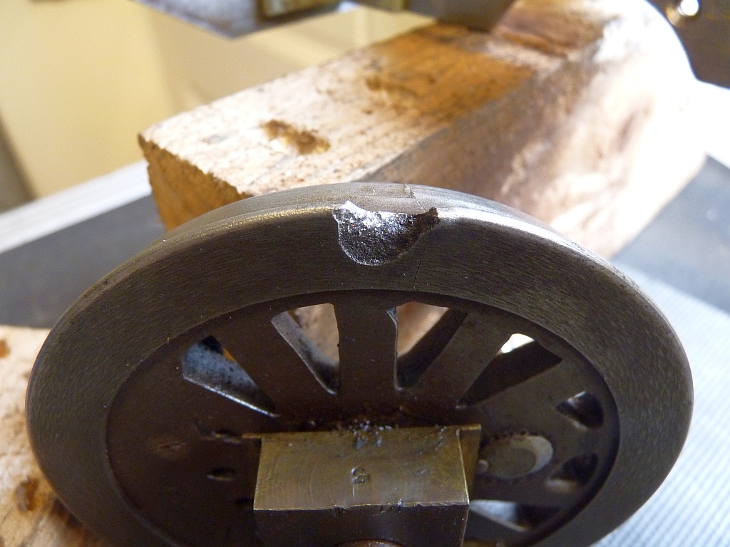 When I was looking at the other wheels I suddenly noticed that one of them had a big chip broken out of the flange which I'm sure I hadn't spotted before. It's obviously been done for some time as the surface of the wheel where the chip broke off was tarnished. Unfortunately, the damage is worse than that as there is a crack all the way through the tread where the chip is and also one of the spokes is cracked all the way through.
