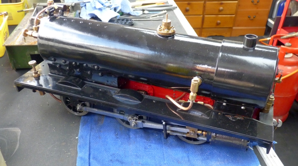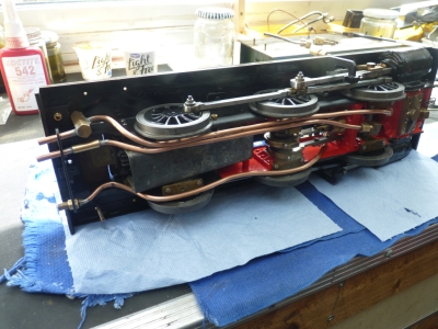 The 'before' shot! One thing I did not notice until now is that the end of one of the axles has sheared off in the axle box. It has obviously seaized at some point and maybe someone tried to force it to turn (not me) 23/06/2024 The boiler passed the 1.5X test with no problems so could now be mounted back onto the chassis. Frstly though, the smokebox and saddle were painted and mounted in place. The boiler was then fitted and all the pipework fitted after a good clean up. I didn't go over the top with the pipework as I didn't want the loco to look 'brand new' and just soaked the pipes in citric acid solution and then rubbed it with steel wool.