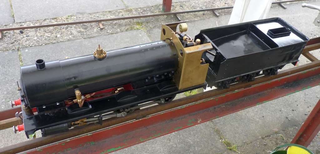 Last Sunday (July 28th) I took the loco to the club for another test run. This time the loco was a lot more stable and I felt happy enough to do four laps of the track. It still bobs about a little bit so is not perfect but this time I didn't have to worry about it leaping off the rails! The new lubricator seems to work ok and the loco ran very well indeed. It had no trouble tackling the bottom bend of our track which is also quite a steep gradient. It stormed up the hill when given a bit more regulator and never slipped once. The boiler steams very well and seems to maintain pressure with no problems. Other members present were very impressed and I was very pleased with the performance for such a small loco. I didn't stop on the track too long as there were other drivers with 5 inch locos wanting a run and I didn't want to get in their way. All in all a very successful run. I did check the lubricator when I got home and it was about half full of oil. That's after four laps of our track which is about 1 mile so it should last for a couple of miles before it needs refilling. There are now just a few more things to finish off. I made a cab roof and painted the cab and fitted it. I made a cut out in the rear of the roof to make it easier to see the pressure gauge and the water gauge. I think that looks much better than taking the whole roof off whenever you run.
