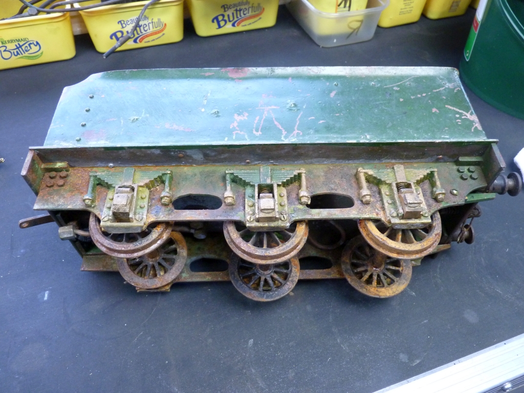 The regulator is not the disc in tube type as described on the drawings but fortunately is a nice screw down type instead. I much prefer those. The disc in tube type are dreadful and rarely seal properly, especially on a hydraulic test. I did modify the water gauge to take a piece of red stripe glass which is my preferred choice. It is slightly larger in diameter than the ordinary clear type that was originally fitted but the fittings were big enough to drill out to take the larger glass. I've just fitted the body of the safety valve for now as I will use that as the connection for the test pump. We have got a 2½" rally at Rugby this coming Sunday so I will take the boiler to that and get it officially tested to 1½ times working pressure now that it has all the fittings on it. I have also made a start on the tender. I have stripped it all down and stripped what little paint remained on the frames and the buffer beams. It was in a bit of a state, especially the wheels, but a good soak in rust remover will get those back to clean metal.