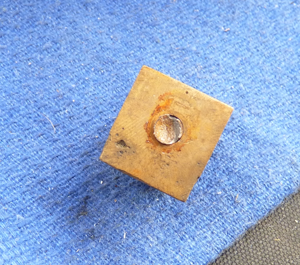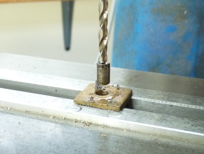 The plan was to drill out the broken stub slightly smaller than the diameter and then soak the axlebox in hot alum solution to dissolve the remains away. The axlebox was mounted in the milling machine and the irregular top surface of the broken stub milled flat with a 4mm centre cutting 2 flute endmill. The stub was then drilled with a 4mm drill. I wasn't expecting this but the stub broke loose after drilling about halfway through so that was a bonus.