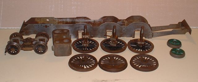 Another Ebay acquisition - this one consists of completed loco frames, front bogie, turned wheels and axles, and a set of cylinder castings. Quite well made to the design by LBSC.
