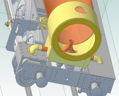 01/08/2012 I had a bit of a play today with the balanced slide valves. The exhaust will exit through the top of the valve and out of the top of the steam chest via a cast or fabricated fiting. The valve is fitted with a hollow balance piston which seals againgst the underside of the steam chest cover and reduces the area of the valve exposed to steam pressure, thus reducing the force pressing the valve onto the port face. The exit 'hole' in the steam chest cover is elongated so that it does not obstruct the flow of exhaust steam when the valve is at the end of it's travel. The exhaust pipes enter the smokebox through the sides of the saddle and sweep upwards to where they are joined. A baffle, or Kordina, will be fitted at the join to keep the two exhaust streams separate until they reach the blast nozzle/s. The Kordina prevents the two exhaust streams interfering and also helps to induce a vacuum in the two exhaust pipes, reducing any back pressure even further. Balanced Slide Valve Arrangement