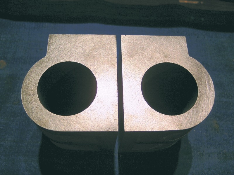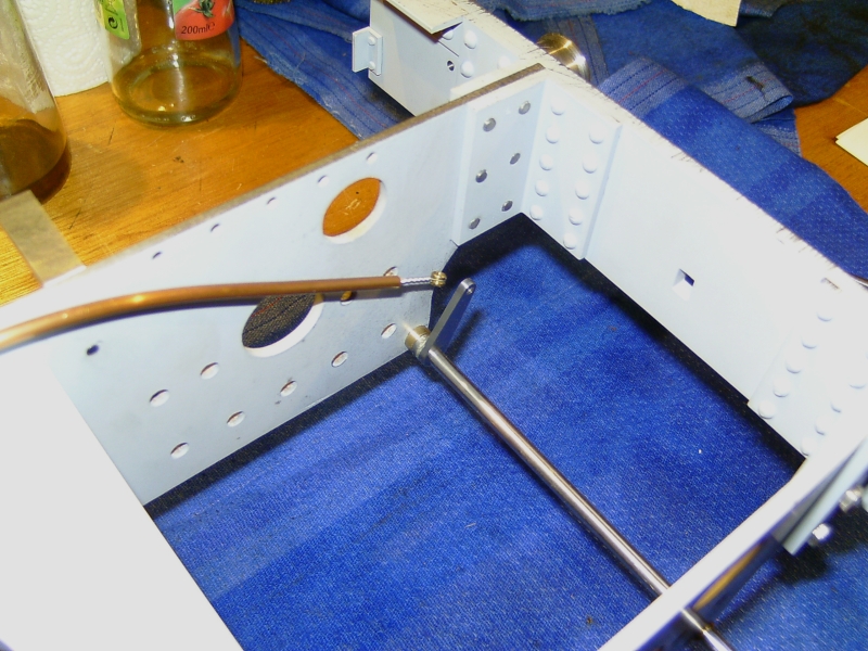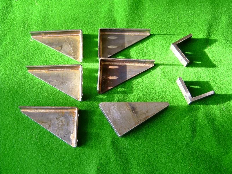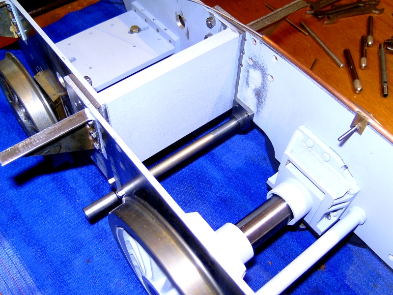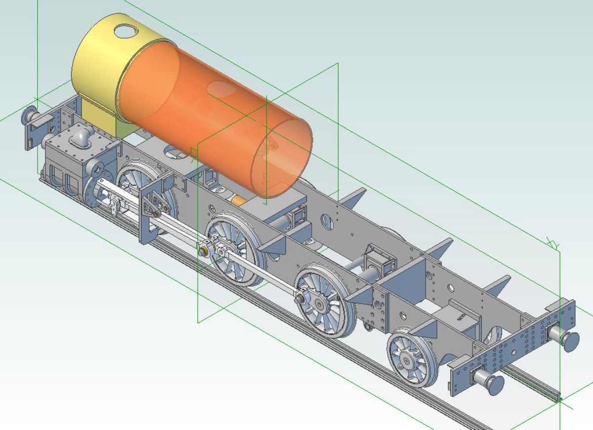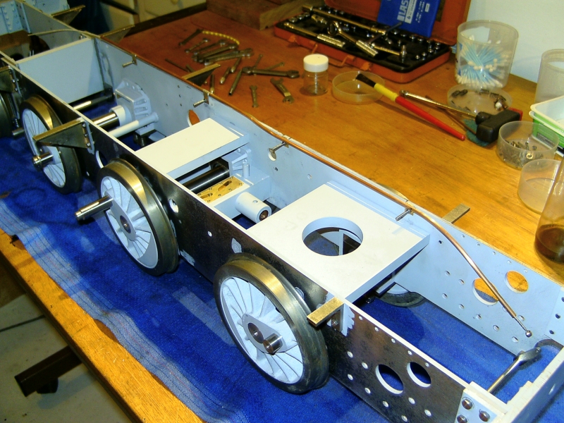 05/12/09 Not much done over the last month! I've been busy with other things such as machining the driving wheels for my brother's S15. I've made up the spring plates that go over the ends of the spring pins. These were a simple job from 1/16" x 3/8" mild steel strip. One was marked out and drilled and then used as a jig to drill the rest. Finally, the ends were filed round using my usual silver steel filing buttons. Spring plates The next little job was to make up some brackets to support the running boards along their length. I'll be fixing some angles to the top of the motion brackets to fix the running boards to the top of these but there are large gaps inbetween those and the buffer beams. On Helen I used plain bits of angle bolted to the frames but for 'Simply' I decided to make up some proper brackets where they will be seen. These were fabrications utilising a length of 1/4" x 1/16" steel strip bent at right angles and silver soldered to a triangular piece of 1/16" steel sheet. The rough brackets were then cleaned up, milled on the edges to true them up and drilled for the bolts to fasten them to the frames. Two of the brackets which fit just behind the cylinders are just bits of angle as space is a bit tight here. Rough brackets after soldering Finished brackets after machining You may have noticed that I'm finding other little jobs to do rather than start on the coupling rods! Actually, I want to get all the holes drilled in the frames so that I can get those finished and painted. Wth this in mind I've been trying to work out which holes still need to be drilled. I've decided to fit brakes to the driving and trailing axles (there is not room to fit them on the leading axle - the hangers would foul the rear cylinder covers) so I've had to draw out all the operating gear for that. This requires holes for the brake hangers and brackets for the brake column and operating shaft etc. I've also drilled a couple of holes in the rear of the frames so that the injector feeds and water supply can pass through the frames rather than have to go underneath. I suppose I will need some sort of operating gear for cylinder drain cocks which will need mounting holes as well ! Inbetween all this I've been working on the design for the balanced slide valves and I think I've finally arrived at a design I can live with and won't be too difficult to machine. The exhaust will pass through the valve and out of the top of the steam chest and enter the smokebox through the side of the saddle. I'm also working on the design for a Lempor type exhaust which will fit nicely into the space available and using the tall chimney of the Simplex. One day I will build something straight from a set of plans without having to design everything as I go along! At the moment I'm working on filling in all the 'spare' holes and screw heads in the frames of which there are quite a few! Once that's done the frames can be painted and wheels etc. fitted once and for all (hopefully!). 24/01/2010 Well, another year's gone by! I don't seem to have done much over the last month or so as I've been bitting and bobbing with various other jobs. I have done a few bits on Simply though since the last update. The running board brackets have been fitted and the brakeshaft made and fitted. This runs in PEEK bearings on 2 little brackets bolted to the bottom of the frames just behind where the ashpan will be. Brakeshaft made and fitted with 2 brackets I've also worked out the operating gear for the cylinder drain cocks. There is just room at the bottom of the frames in front of the cylinders to squeeze in a couple of bushes to take a cross shaft to operate the cocks. Rather than a complicated linkage from the operating lever in the cab to the shaft, I'm using a bowden cable running in a length of 1/8" diameter copper tube. The cable will be an old bottom E string off a guitar (I've got plenty of those!) which has a nice brass ferrule already fitted to connect it to the operating arm on the cross shaft. Cross shaft for operating drain cocks Copper tube containing bowden cable The cylinder drain cocks will be the sort designed by Don Young which use a spring loaded ball rather than a taper plug. I had a look at the cylinders before Xmas and measured them up to check the machining that had already been carried out when I got them. The bores are spot on size and seem to be parallel but the finish is very poor. Rather than try reboring them slightly larger I'm going to get one of the expanding cylinder hones and see if I can clean the bores up with that. They should only need a few thou taking off. One thing I did find wrong was that the bores are the wrong distance from the port face. One is 0.020" too high and the other is 0.020" too low! This makes a difference between the two of 0.040" which is too much to ignore so I'm going to have to machine 0.040" from one port face to make the two blocks the same. Bit of a pain but leaving them as they are would mean the distance between the cylinder centreline and the valve spindle would be different for the two sides leading to other complications. Cylinder castings - You can see the difference in the bore positions! Anyway, I'm going back to the Kingette for a bit as I really should get that finished, so for the time being updates here will be few and far between! 21/07/12 Wow! Is it really 2 ½ years since I did anything on this project! I haven't done any more construction work but have been looking at the boiler again. I've decided that the design I came up with in the beginning doesn't have enough tube area for the enlarged grate area. The tube area is only about 10% which I don't think is enough so I'm now looking at either increasing the number of tubes or increasing the diameter to give at least 13% to improve the 'breathing'. Both methods are difficult with the existing boiler design and I may have to change to a Belpaire design rather than a round top so that I can increase the size of the f